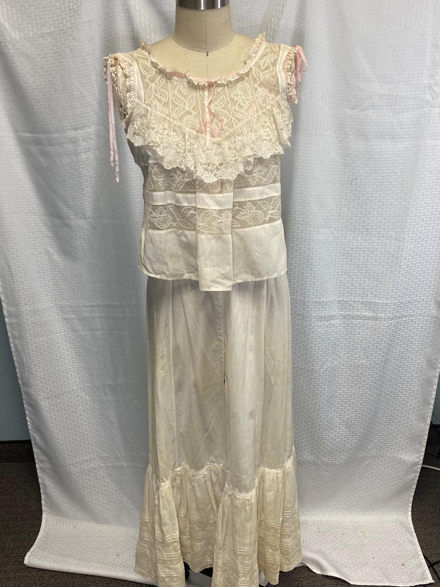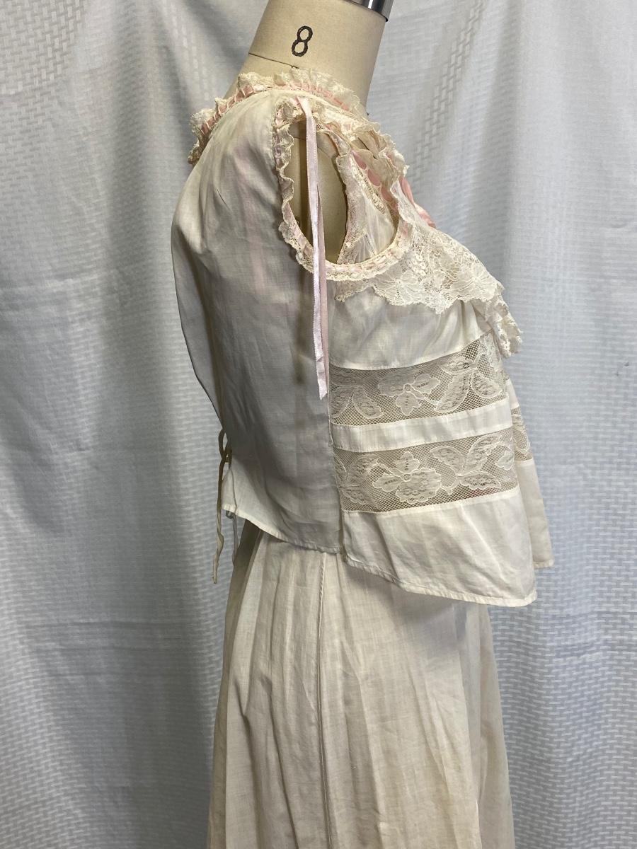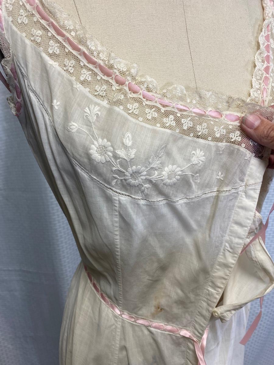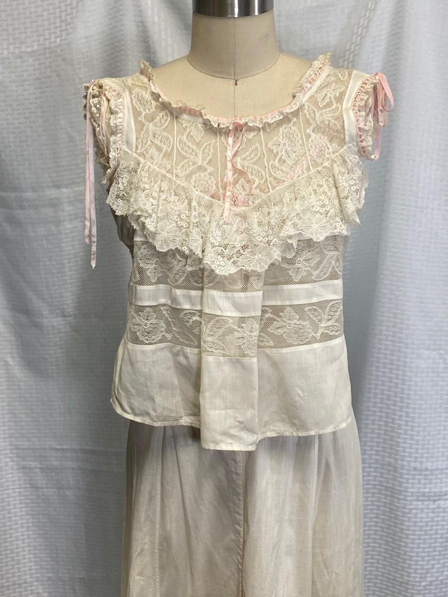 Antique Victorian White Cotton Lace Two Piece Undergarment Tea Dress w Blouse Sleeveless. White cotton lace with pink ribbon trim. Light discolor as expected with age, no holes found. Can be worn separate. Dainty floral embroidery. Roughly a size 8.