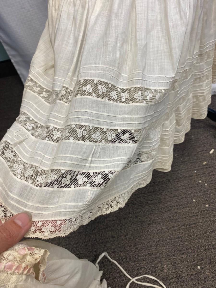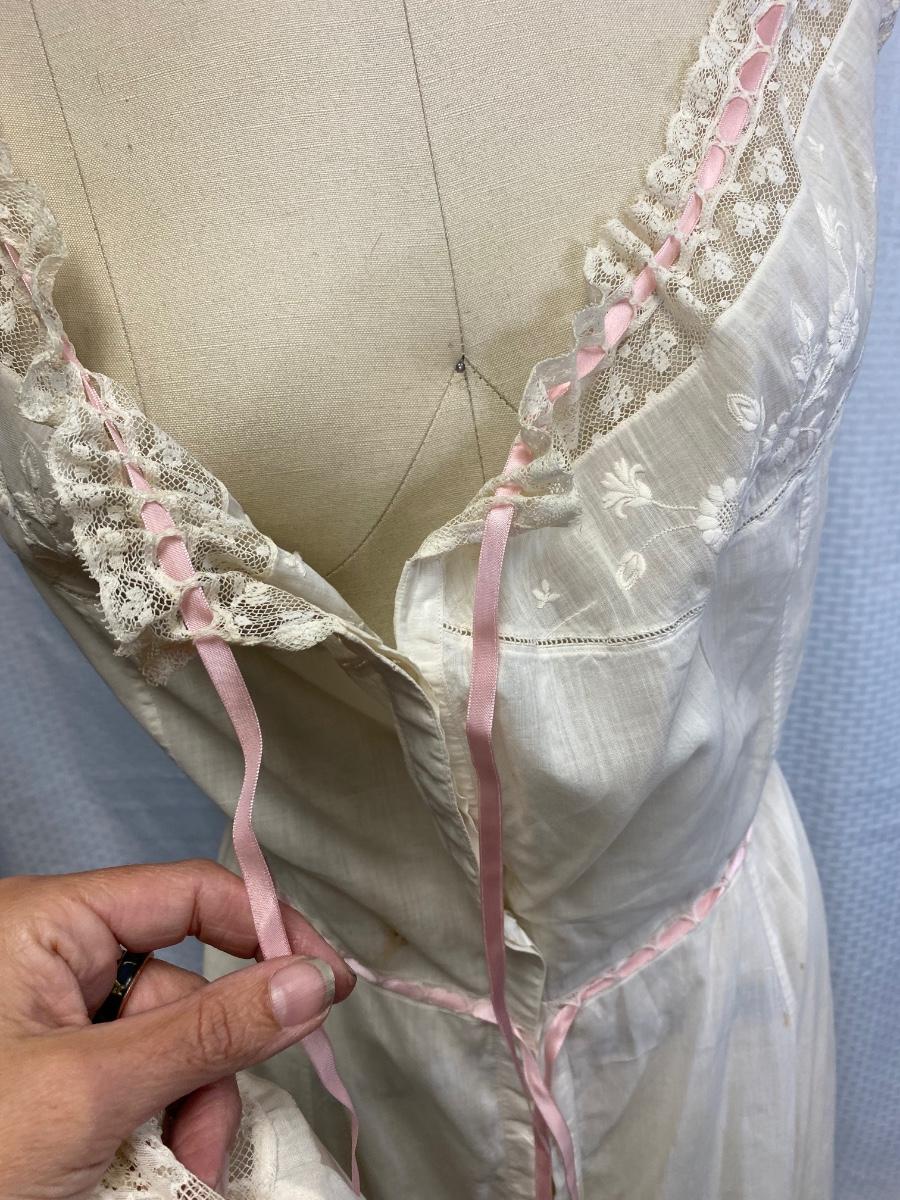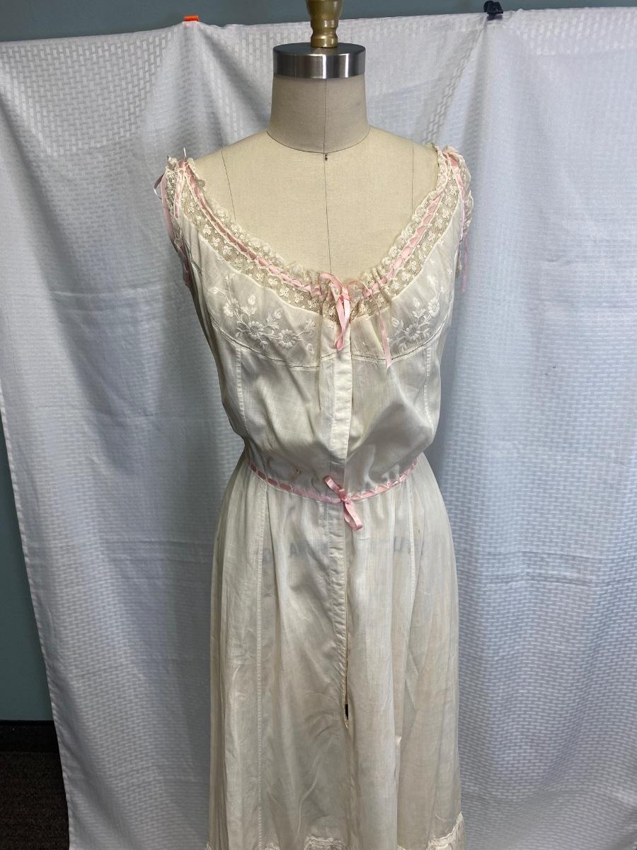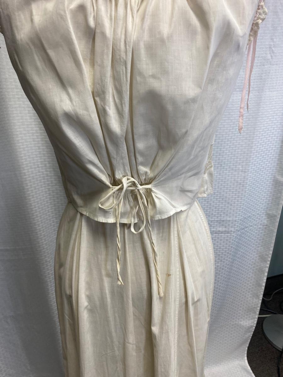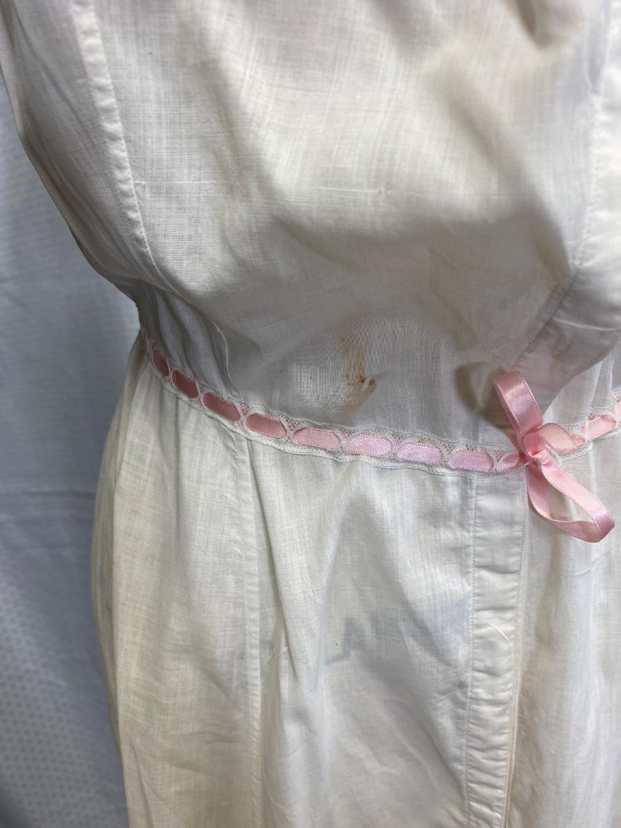 Antique Victorian White Cotton Lace Two Piece Undergarment Tea Dress w Blouse Sleeveless. White cotton lace with pink ribbon trim. Light discolor as expected with age, no holes found. Can be worn separate. Dainty floral embroidery. Roughly a size 8.