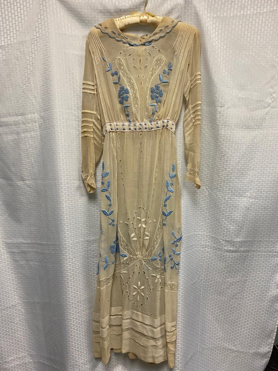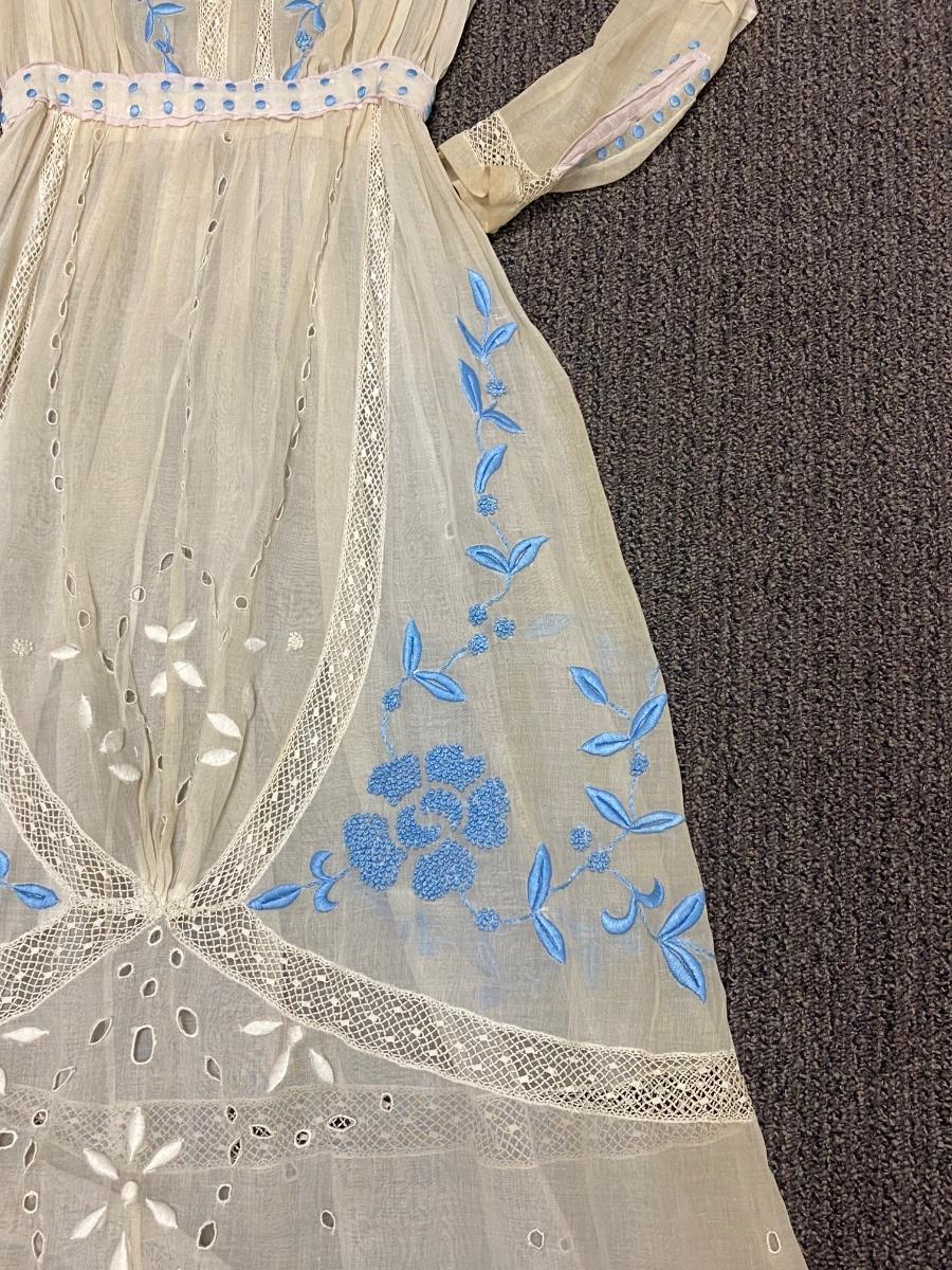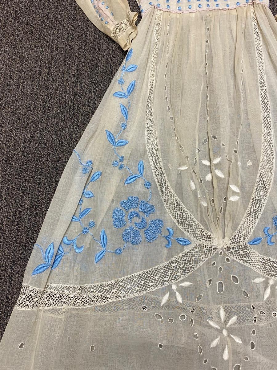 Antique Victorian White with Blue Embroidery Gunne Sax Style Long Sleeve BOHO Dress