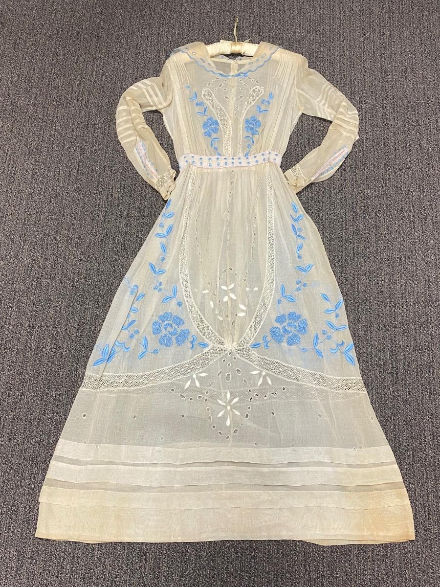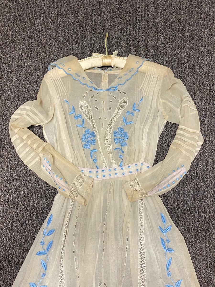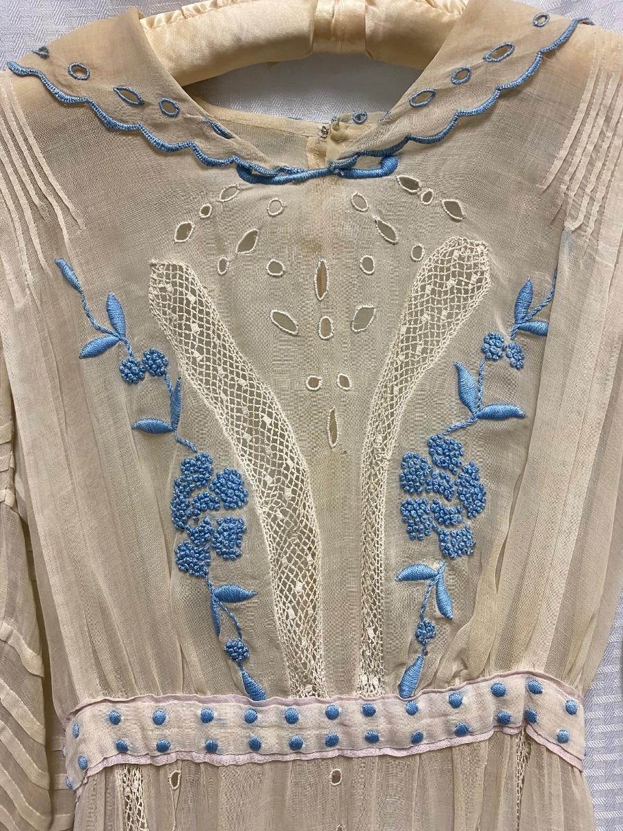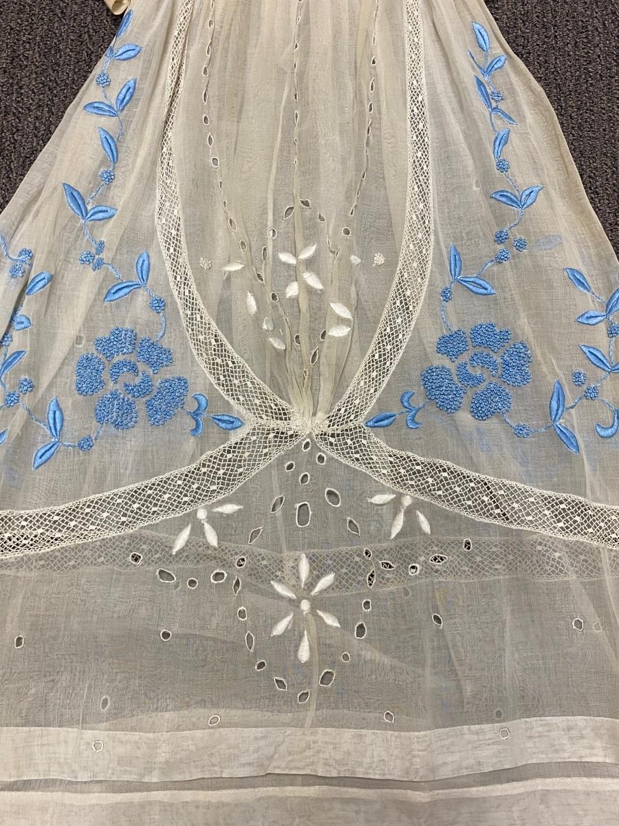 Antique Victorian White with Blue Embroidery Gunne Sax Style Long Sleeve BOHO Dress