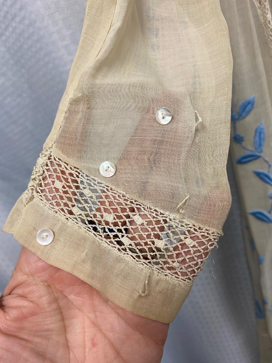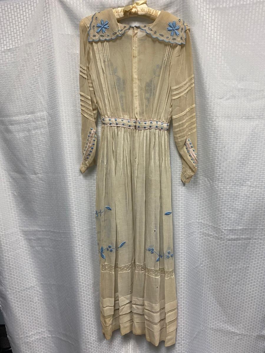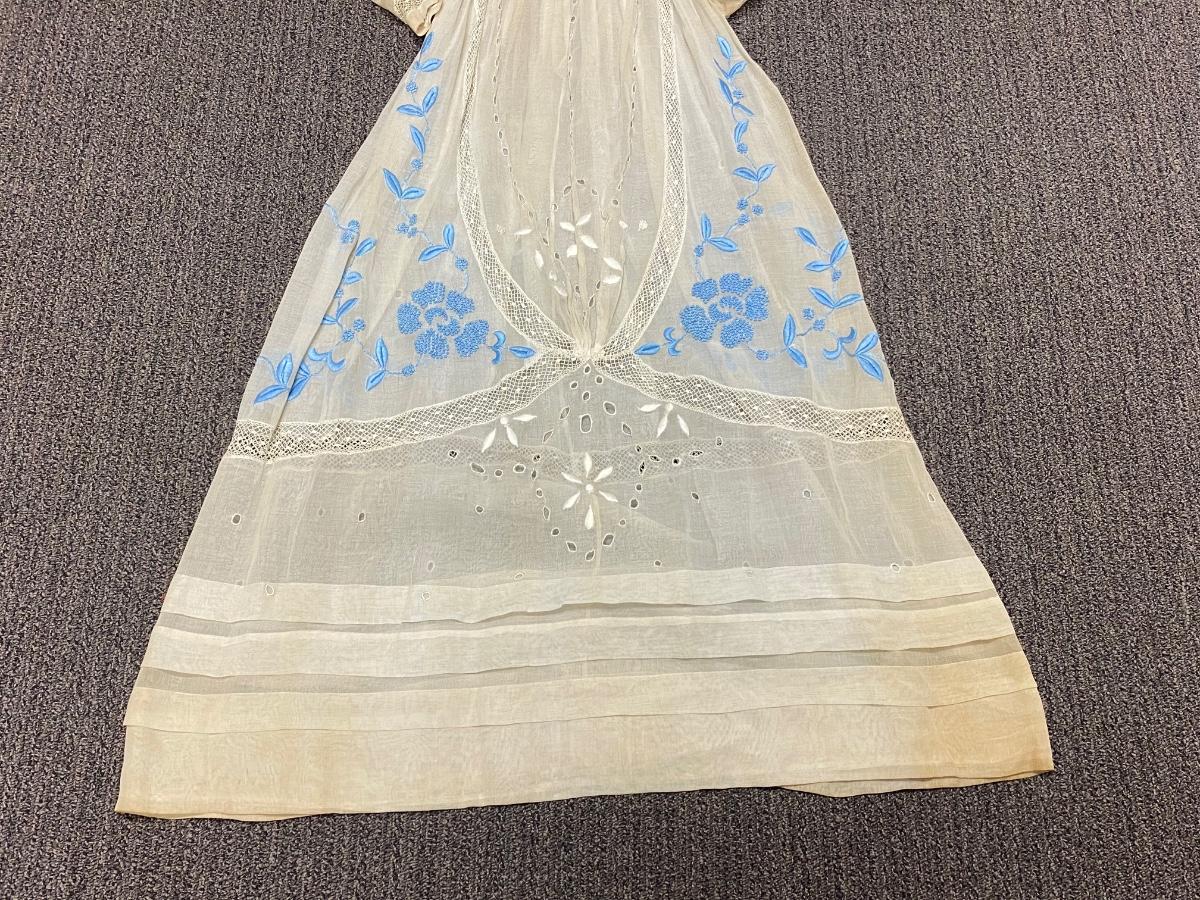 Antique Victorian White with Blue Embroidery Gunne Sax Style Long Sleeve BOHO Dress. Wonderful step back in time example of fashion. White cotton dress with embroidered floral design in blue and white. Long sleeve with buttons at cuff for the perfect fit. Buttons up the back. Victorian Era original garment. Passed through multi generations within same family. Previous owner was part of historical society that dressed in Victorian era garments. The dress itself is in good condition, no holes or rips. There is discolor as seen with most cotton gowns from this era. See photos. Dress measures approx. 17" armpit to armpit, 12" at waist, and 53" shoulder to hem.