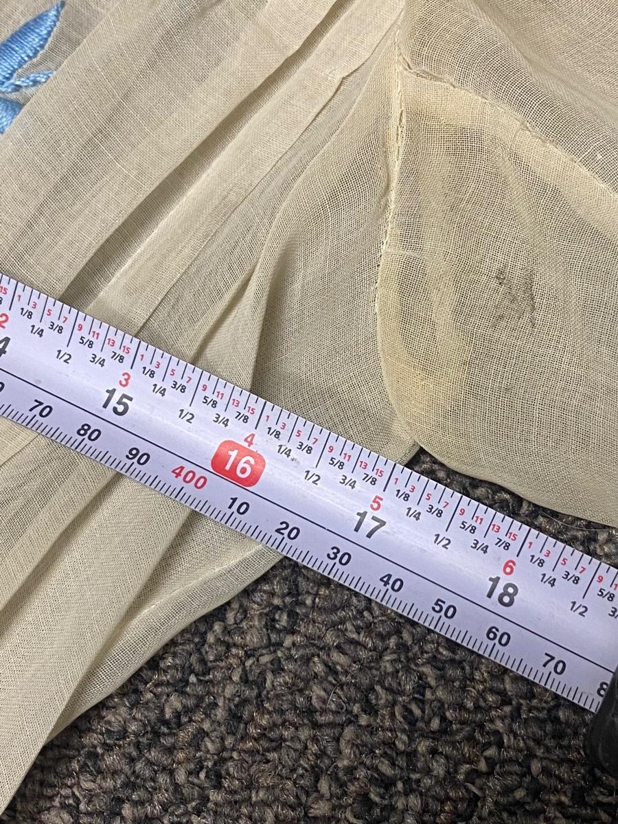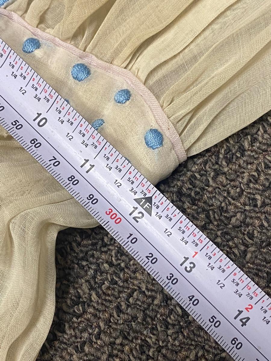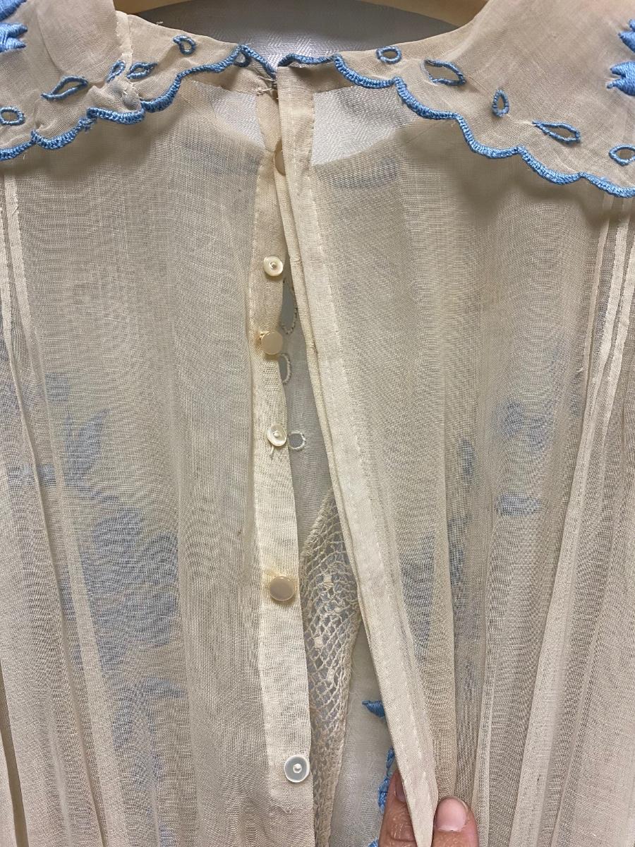 Antique Victorian White with Blue Embroidery Gunne Sax Style Long Sleeve BOHO Dress. Wonderful step back in time example of fashion. White cotton dress with embroidered floral design in blue and white. Long sleeve with buttons at cuff for the perfect fit. Buttons up the back. Victorian Era original garment. Passed through multi generations within same family. Previous owner was part of historical society that dressed in Victorian era garments. The dress itself is in good condition, no holes or rips. There is discolor as seen with most cotton gowns from this era. See photos. Dress measures approx. 17" armpit to armpit, 12" at waist, and 53" shoulder to hem.