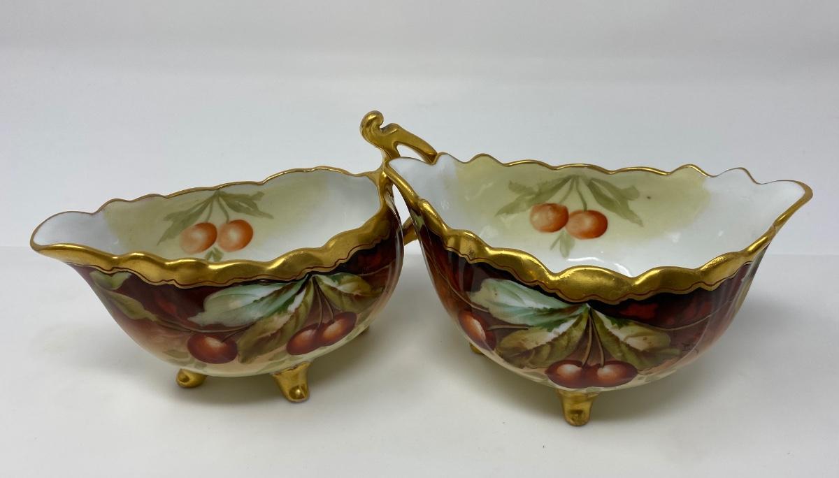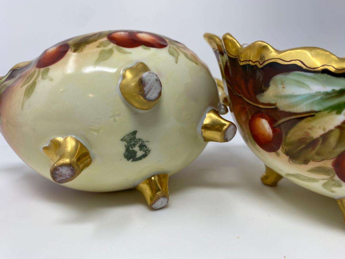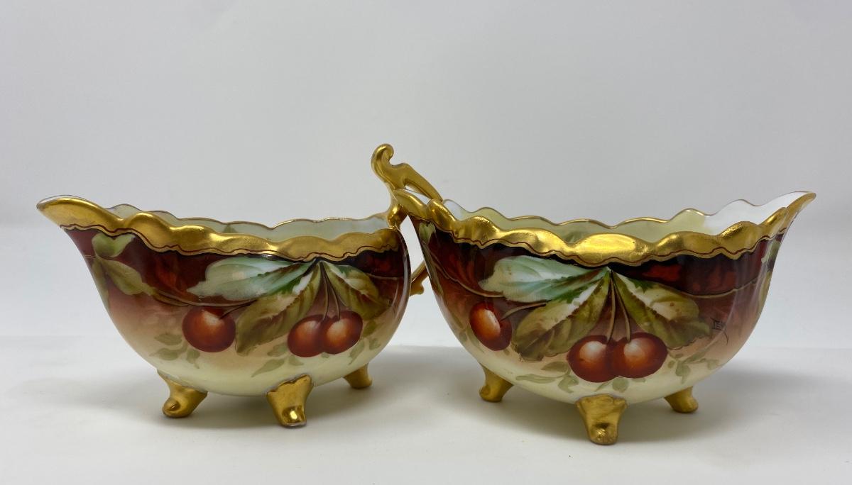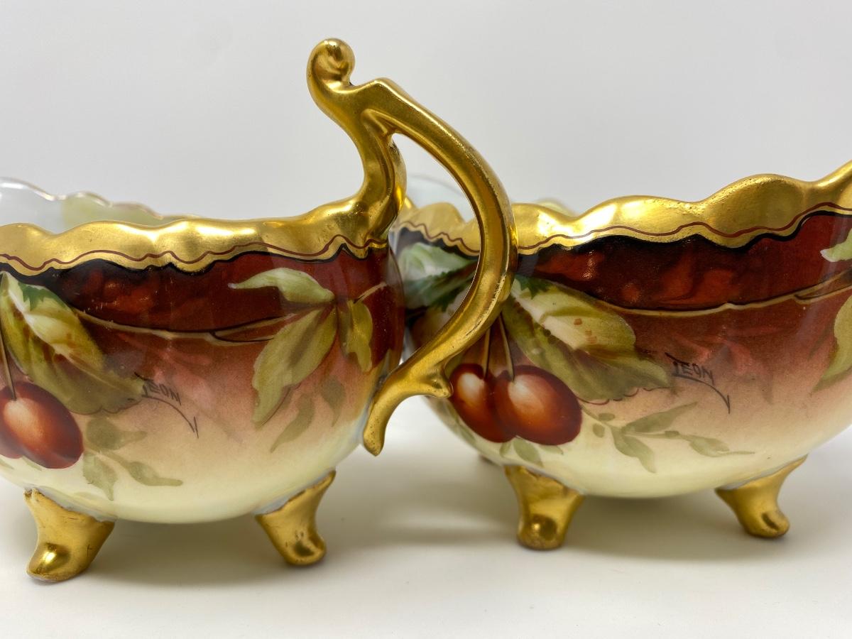 Antique Vienna Austria Hand Painted Gold Rim Cherries and Leaf Creamer and Sugar Bowl. Bowl Stamped Vienna Austria with Imprint of R T and Gold Tone Painted Gilt Feet. 5.75in L and 3in T. Creamer Stamped Vienna Austria with T K Imprint and Gold Tone Painted Gilded Feet. 6in L and 4in T