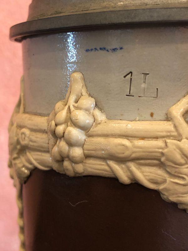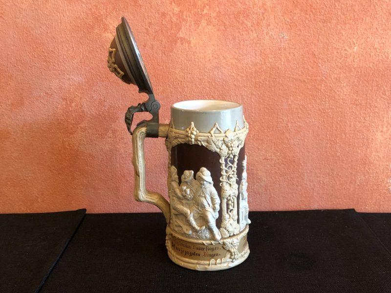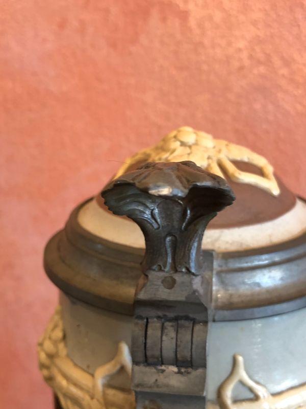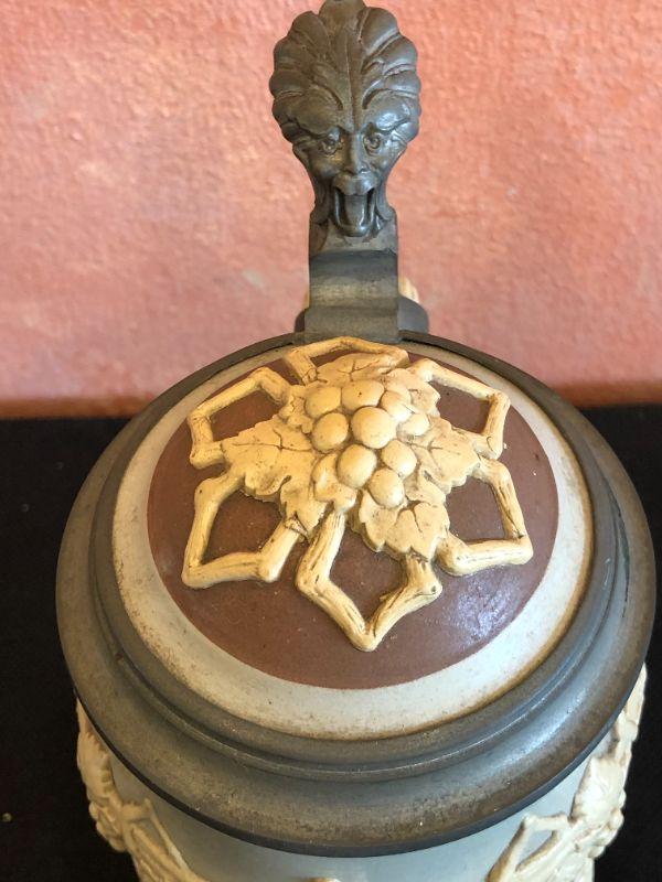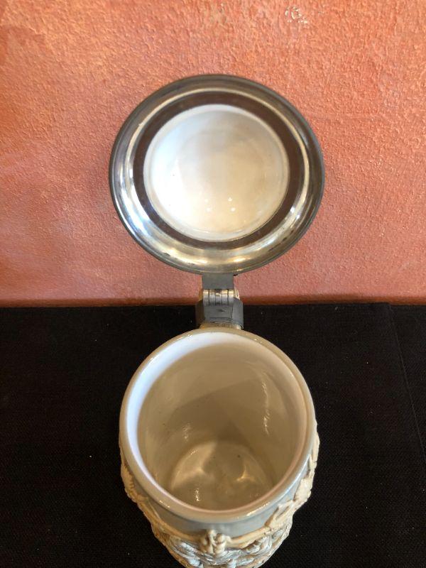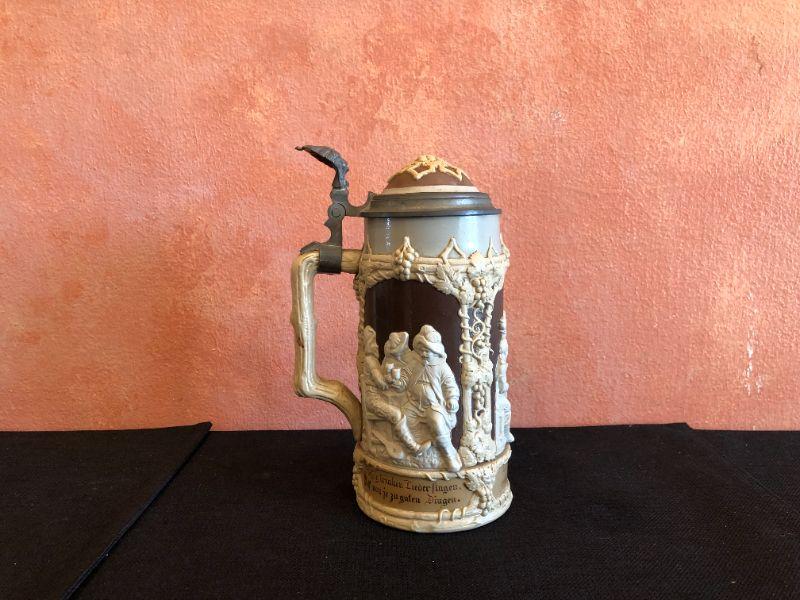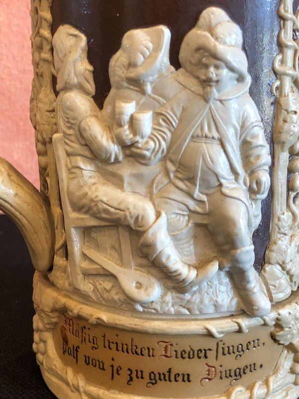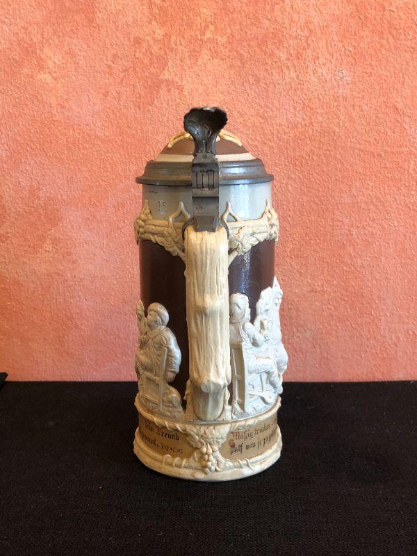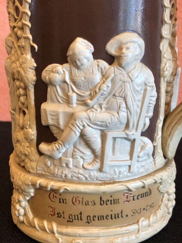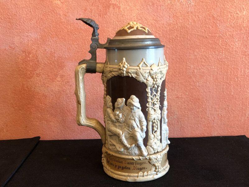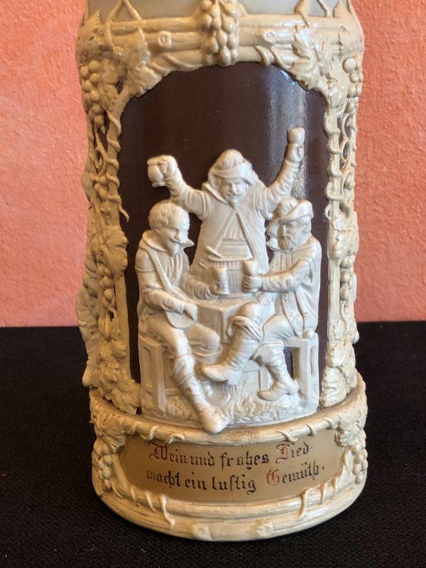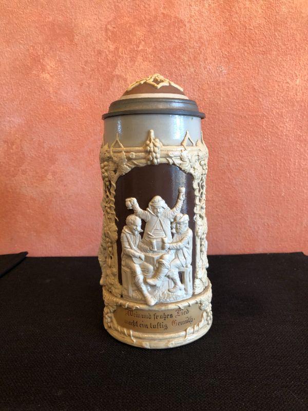Antique Villeroy & Boch lidded German beer stein, with three lively scenes of beer drinking fun with friends in the tavern. In very good condition (one small chip in the tip of the metal on the lid, shown in photo). From a San Francisco Presidio Heights family estate.