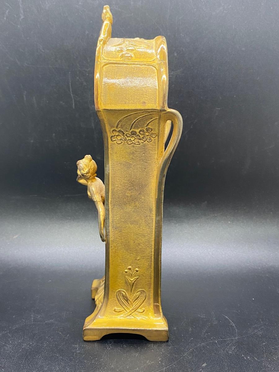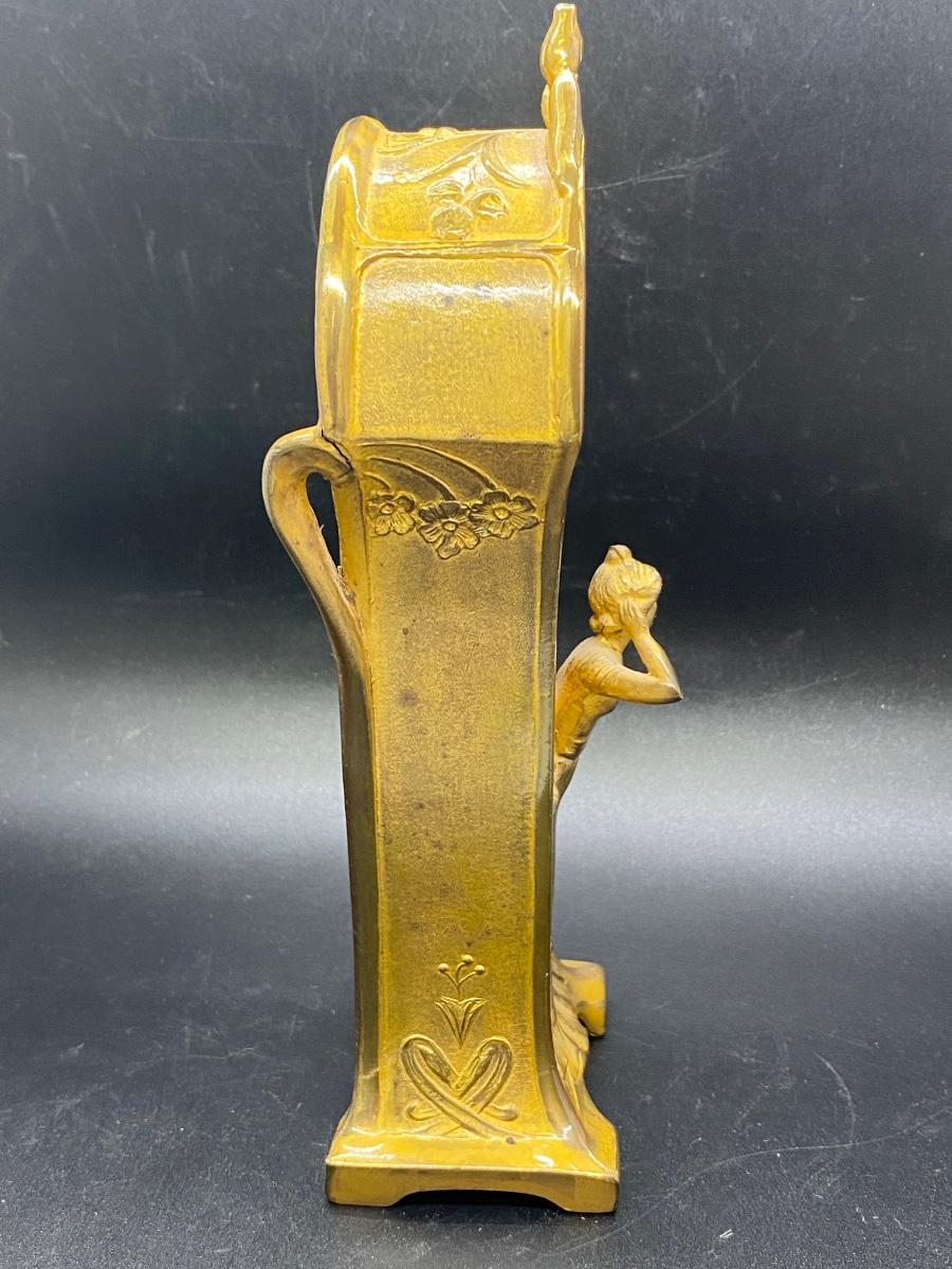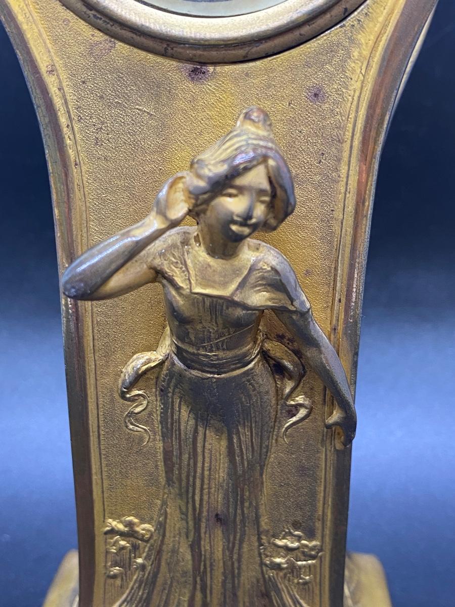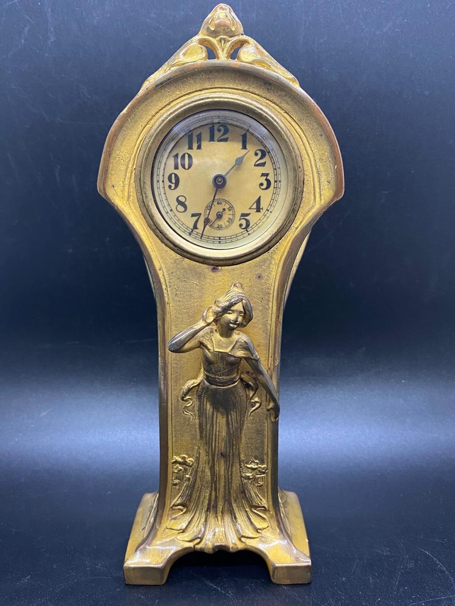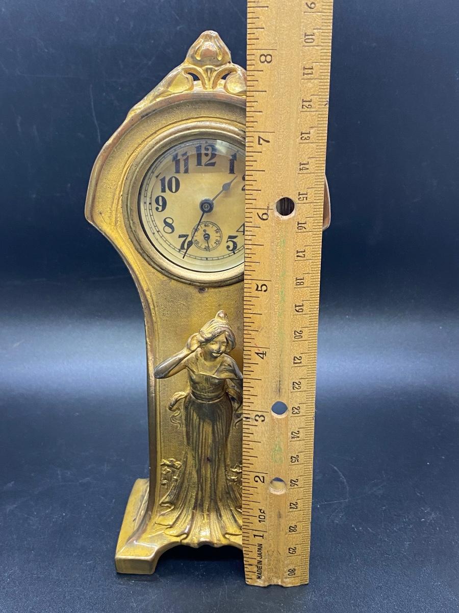 Antique Art Nouveau brass boudoir clock. Slender clock with a woman leaning out listening. Winds up and works, not sure on how accurate it keeps time. Some wear to the finish. About 8" size.