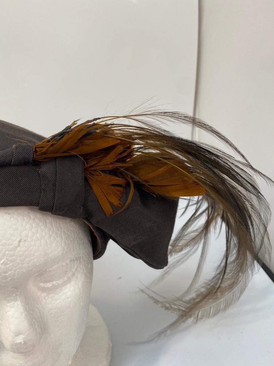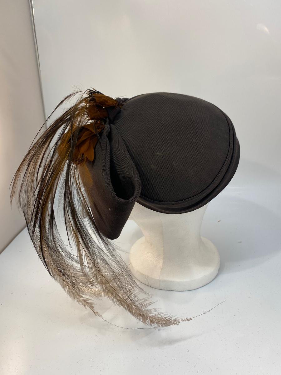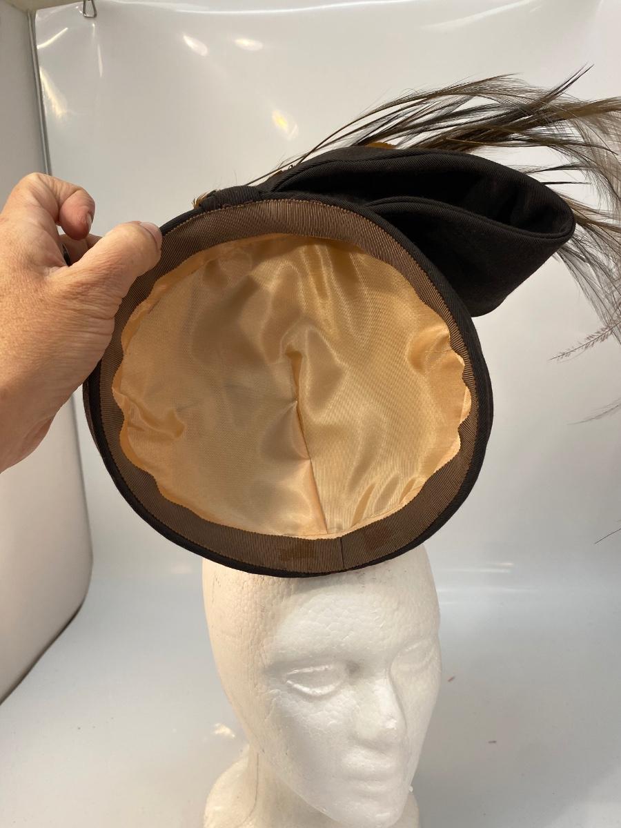 Antique Vintage Asymmetrical Dark Brown Cloche Fascinator Feathered Hat. Odd hat is heavy on the feathered side, would need to be pinned into place more than likely. In overall good wearable condition.