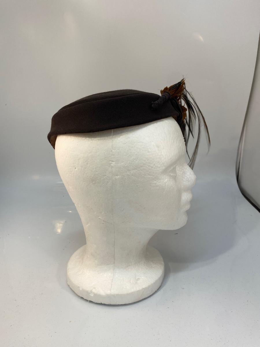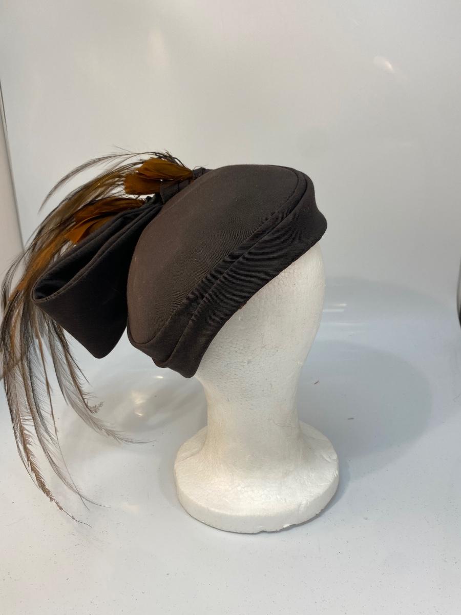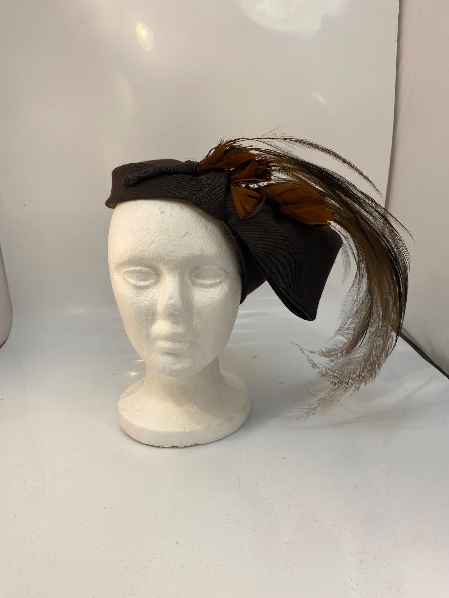 Antique Vintage Asymmetrical Dark Brown Cloche Fascinator Feathered Hat. Odd hat is heavy on the feathered side, would need to be pinned into place more than likely. In overall good wearable condition.