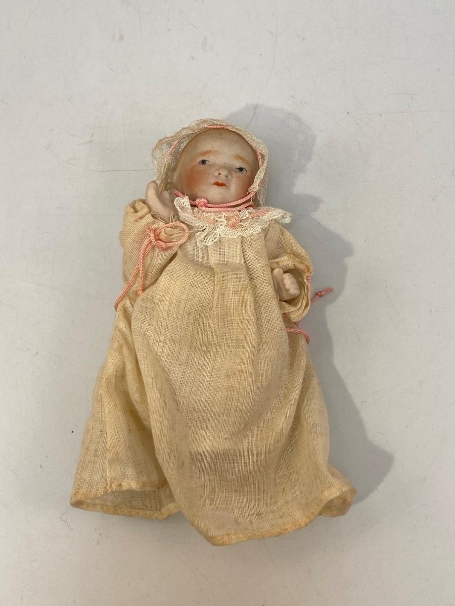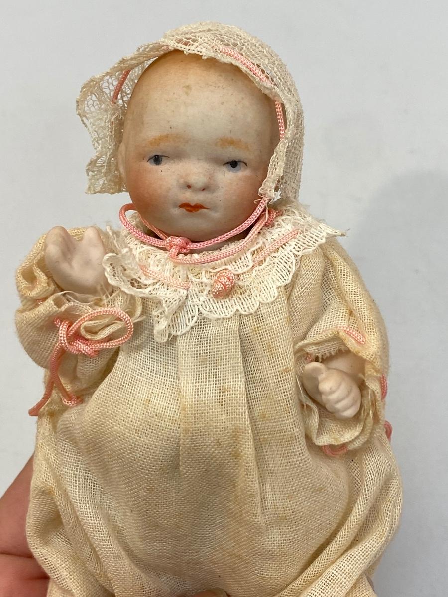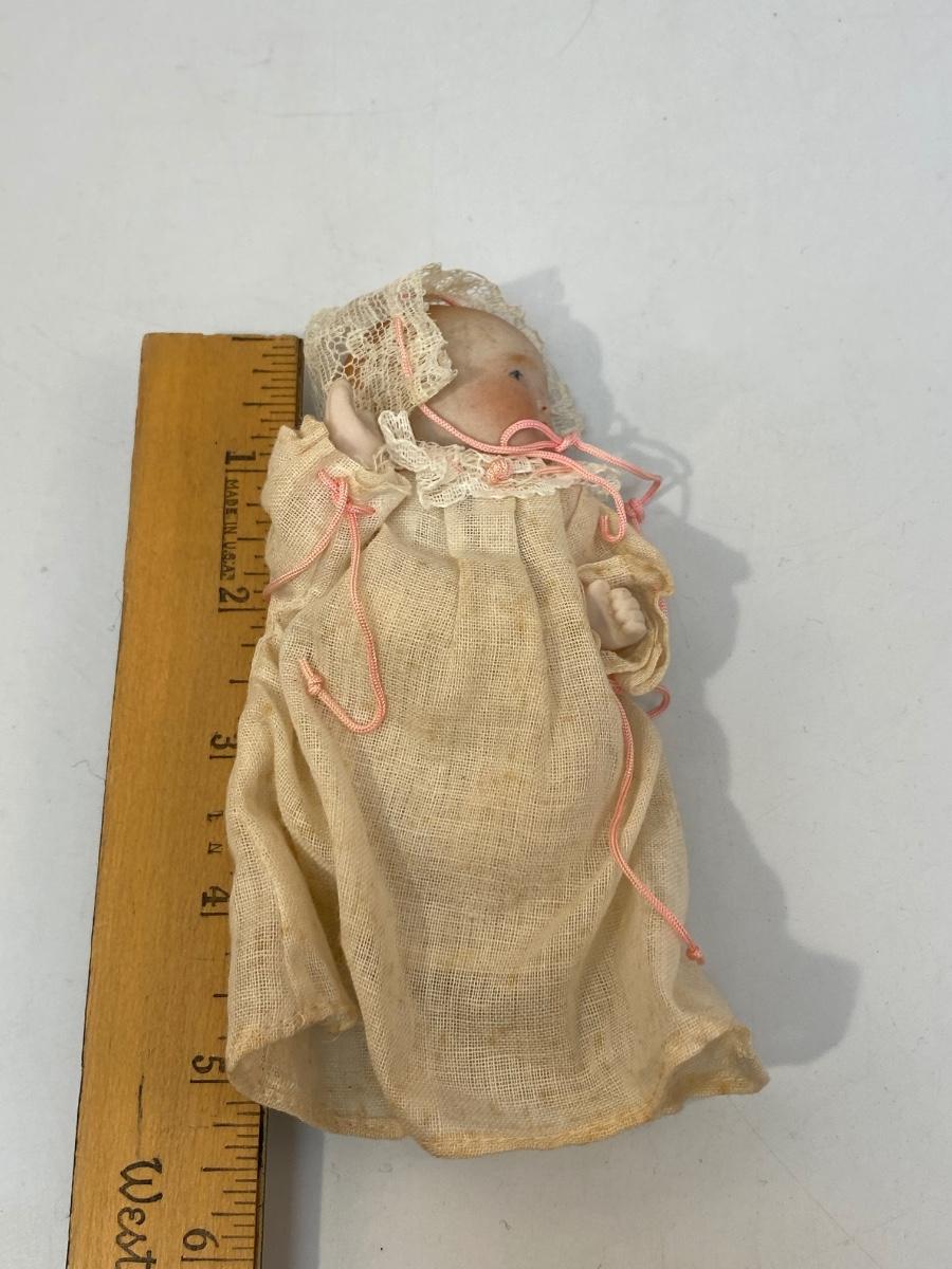 Antique Vintage Bisque Painted Face Baby Doll with Jointed Body. Small dollhouse sized doll at about 4" size. Signs of age but no chips or damage. Did not find any marks.