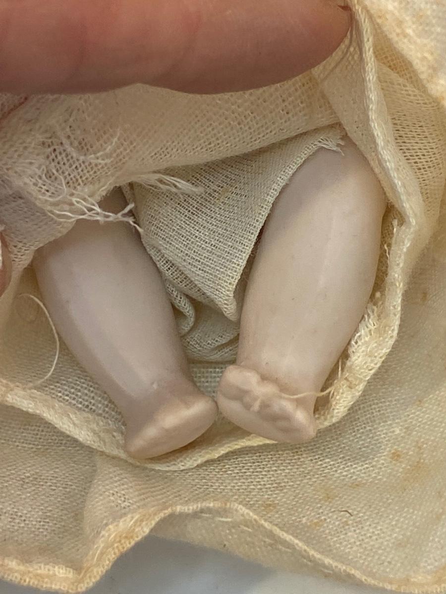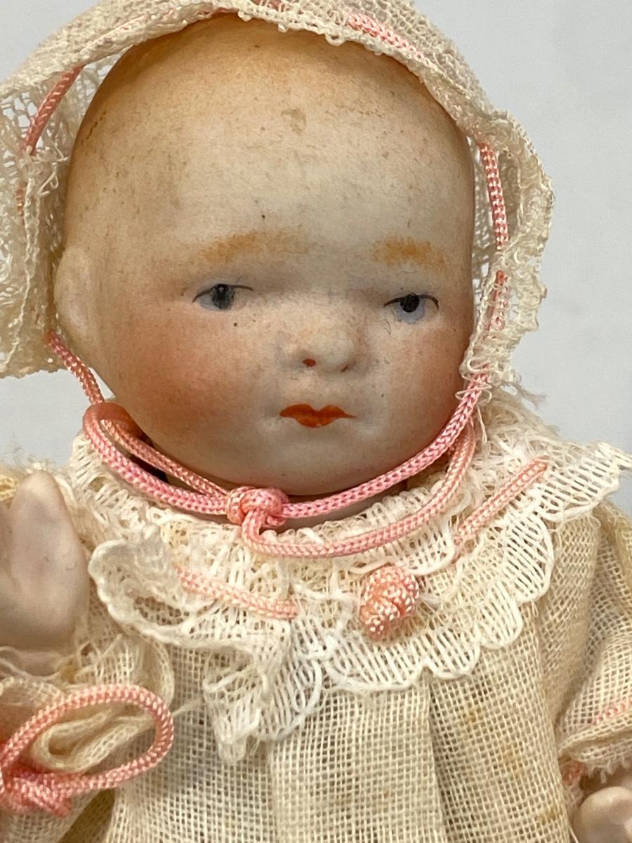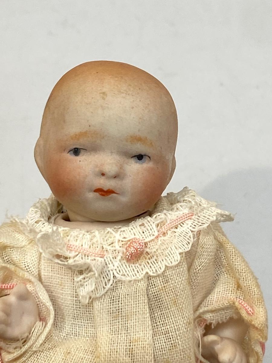Antique Vintage Bisque Painted Face Baby Doll with Jointed Body. Small dollhouse sized doll at about 4" size. Signs of age but no chips or damage. Did not find any marks.