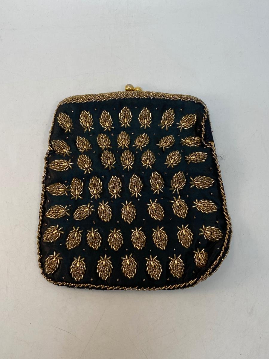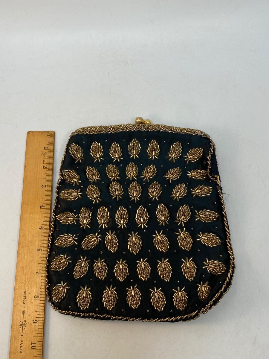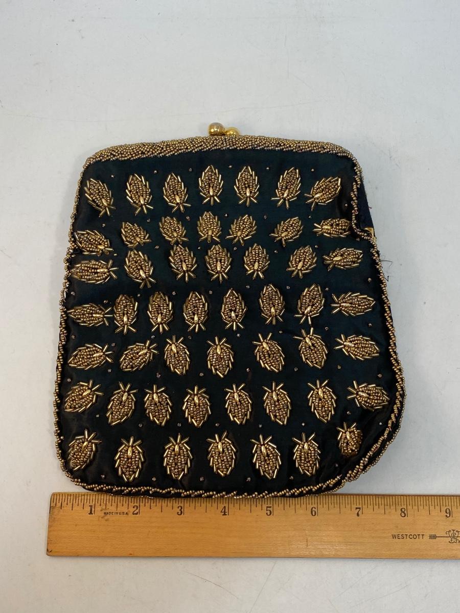 Antique Vintage Black & Gold Micro Beaded Pineapple Pattern Fold Over Clutch Purse. Hand beaded design. Fold over clutch with single small pocket inside. In good condition.