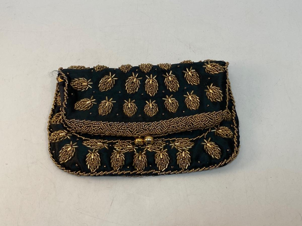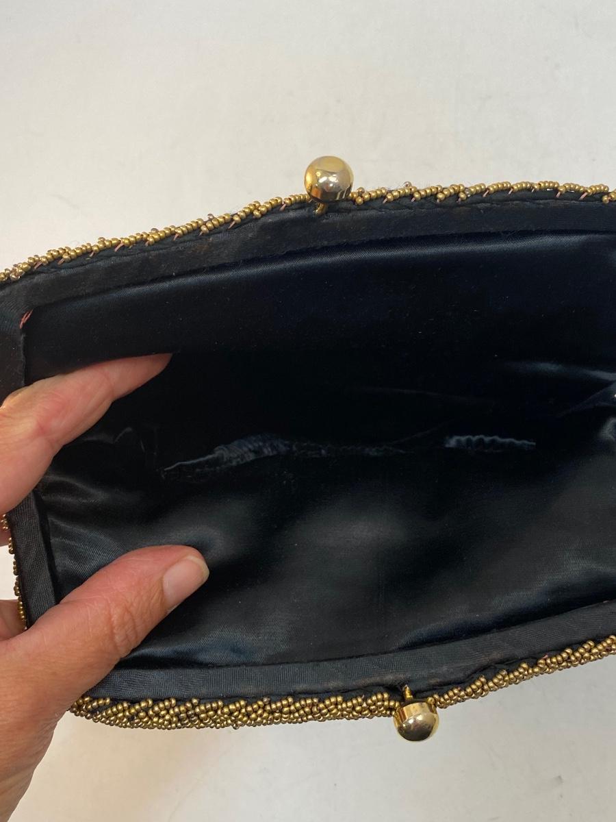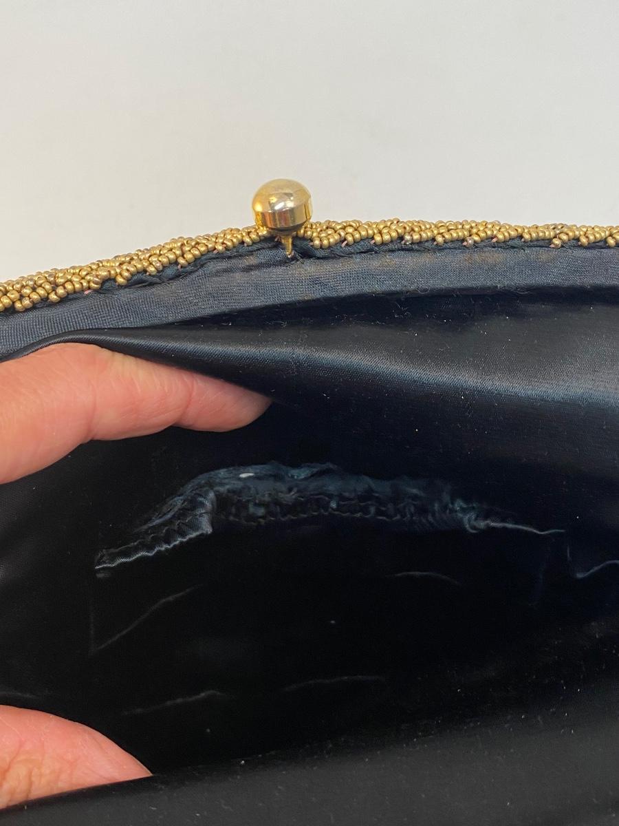 Antique Vintage Black & Gold Micro Beaded Pineapple Pattern Fold Over Clutch Purse. Hand beaded design. Fold over clutch with single small pocket inside. In good condition.
