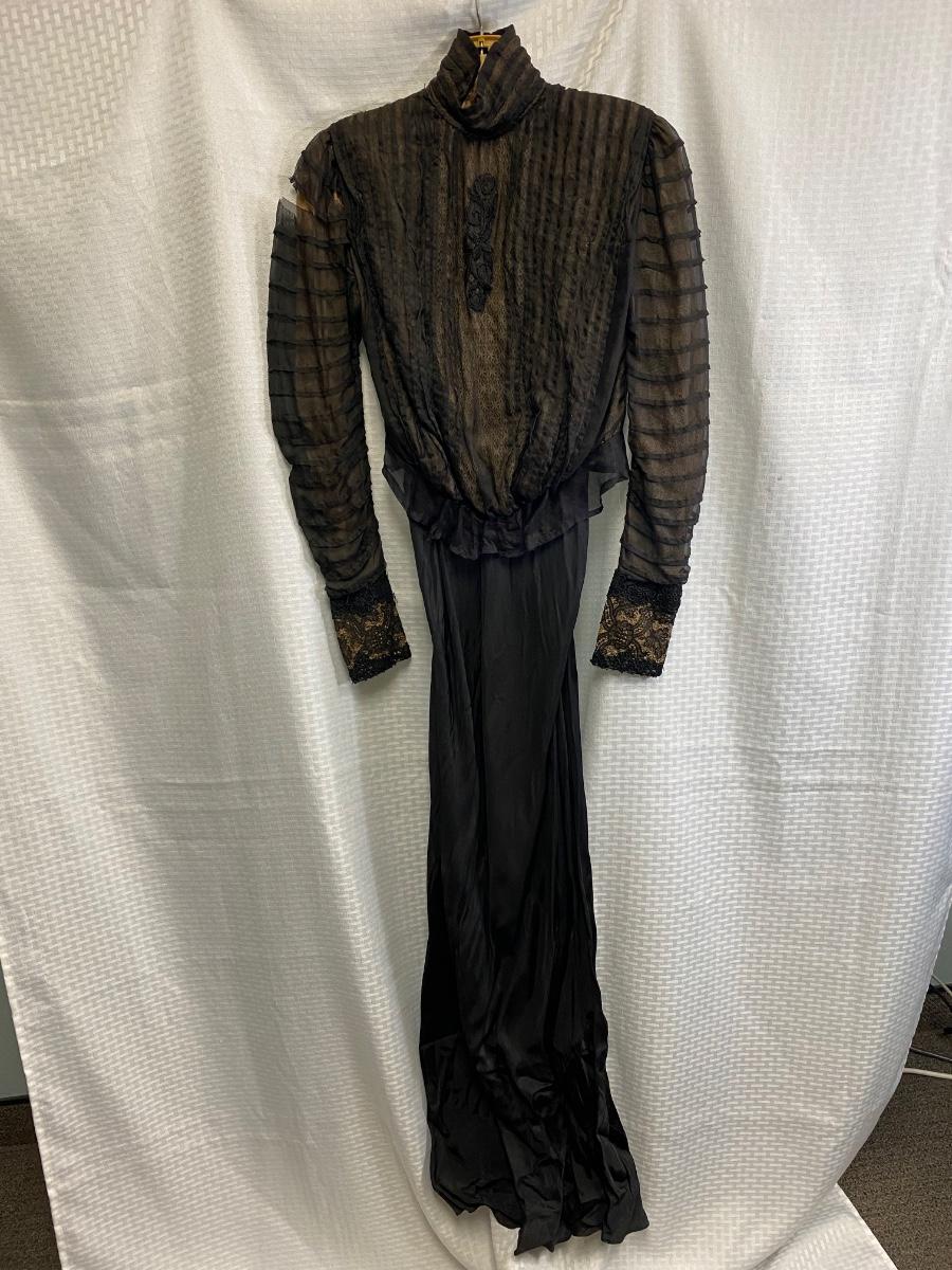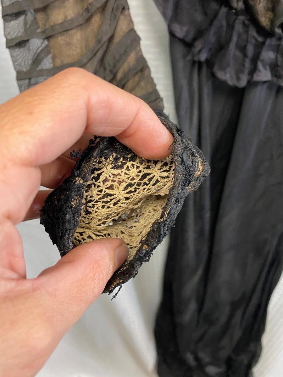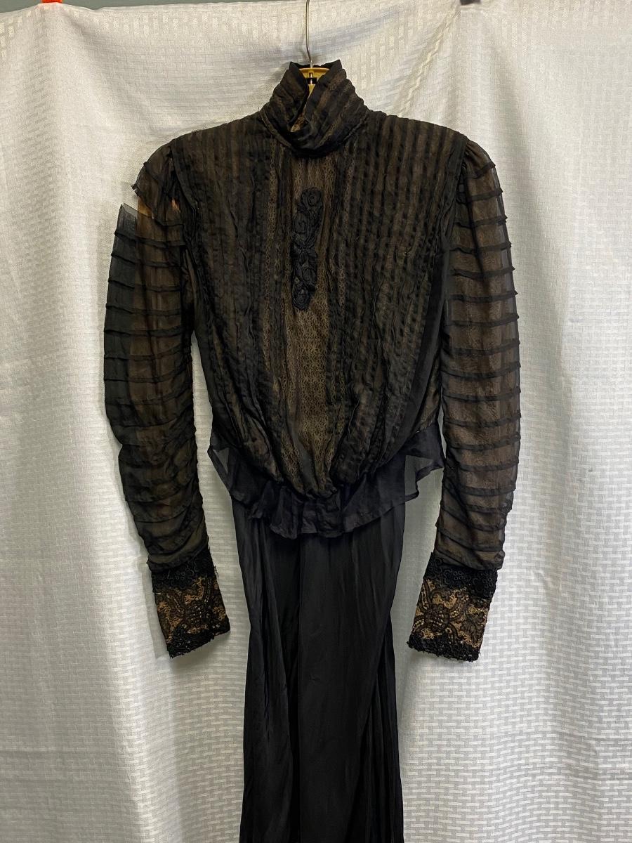 Antique Vintage Black Victorian Mourning Blouse with Slip Gothic Boho Romance. Fragile black sheer cotton. Has a white lace underneath. Absolutely stunning despite the damage. There is a hole in the right shoulder, may be fixable but fabric is delicate. The black full-length slip is aged and does have some holes. Part of a large Victorian era clothing consignment we are currently auctioning. Measurements in photos.