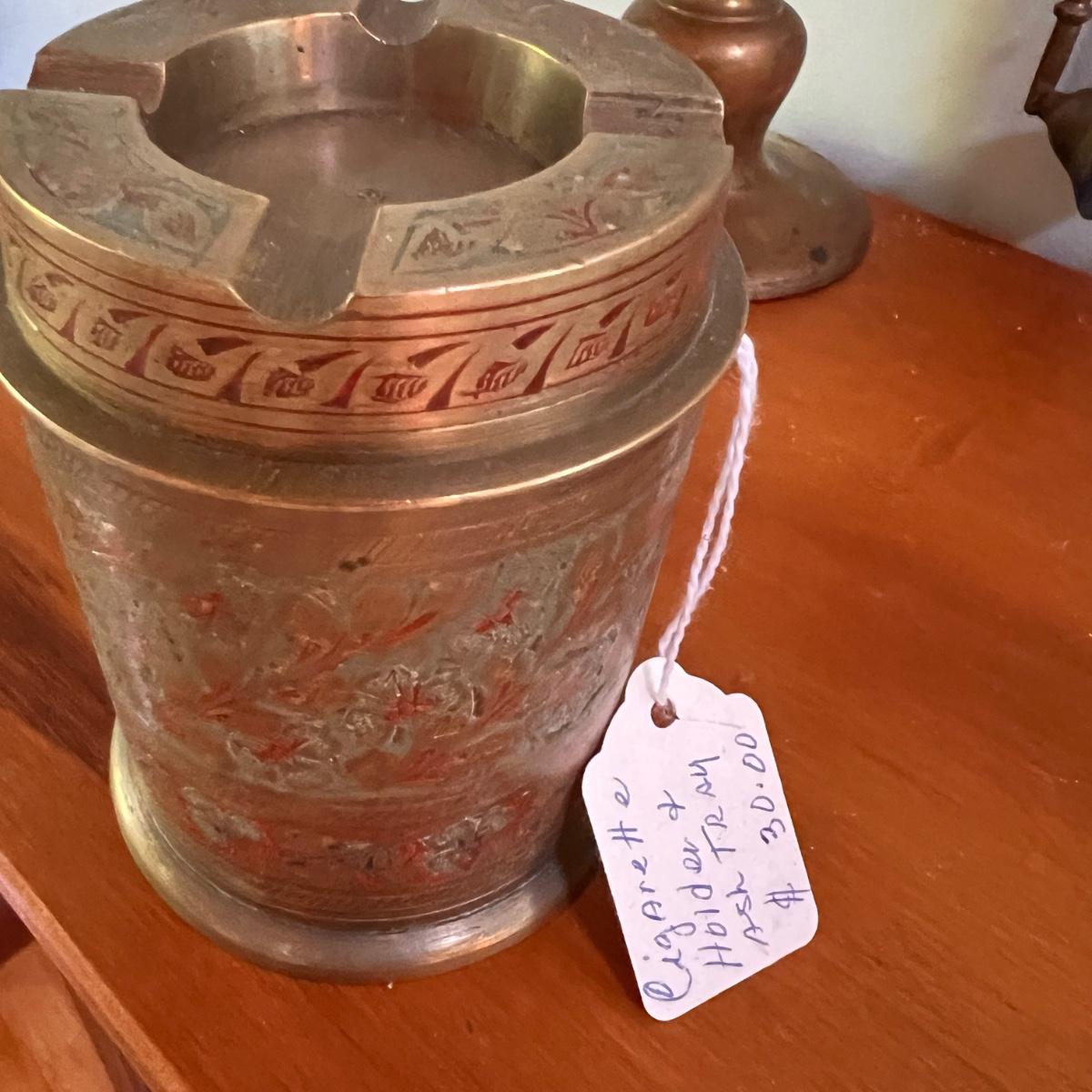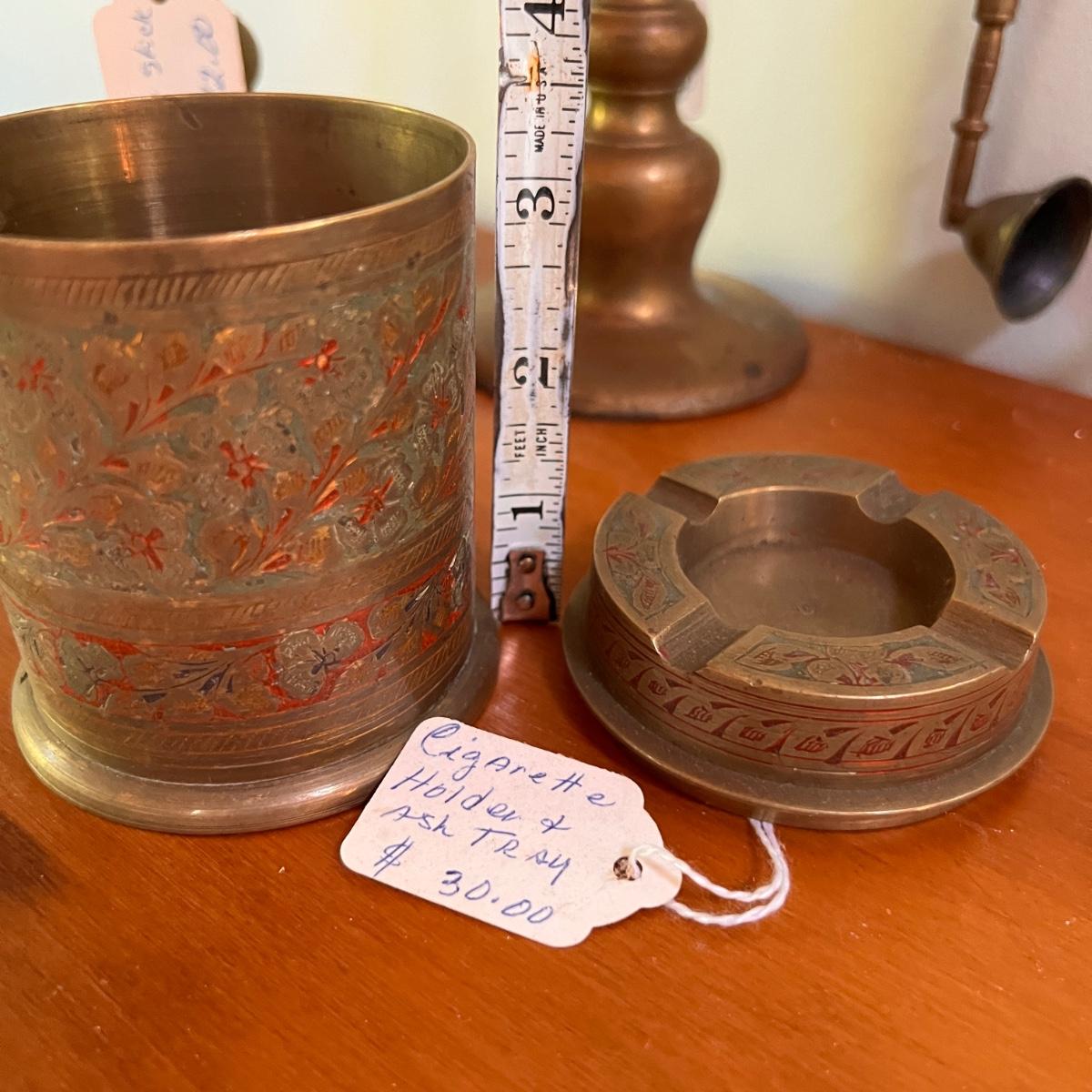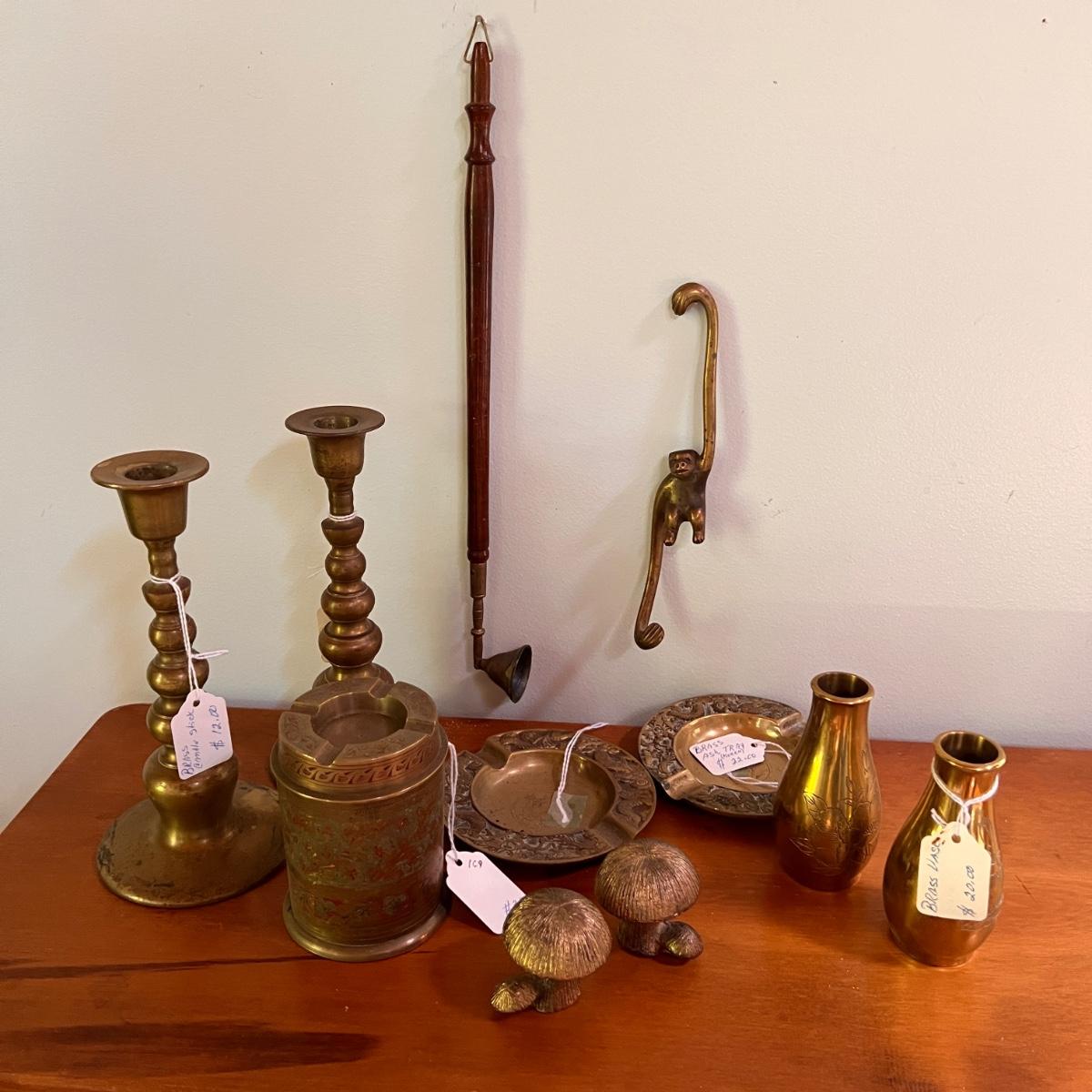 Hanging monkey hood, candlestick holders, mushroom figurines, Korean ashtrays, cigarette holder and ashtray fitted canister, 2 small brass vases, brass and wood snuffer.