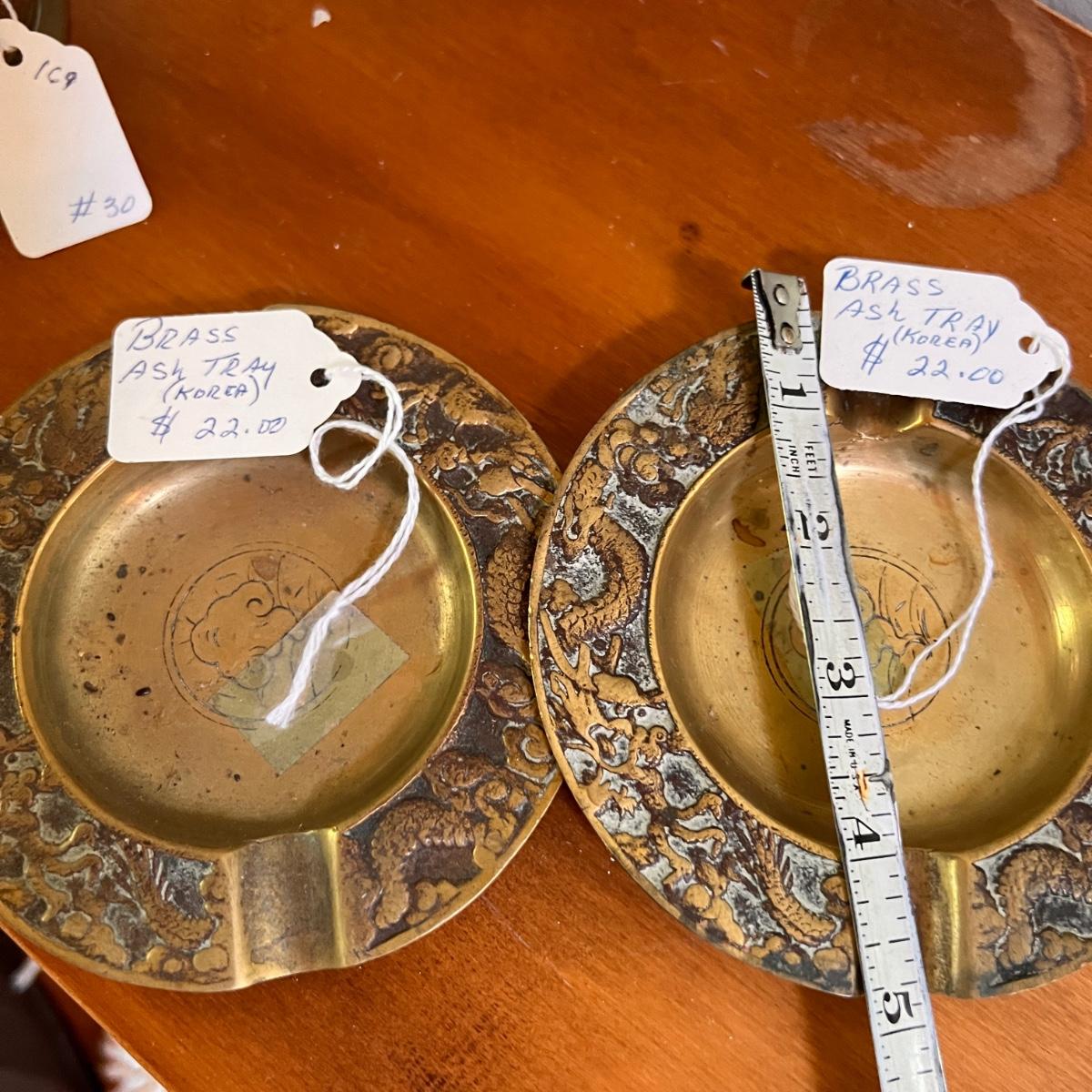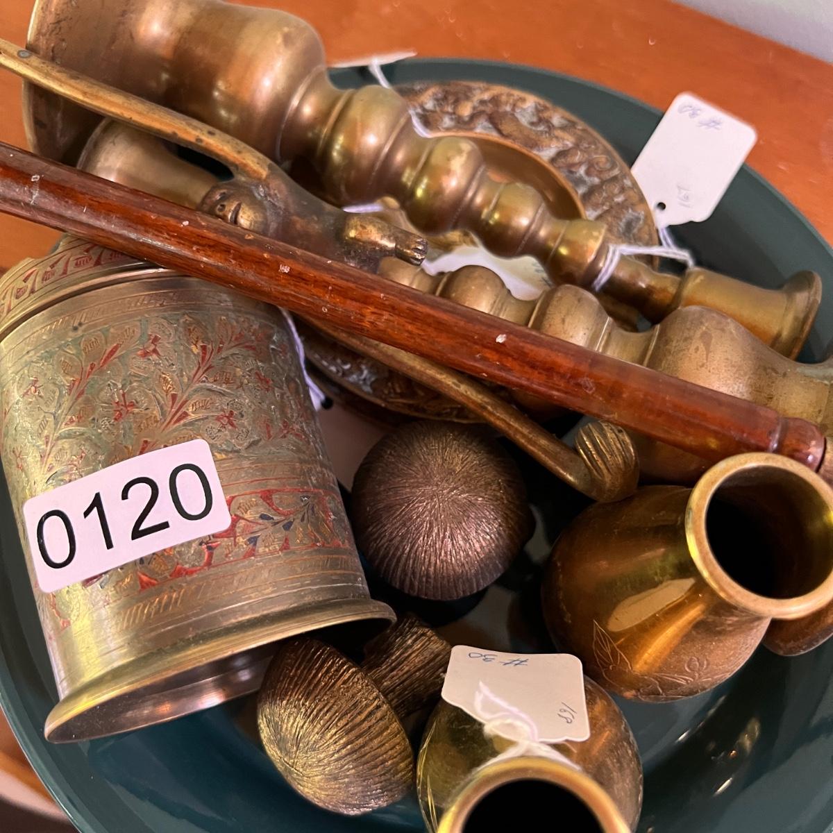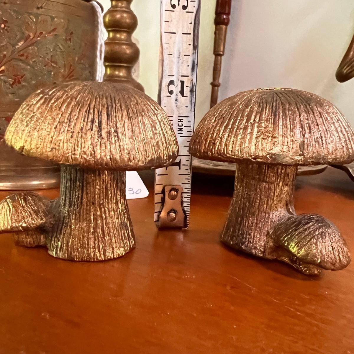 Hanging monkey hood, candlestick holders, mushroom figurines, Korean ashtrays, cigarette holder and ashtray fitted canister, 2 small brass vases, brass and wood snuffer.