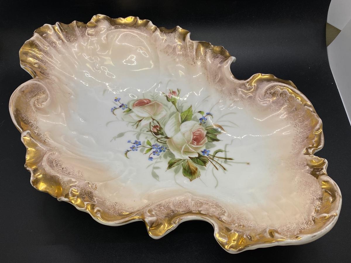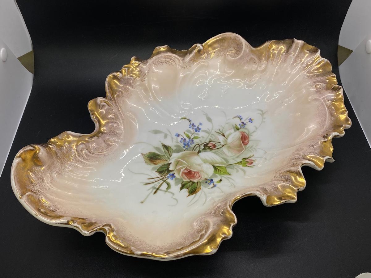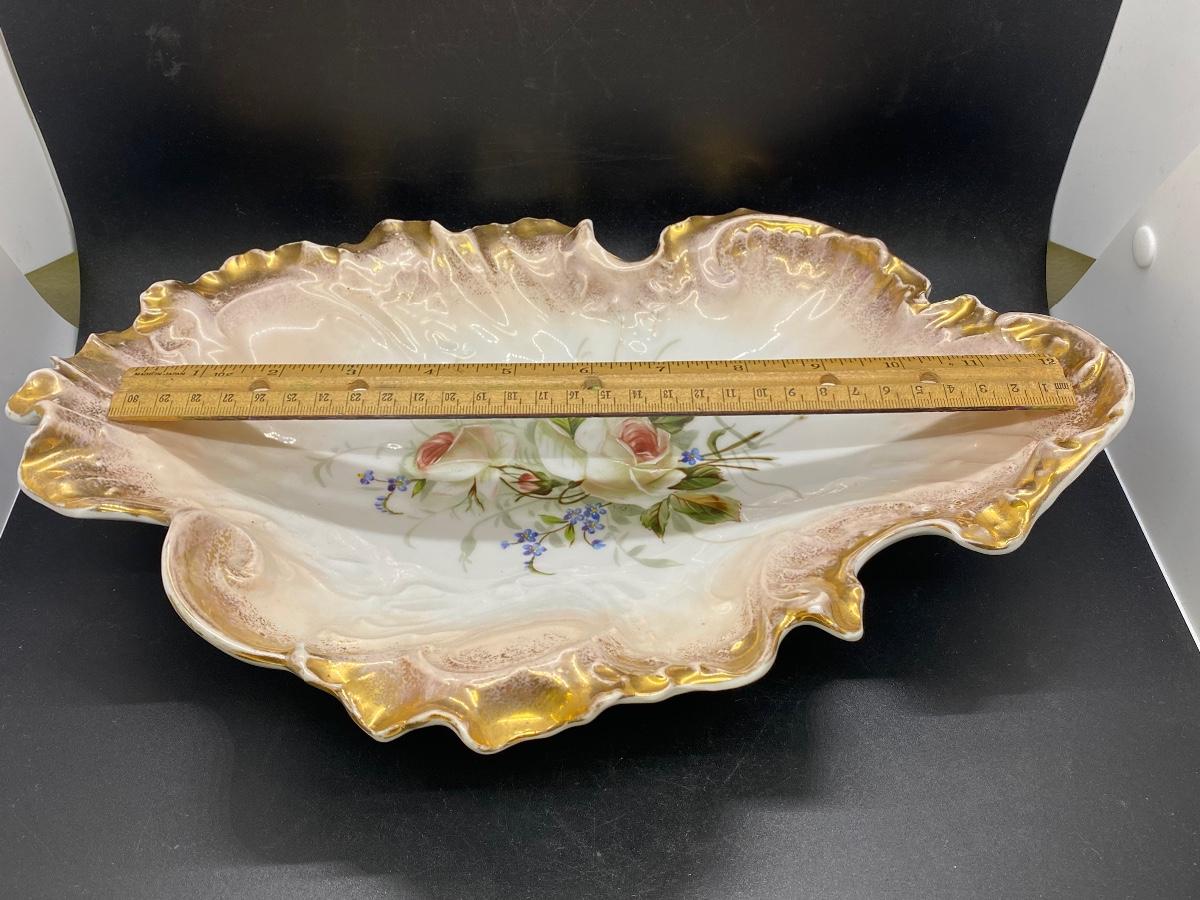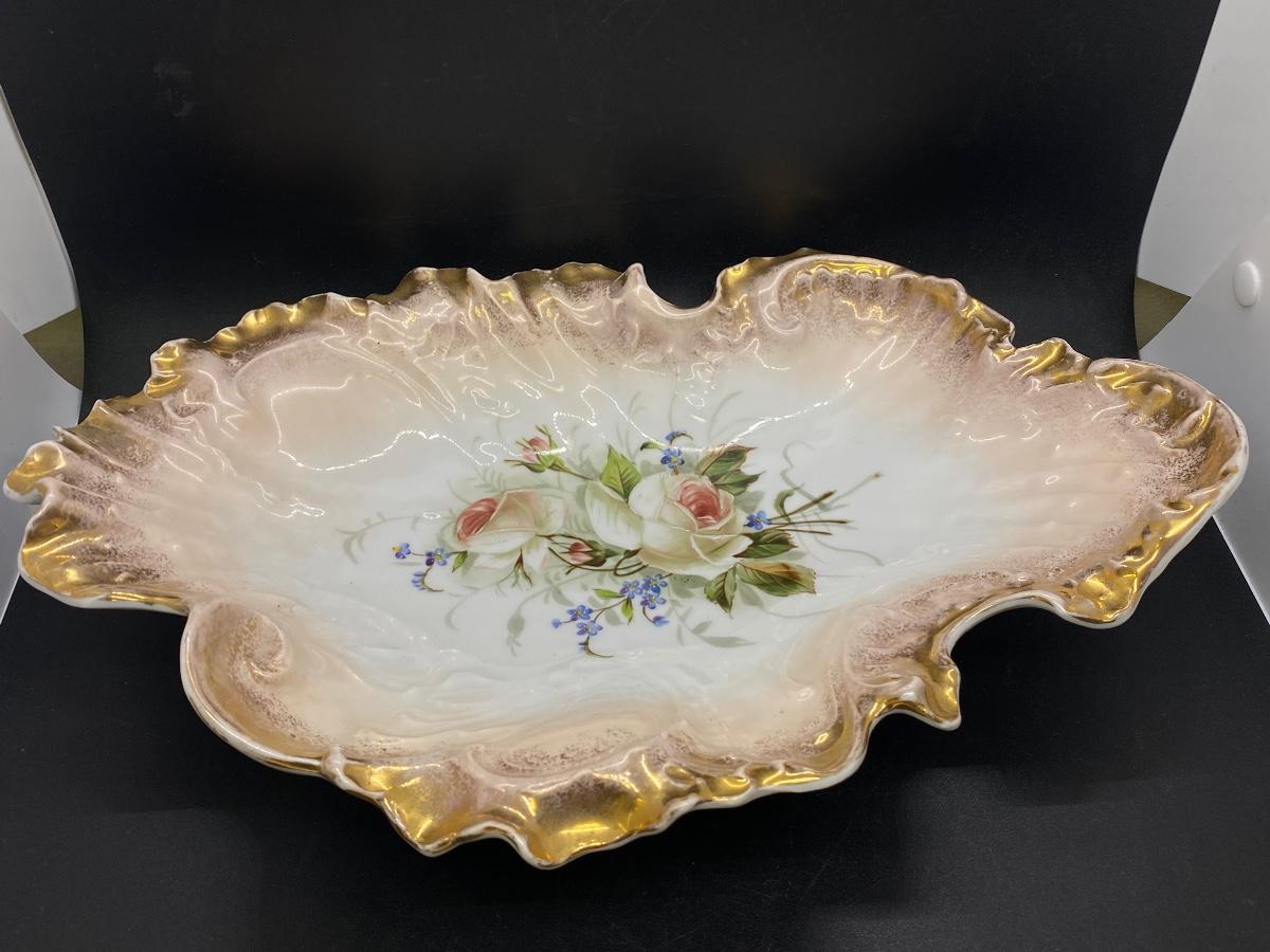 Large antique freeform scalloped serving dish from C. Tielsch & Co. Germany. Gold edge, blush to white with floral center. In good condition, no chips. About 14"
