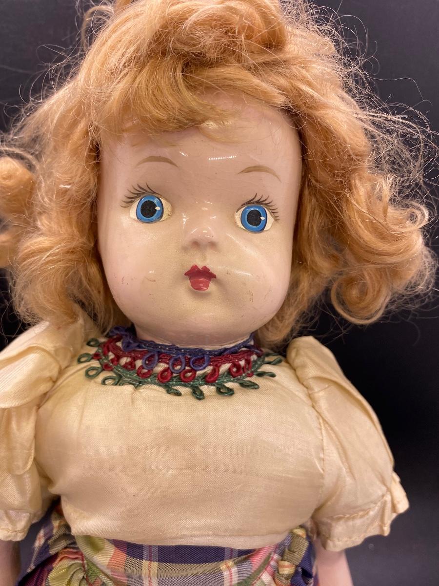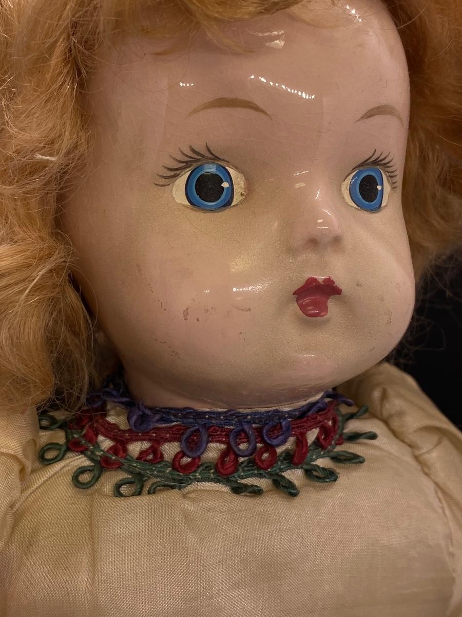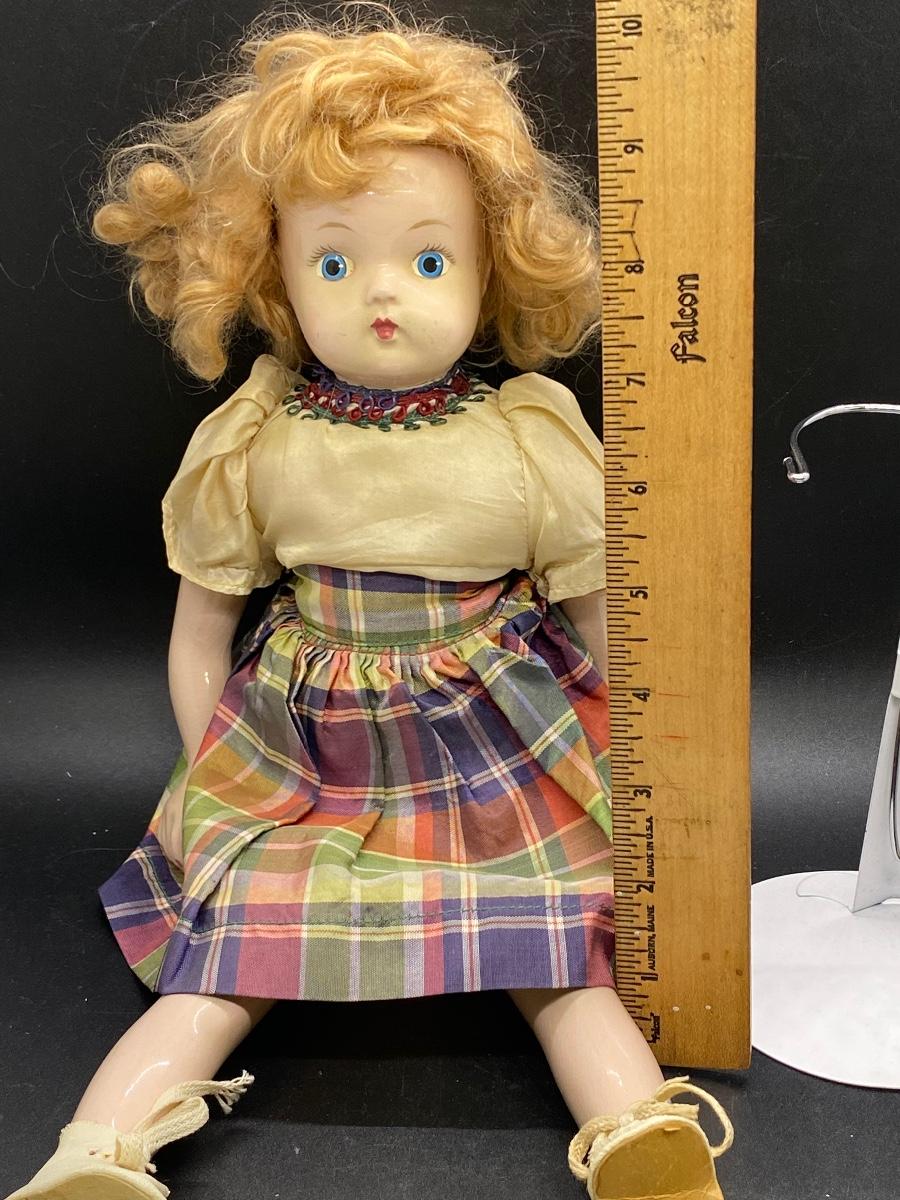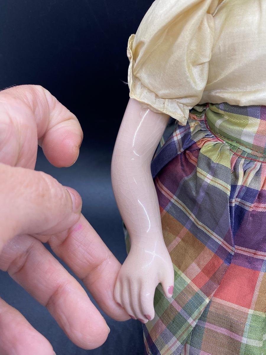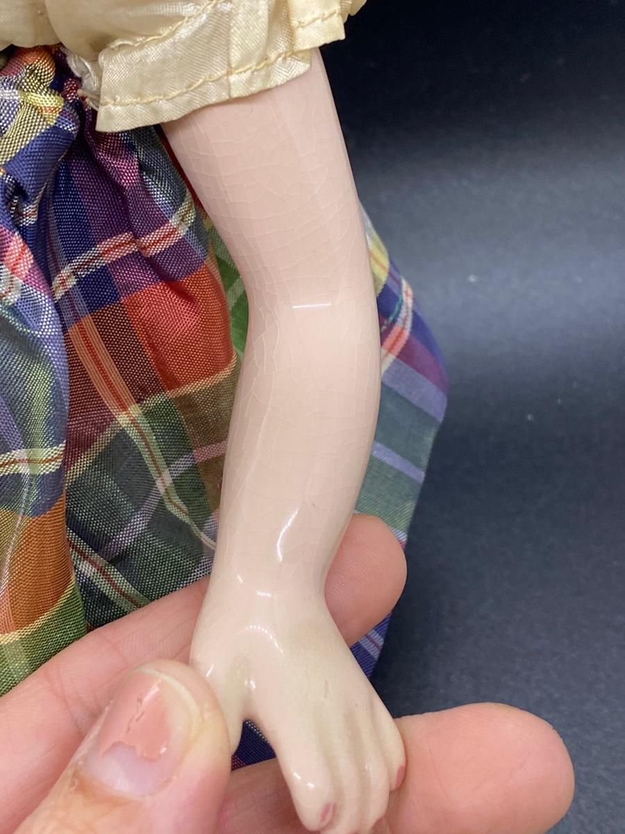 Antique Vintage Ceramic Doll. No maker marks, painted features in good vintage condition. She does have crazing. Comes with stand. Check pictures for more details and for sizing.