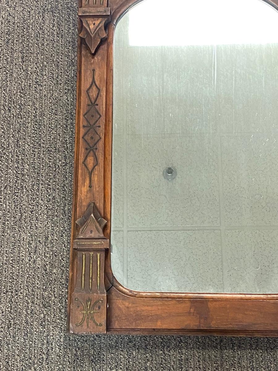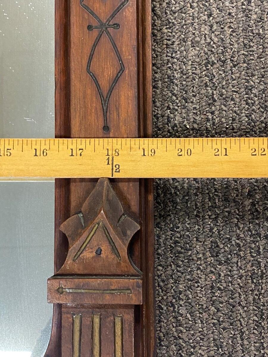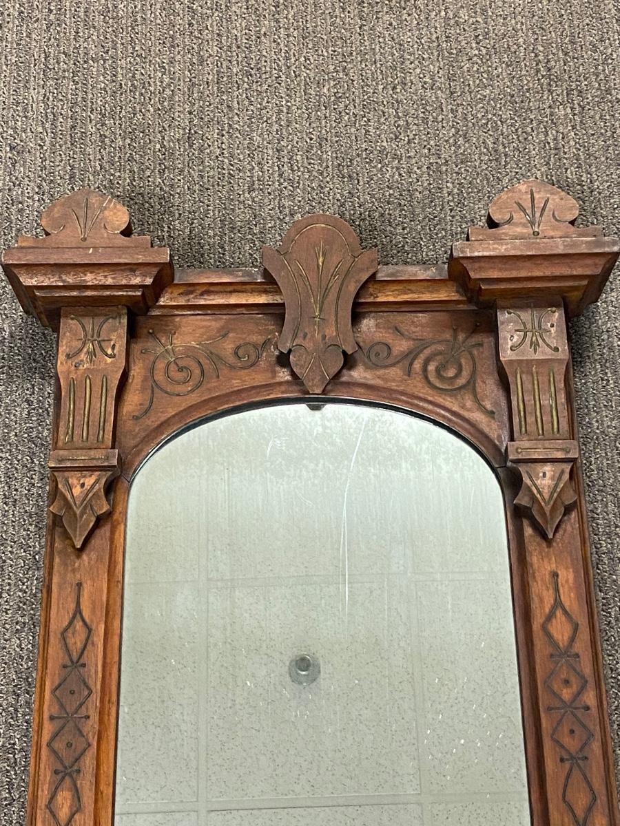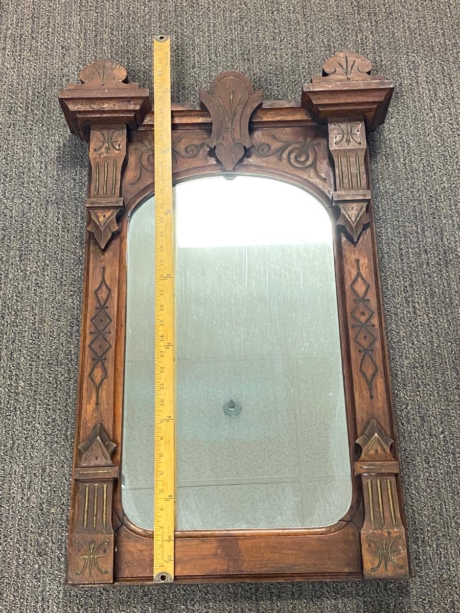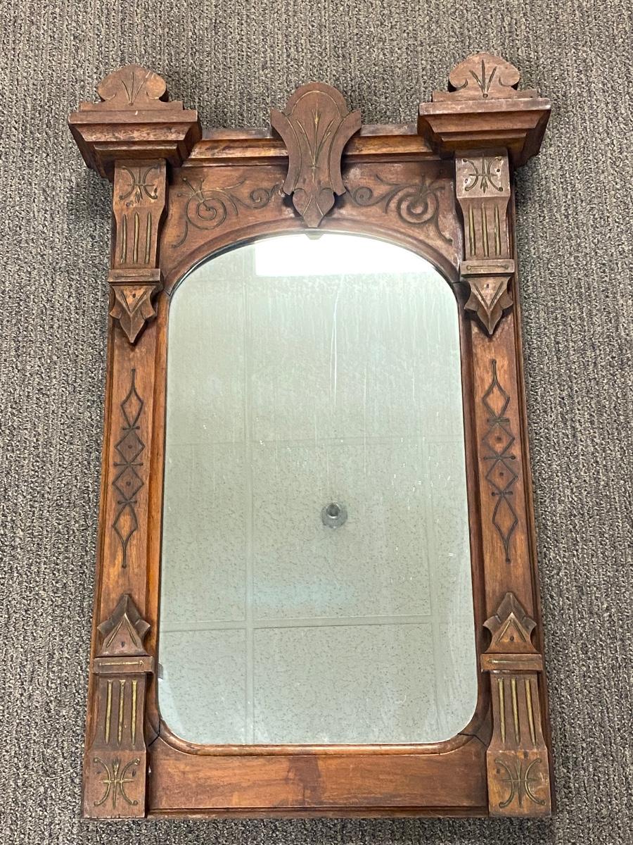 Heavy Eastlake style wood frame wall mirror. Great simple line carved details. About 36" length and 19" wide. Has an eye hook at top used for hanging.