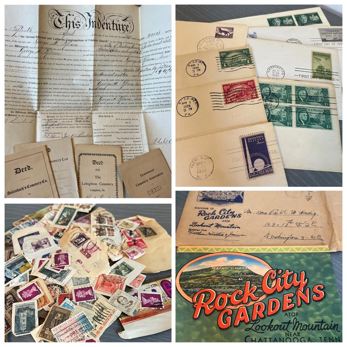 Antique Vintage Ephemera Lot - Stamps, 1899 Deed, Travel