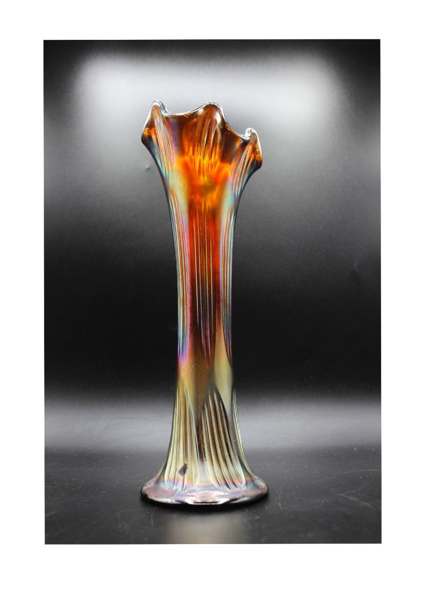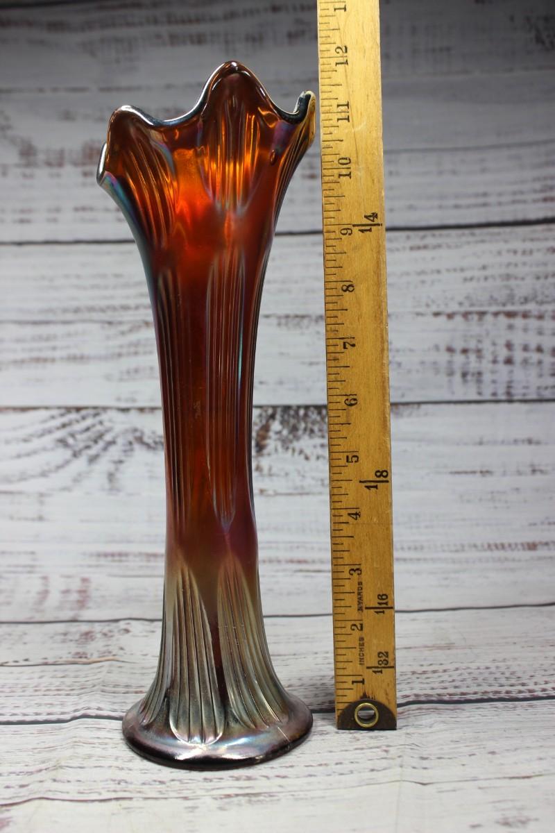 Antique Vintage Fenton Red Carnival Glass Rib Swung Vase, there are no cracks or chips to the carnival glass vase and is in good vintage condition. Check pictures for more details and for sizing.
