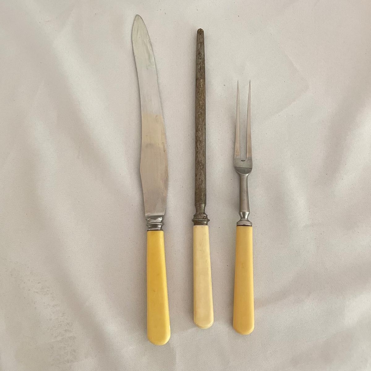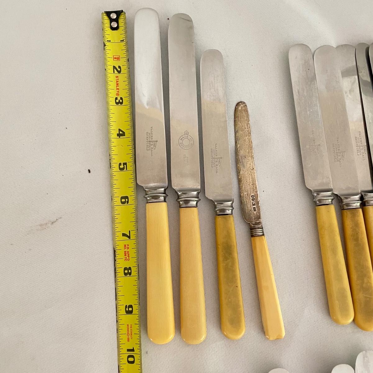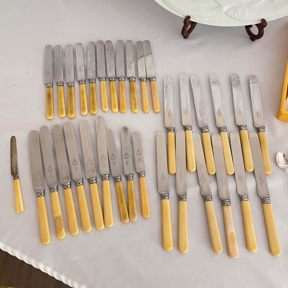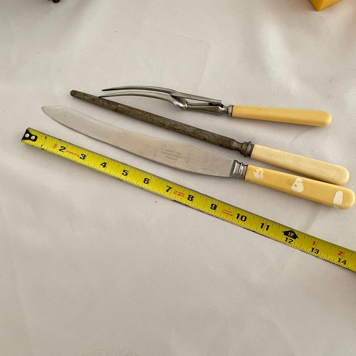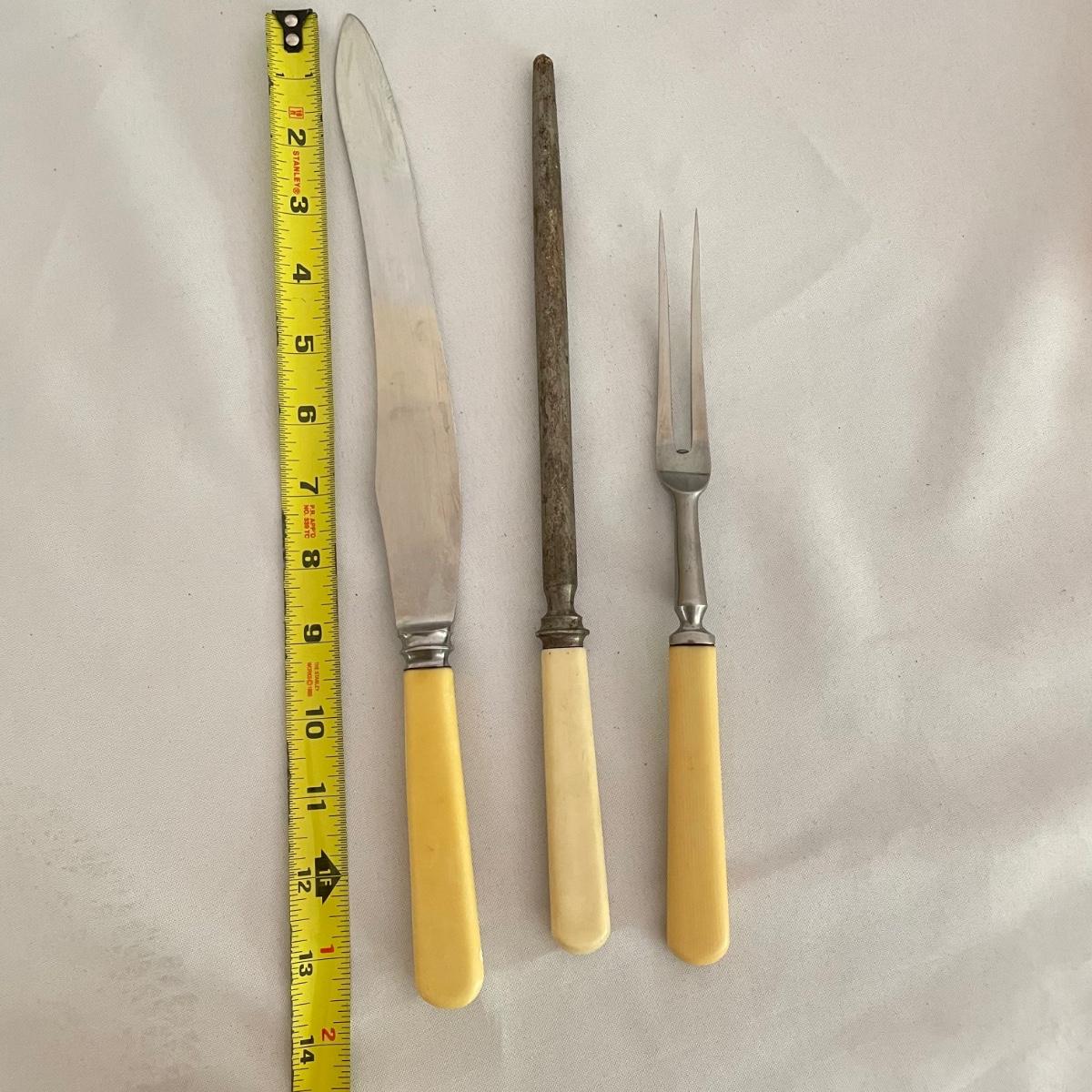 Two sets of flatware, including antique fish knives and nice fish platter. The previous owner has stated that one set of yellow handled flatware was handed down to her and came from the 1920’s, the other set she confidently stated were purchased in 1958. These sets have six forks each and plenty of knives. The second set of flatware has twelve each: small and large soup spoons and entree forks, along with eleven salad forks and a few smaller spoons. Lot also includes a carving set and sharpener. Most flatware needs a bit of cleaning and polishing. See images, local pick up only.