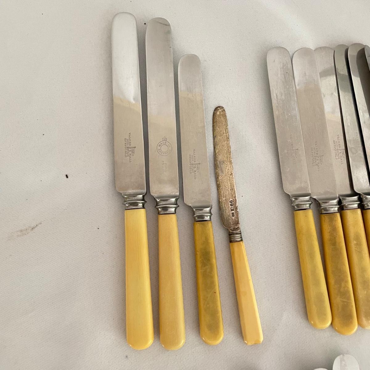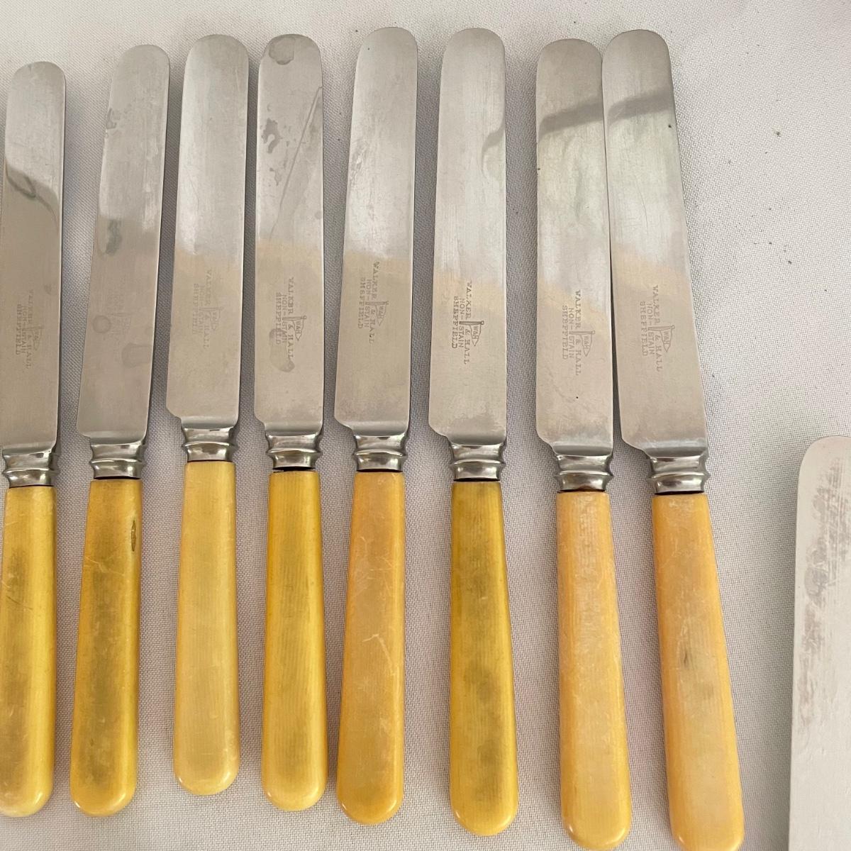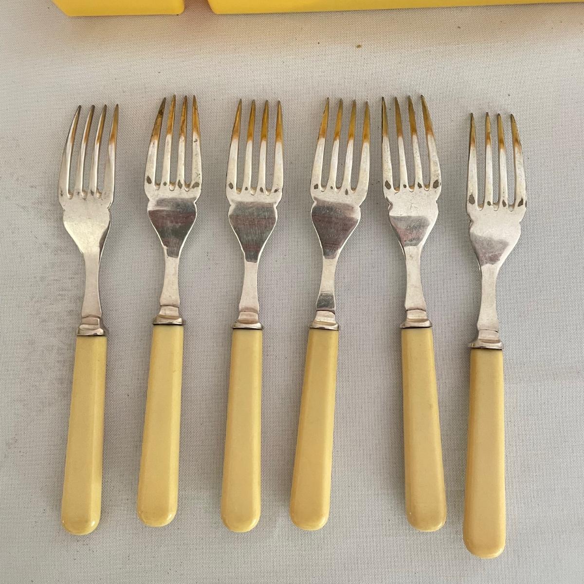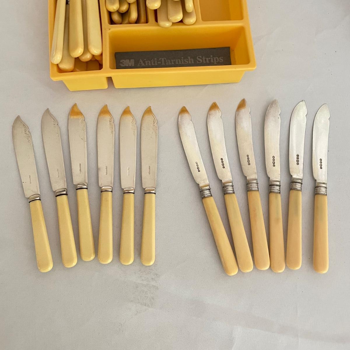 Two sets of flatware, including antique fish knives and nice fish platter. The previous owner has stated that one set of yellow handled flatware was handed down to her and came from the 1920’s, the other set she confidently stated were purchased in 1958. These sets have six forks each and plenty of knives. The second set of flatware has twelve each: small and large soup spoons and entree forks, along with eleven salad forks and a few smaller spoons. Lot also includes a carving set and sharpener. Most flatware needs a bit of cleaning and polishing. See images, local pick up only.