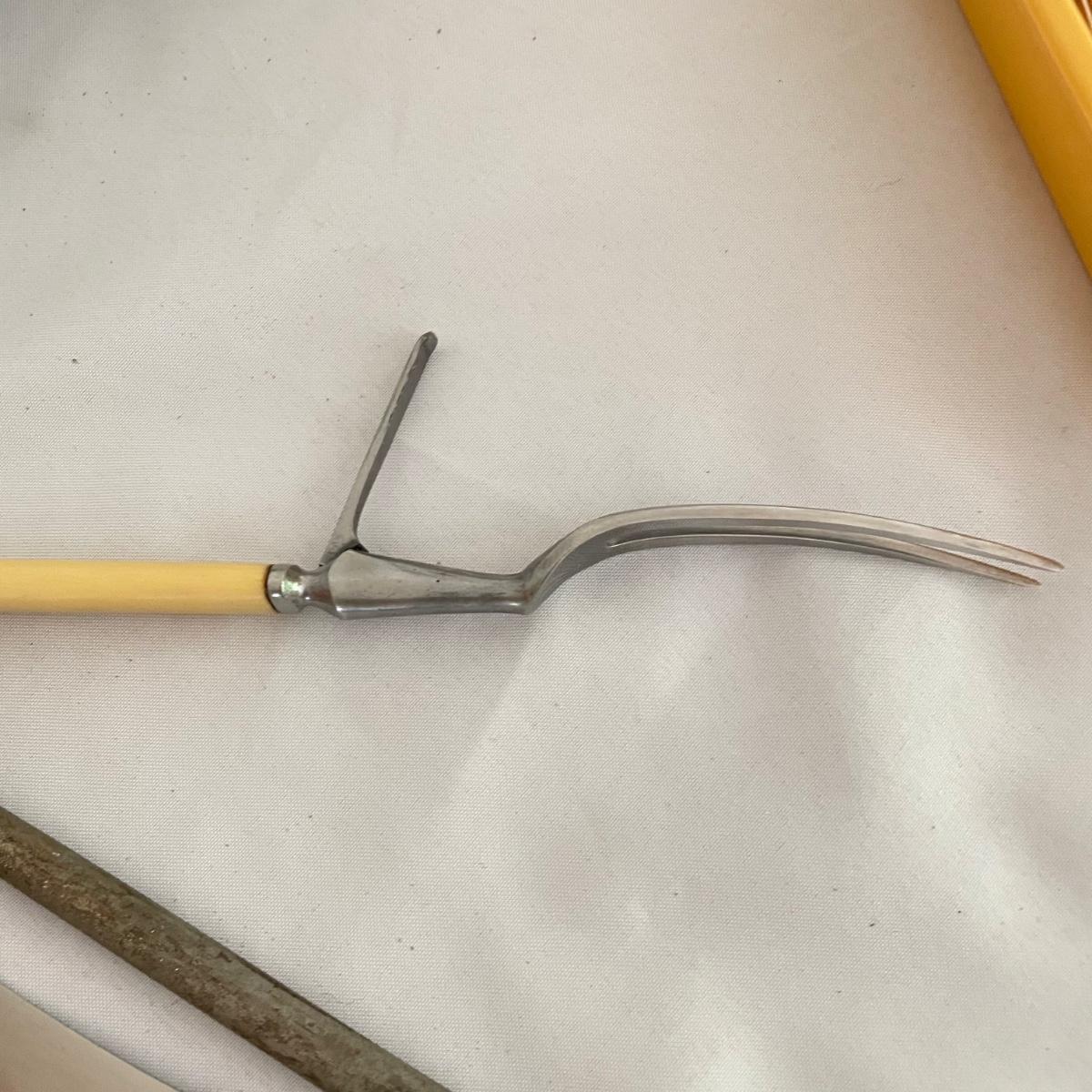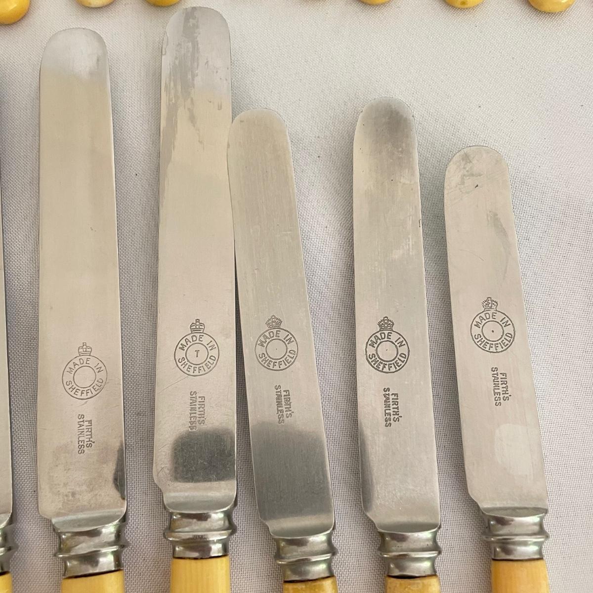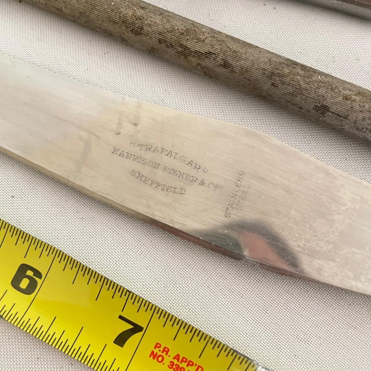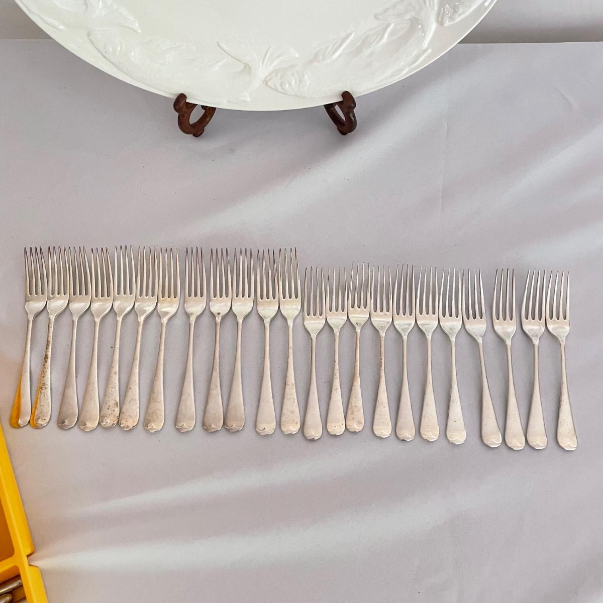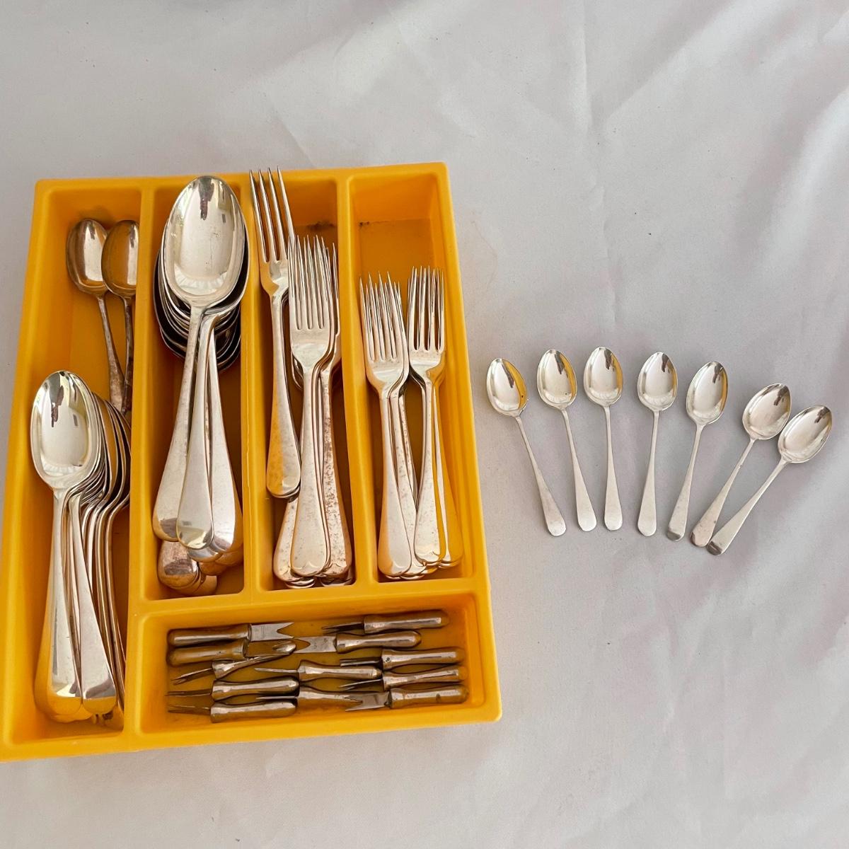 Two sets of flatware, including antique fish knives and nice fish platter. The previous owner has stated that one set of yellow handled flatware was handed down to her and came from the 1920’s, the other set she confidently stated were purchased in 1958. These sets have six forks each and plenty of knives. The second set of flatware has twelve each: small and large soup spoons and entree forks, along with eleven salad forks and a few smaller spoons. Lot also includes a carving set and sharpener. Most flatware needs a bit of cleaning and polishing. See images, local pick up only.