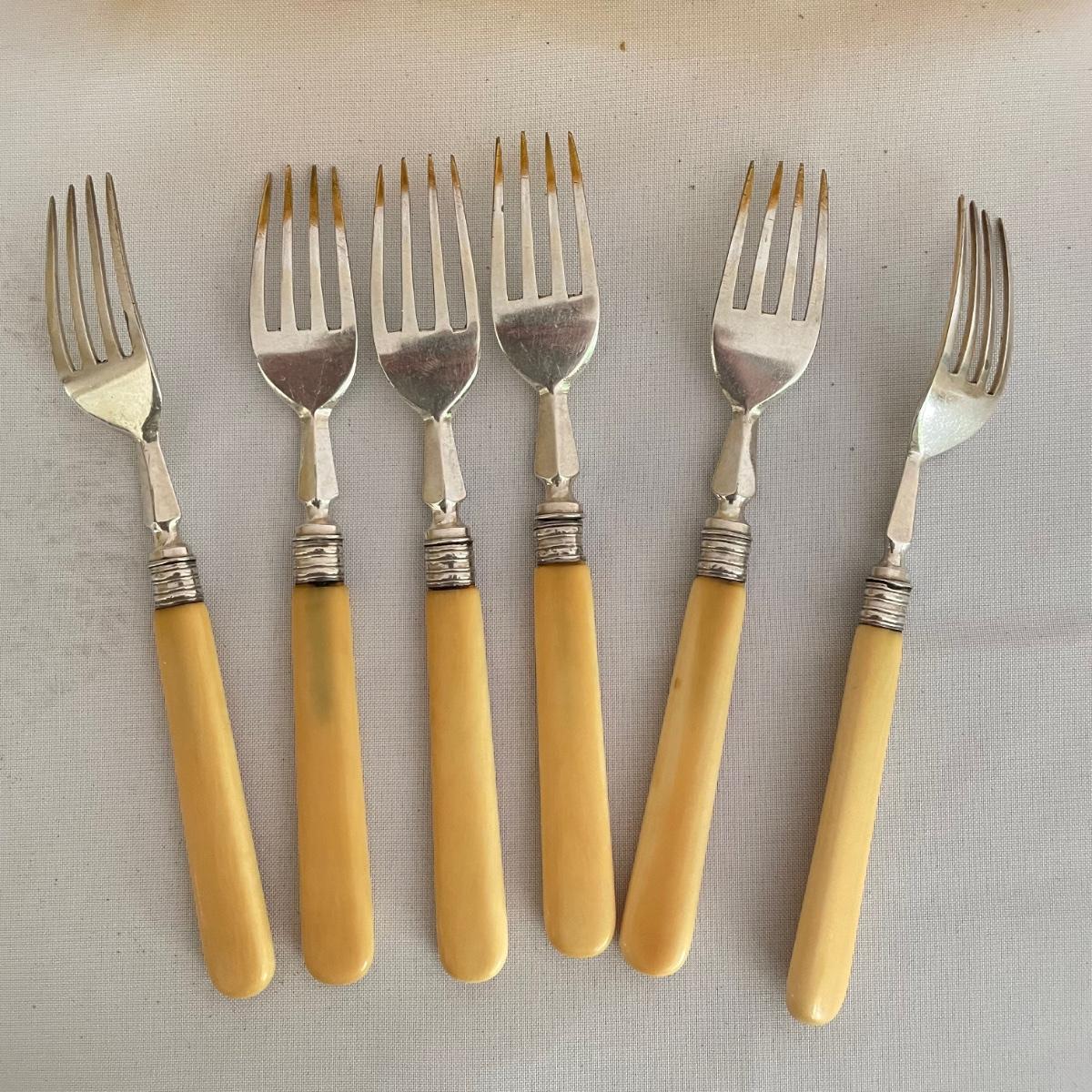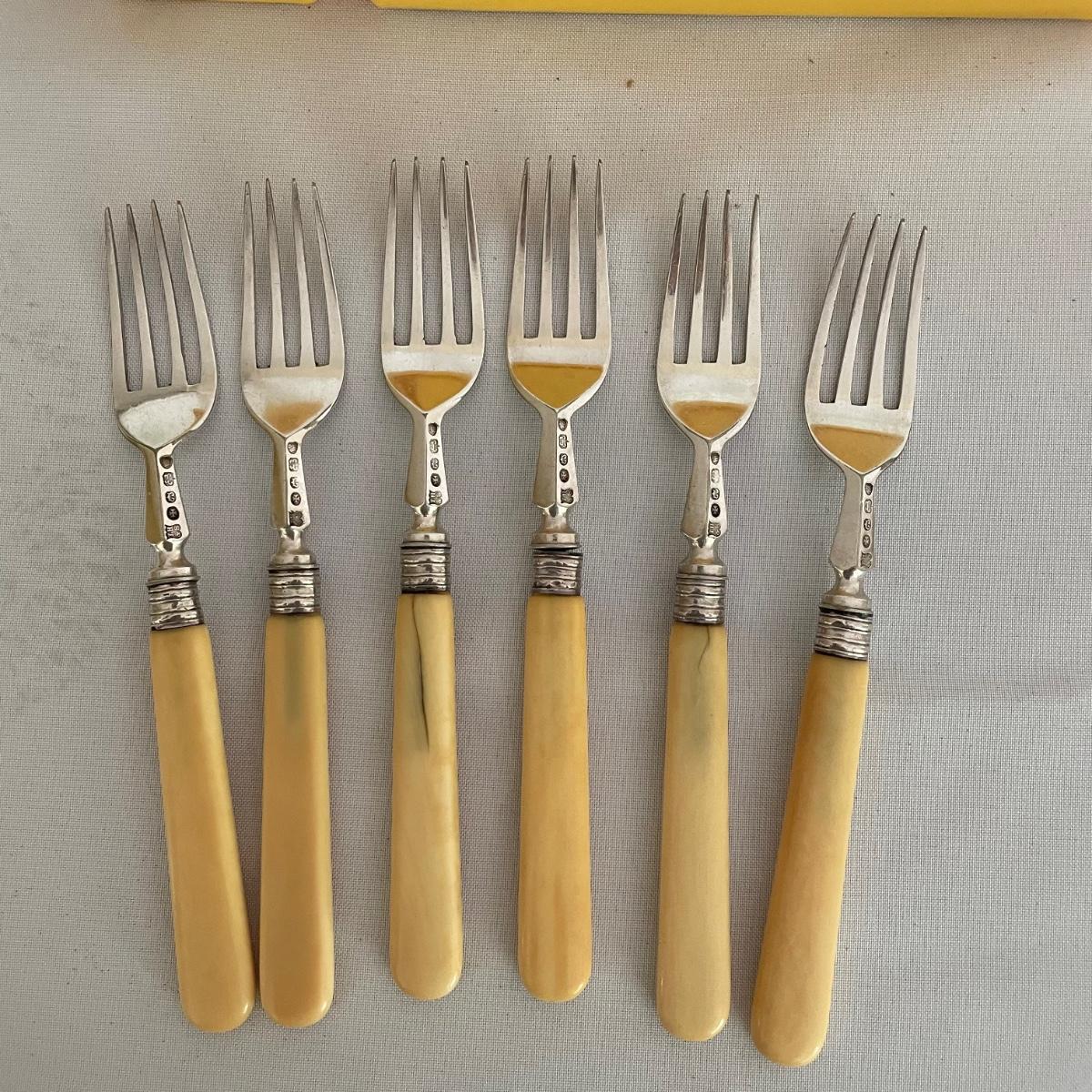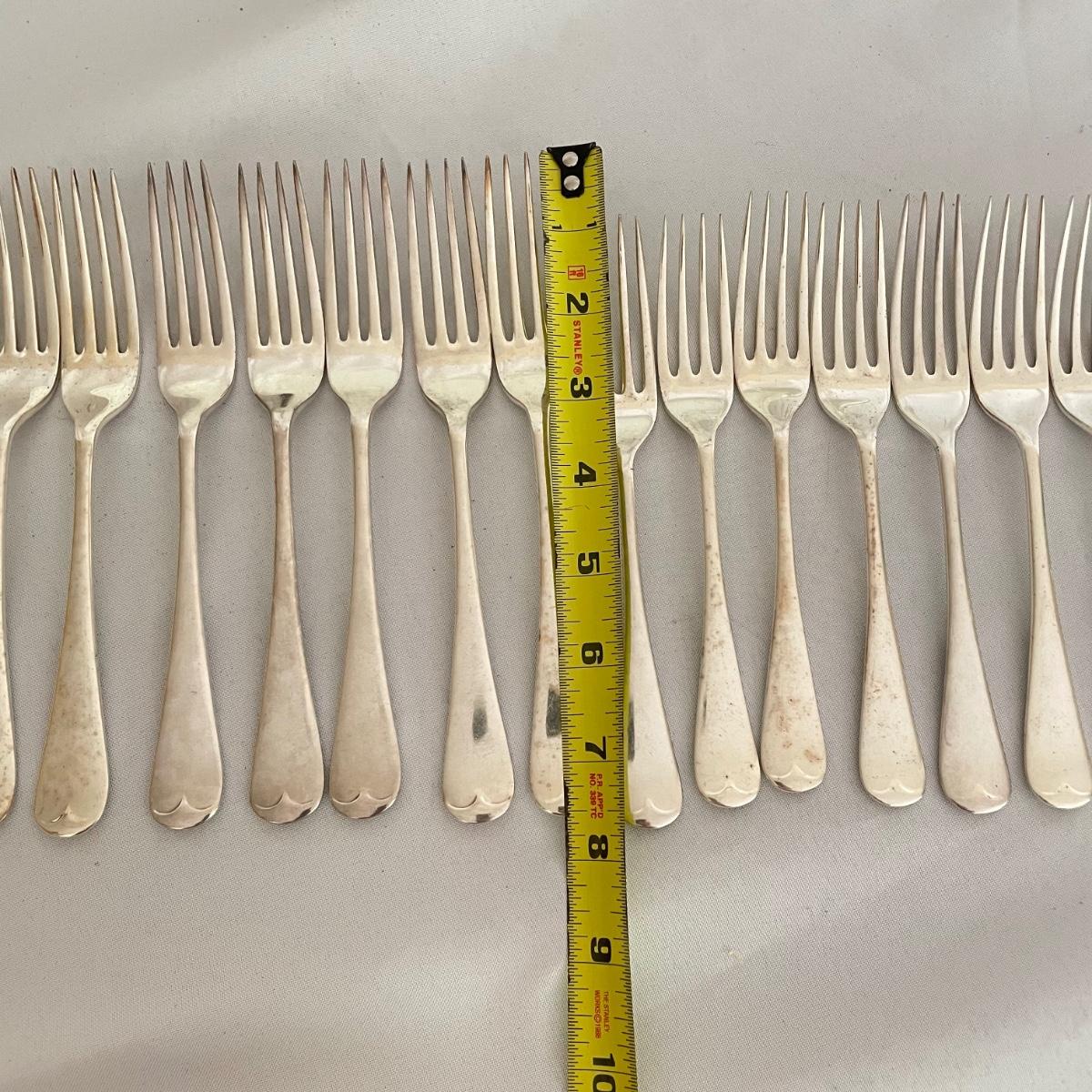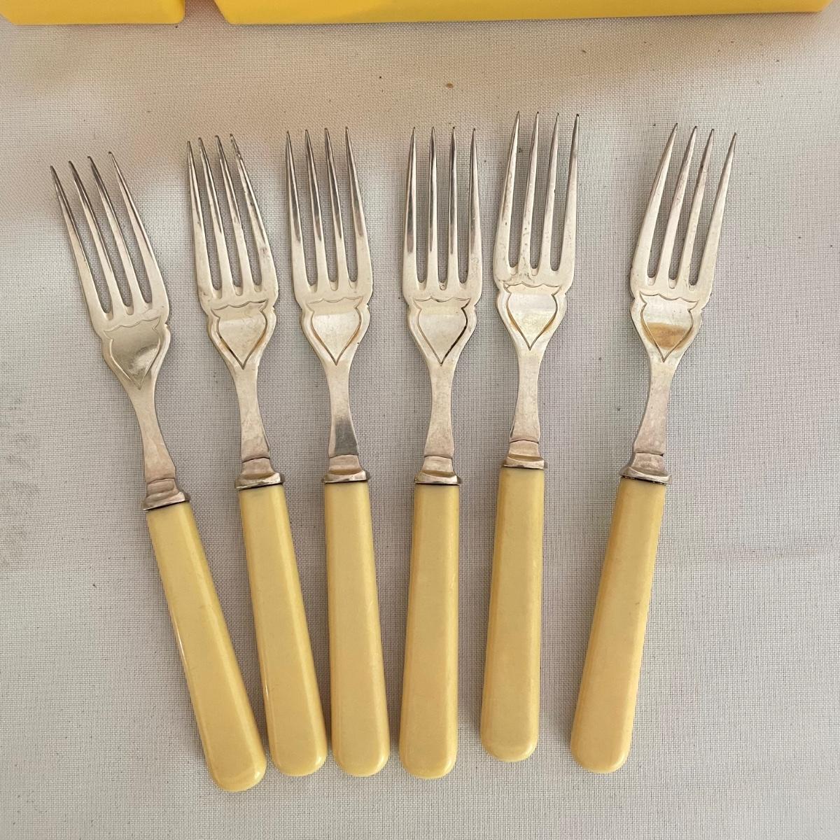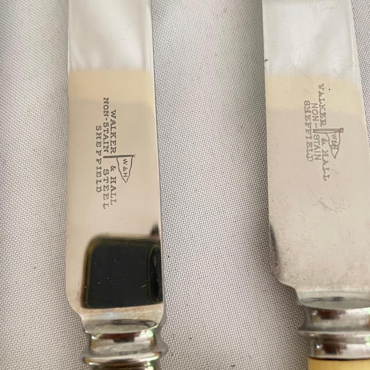 Two sets of flatware, including antique fish knives and nice fish platter. The previous owner has stated that one set of yellow handled flatware was handed down to her and came from the 1920’s, the other set she confidently stated were purchased in 1958. These sets have six forks each and plenty of knives. The second set of flatware has twelve each: small and large soup spoons and entree forks, along with eleven salad forks and a few smaller spoons. Lot also includes a carving set and sharpener. Most flatware needs a bit of cleaning and polishing. See images, local pick up only.