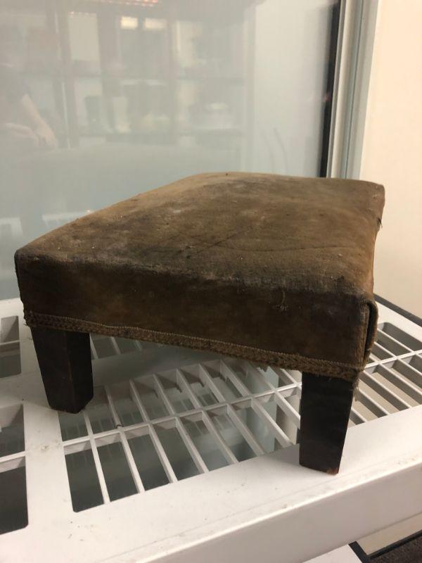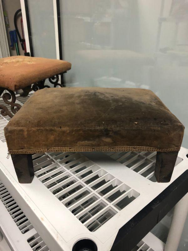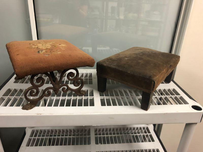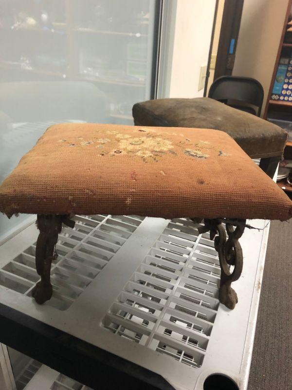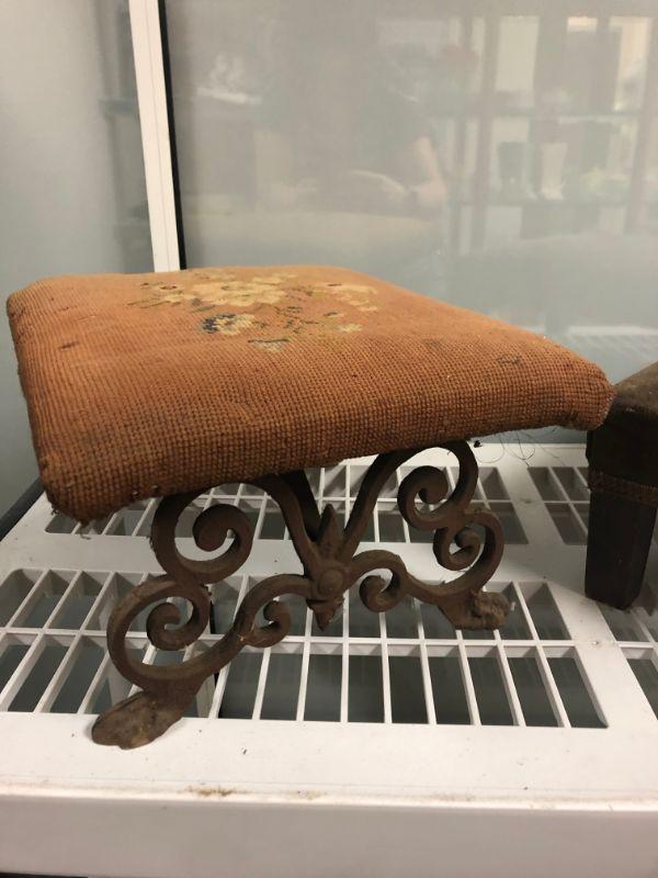 Antique / Vintage foot stools foot-stool tapetry top iron legs on one and wood on the other