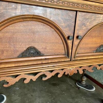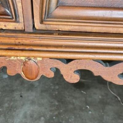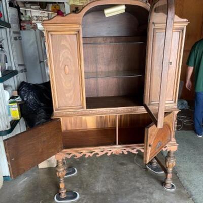 Measures 69" high x 46.5" wide x 20" deep. Antique French cabinet. Glass front display with two glass shelves. Lower cabinet storage as well. Light finish on what may be pine or oak. Carved wood details.