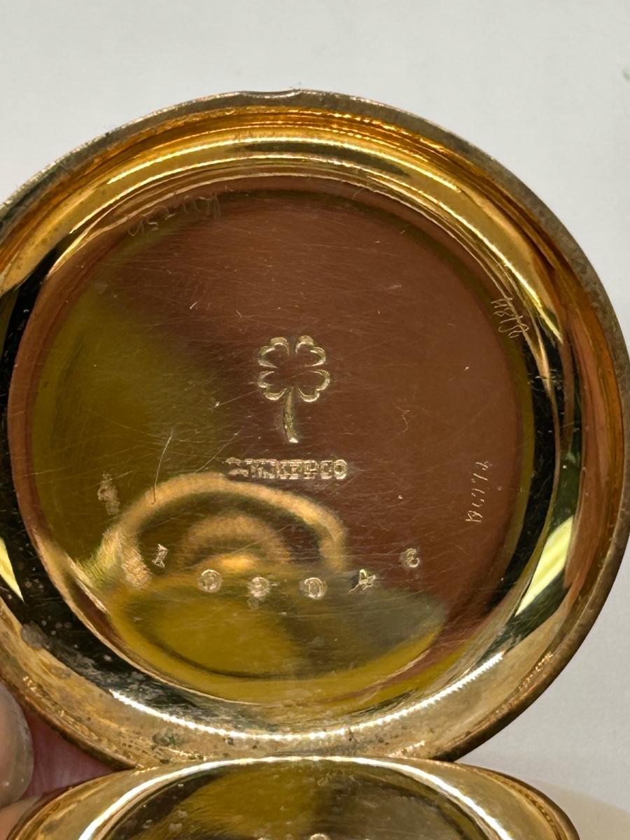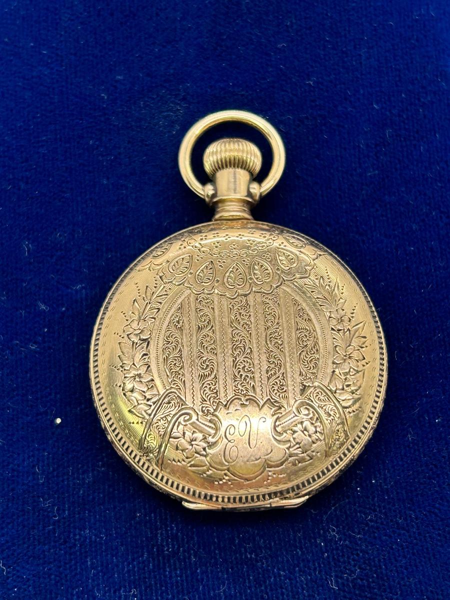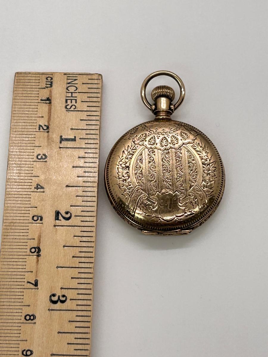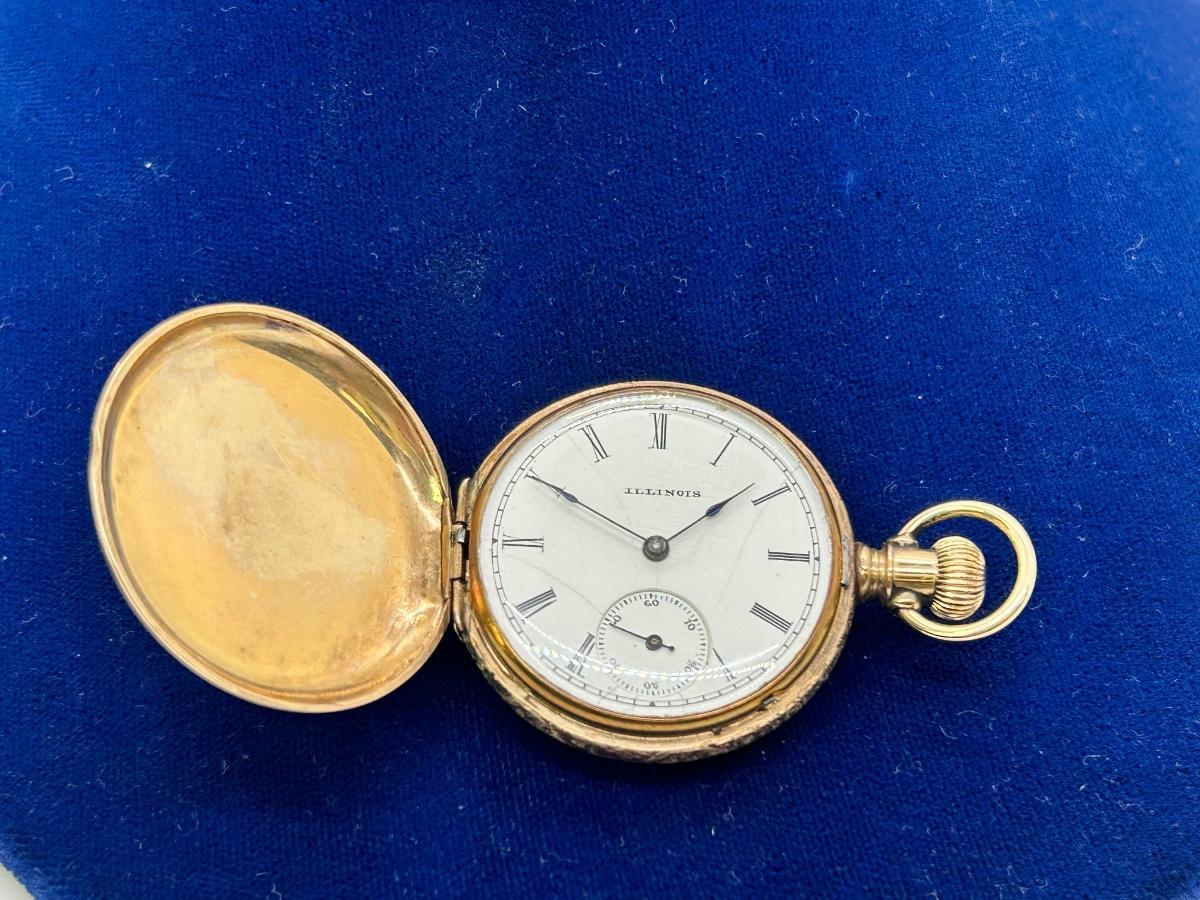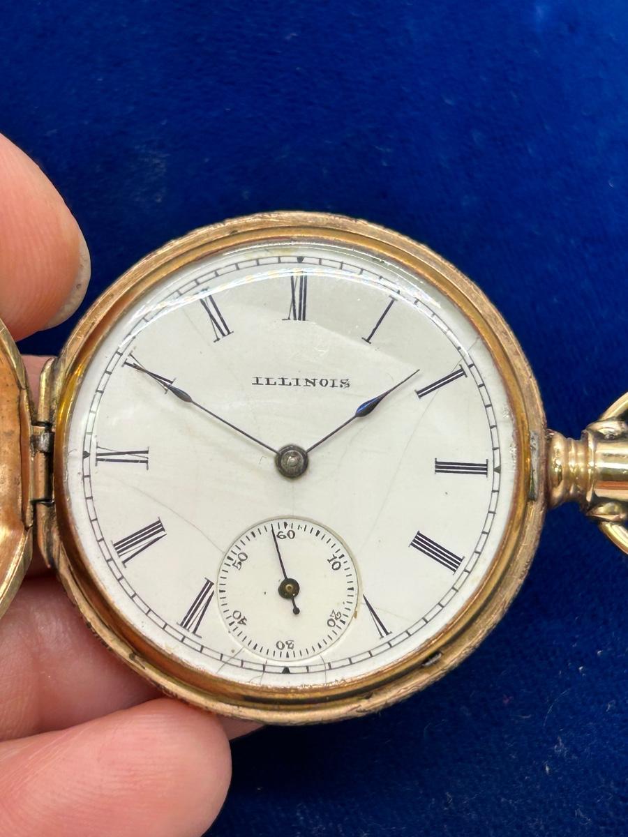 Antique Vintage Illinois Small Pocket Watch Numbered Running. In good condition, works, but face looks to have fine line cracks from age. No gold marks found but there is a serial number inside the back of case. Looks gold fill or plate. Comes with display hanger but no glass dome.