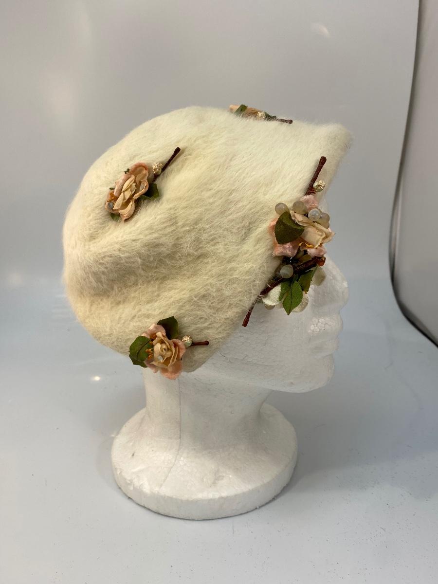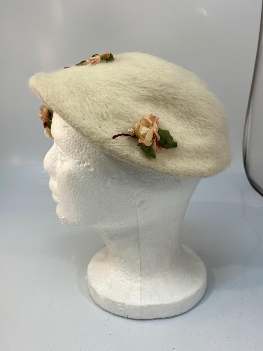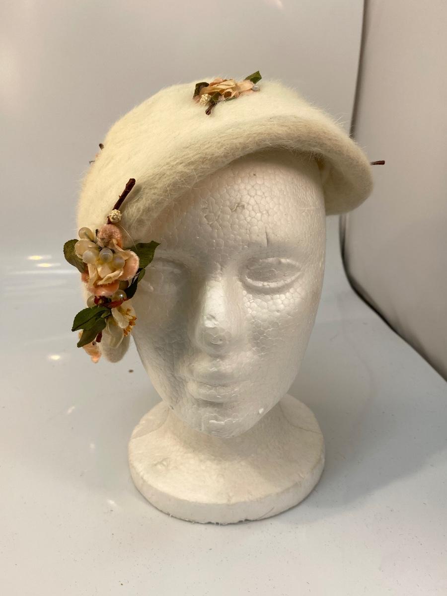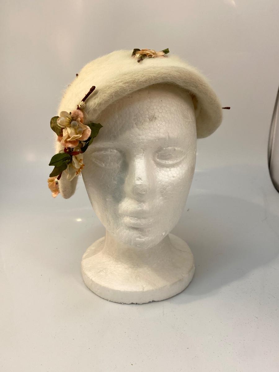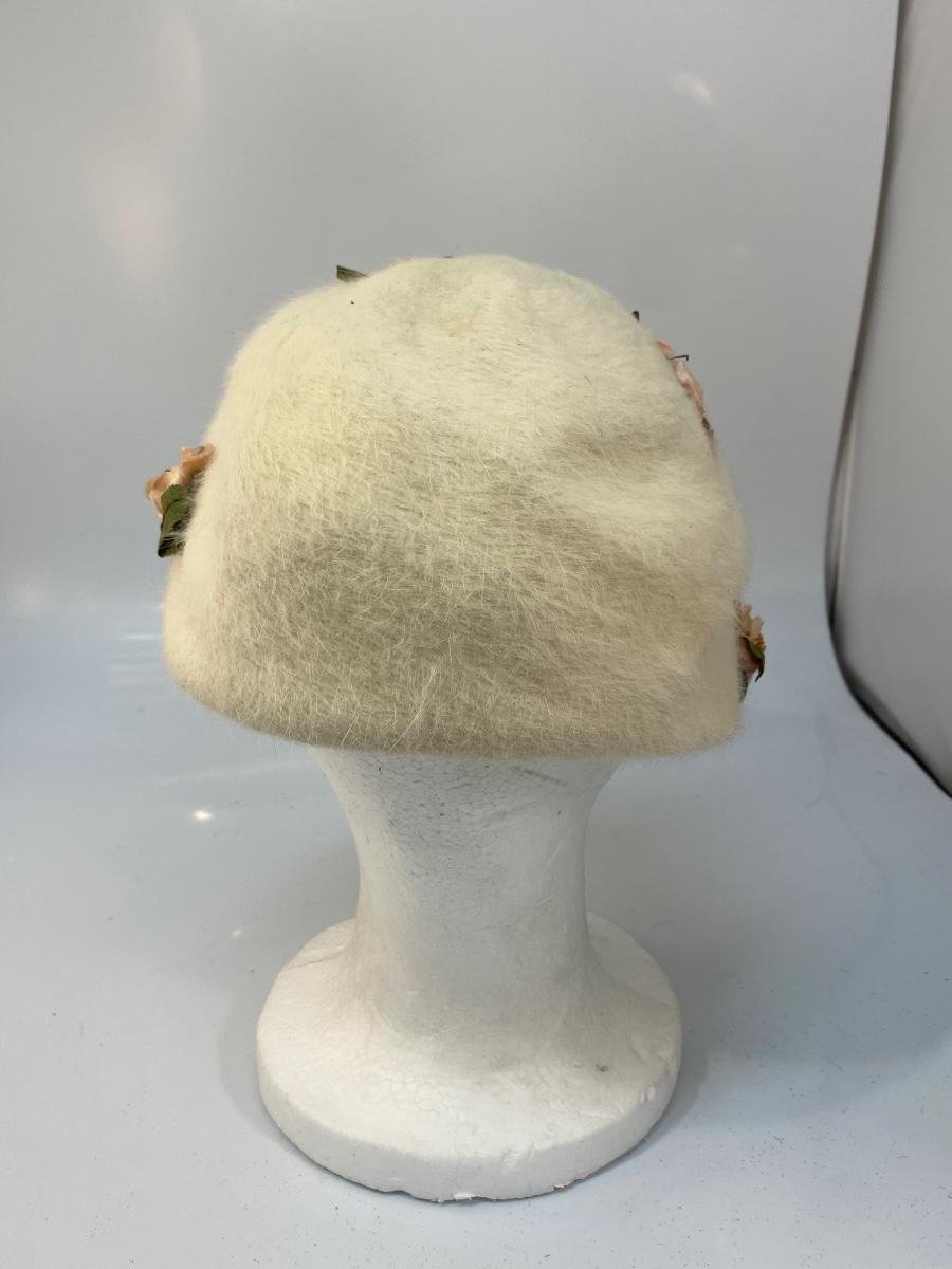 Antique Vintage Italian Made Asymmetrical Brushed Wool Cloche Hat. In good antique condition. Artificial flowers are dusty pink in color. Soft brush wool. No spots or holes.