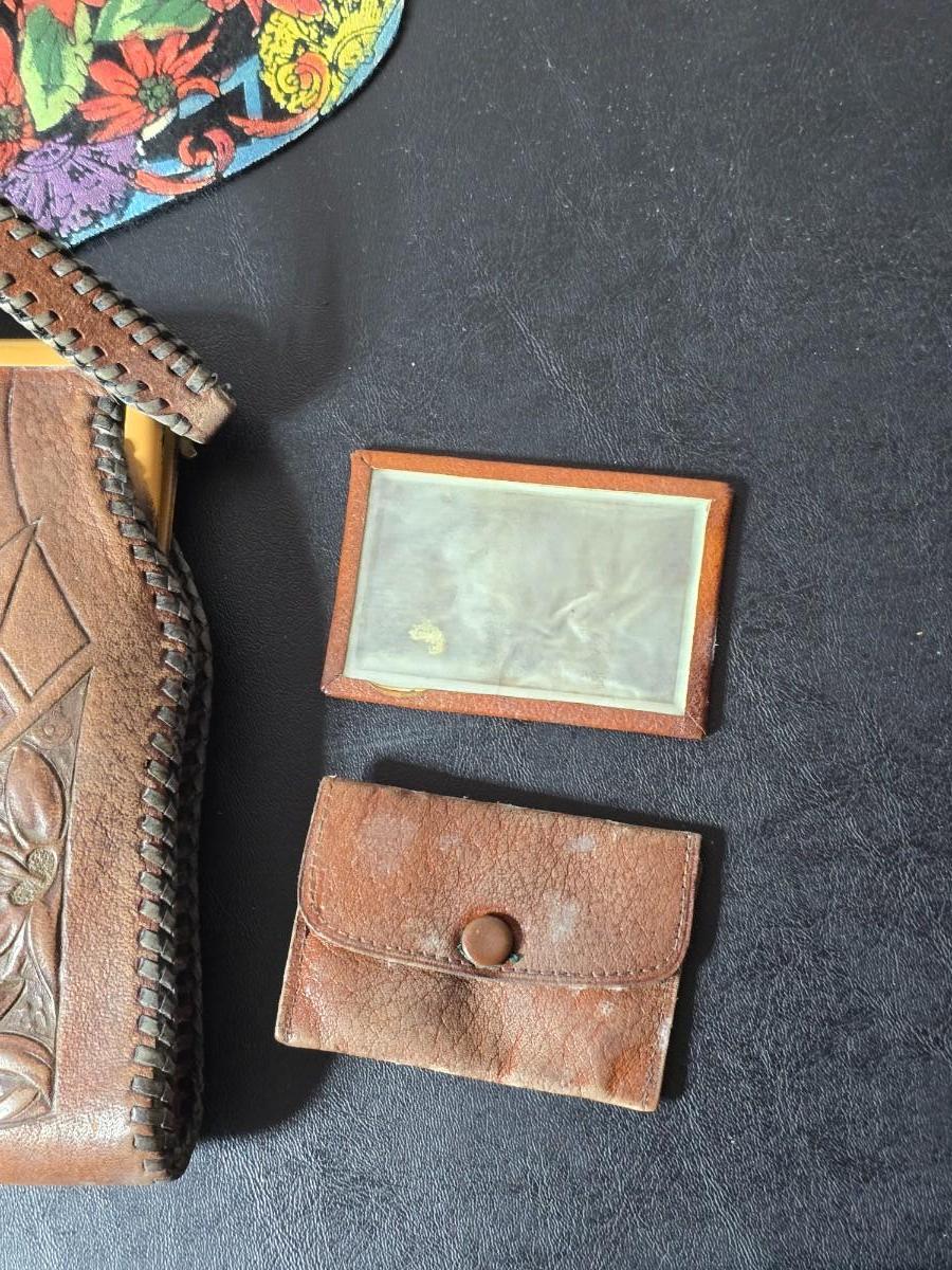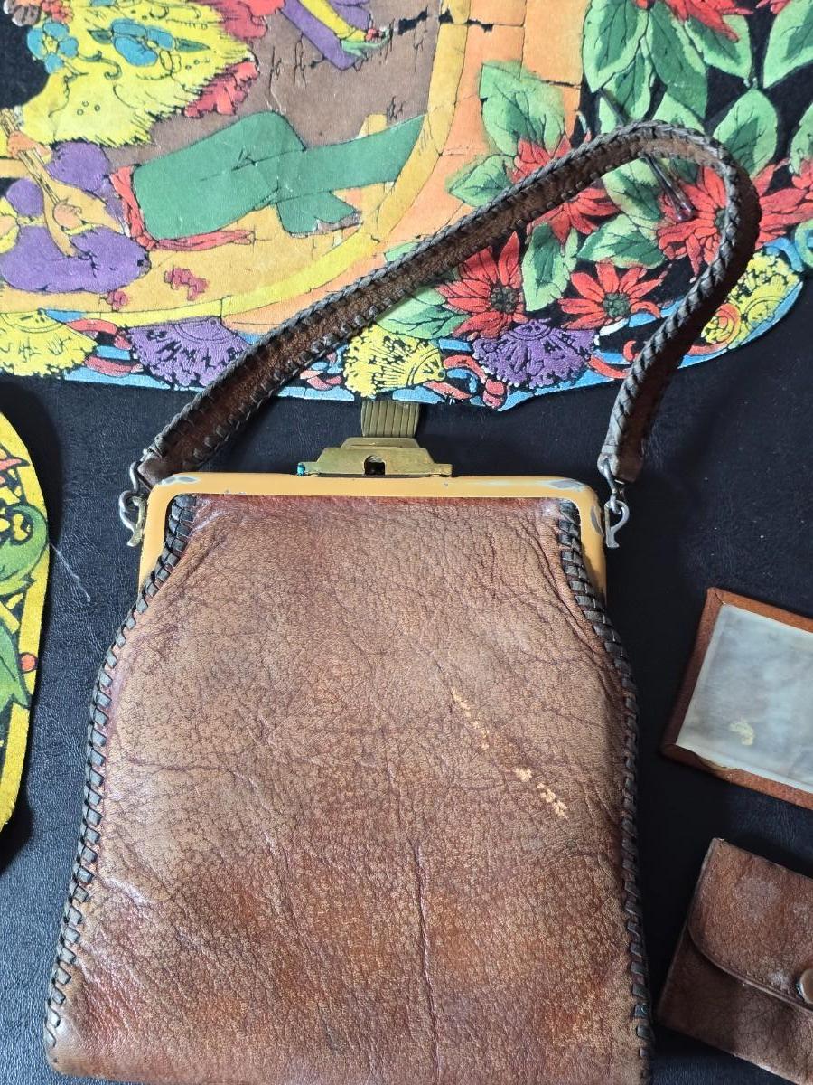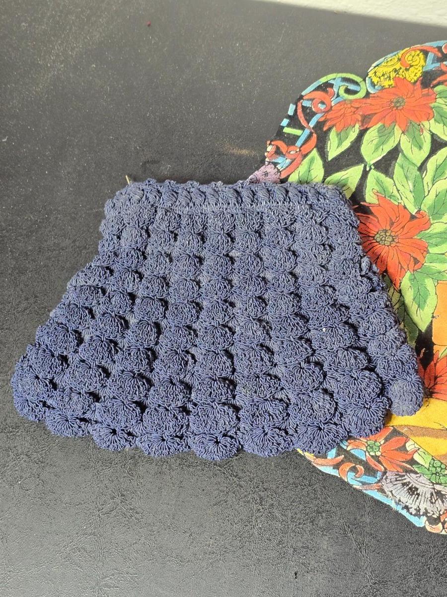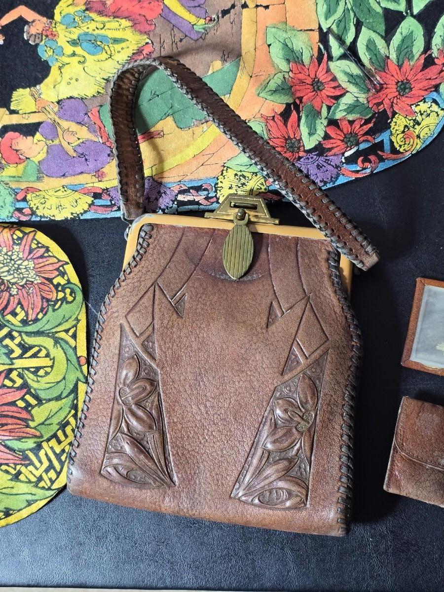 Antique Vintage Leather hand tooled Art Nouveau Deco purse - 1940s navy crocheted popcorn purse -belt - Handcrafted textiles and more