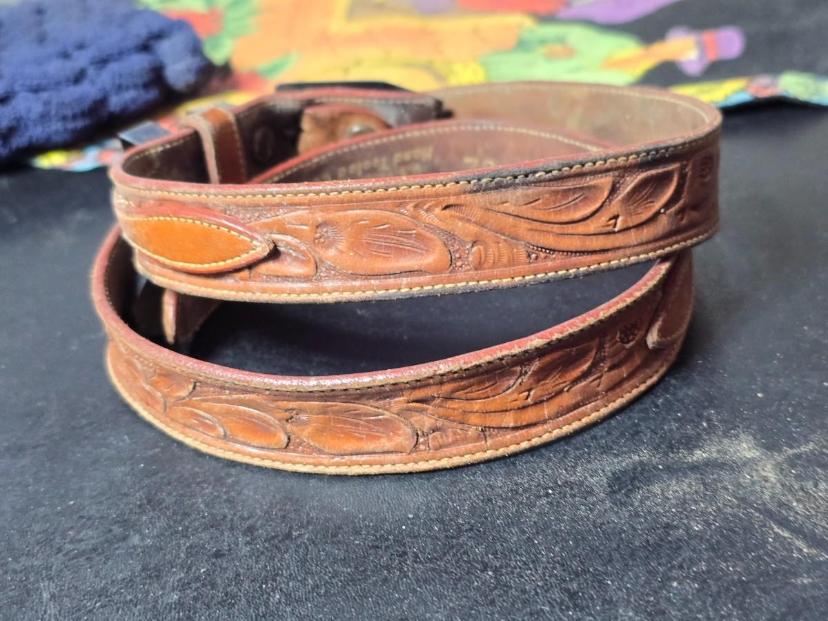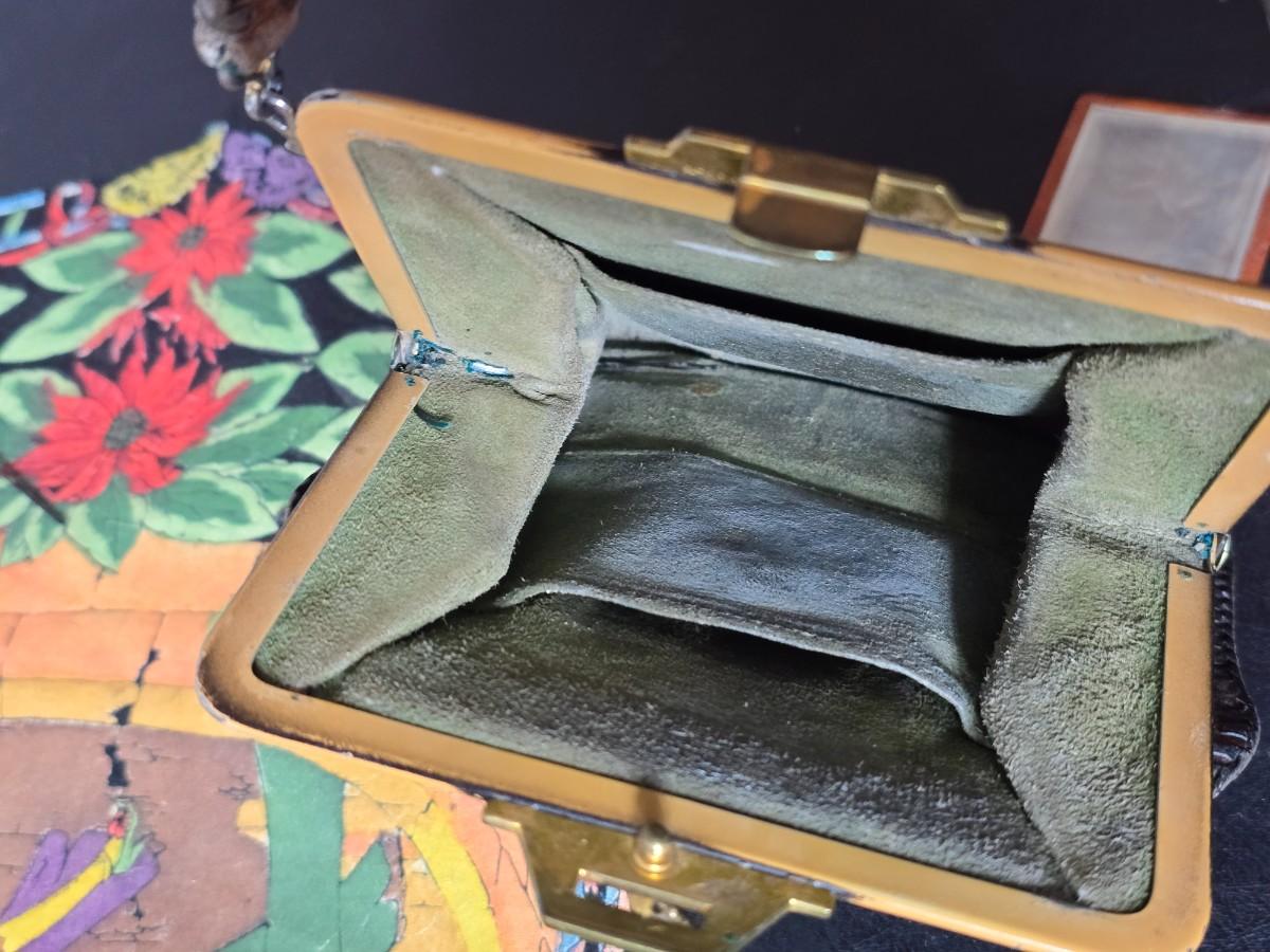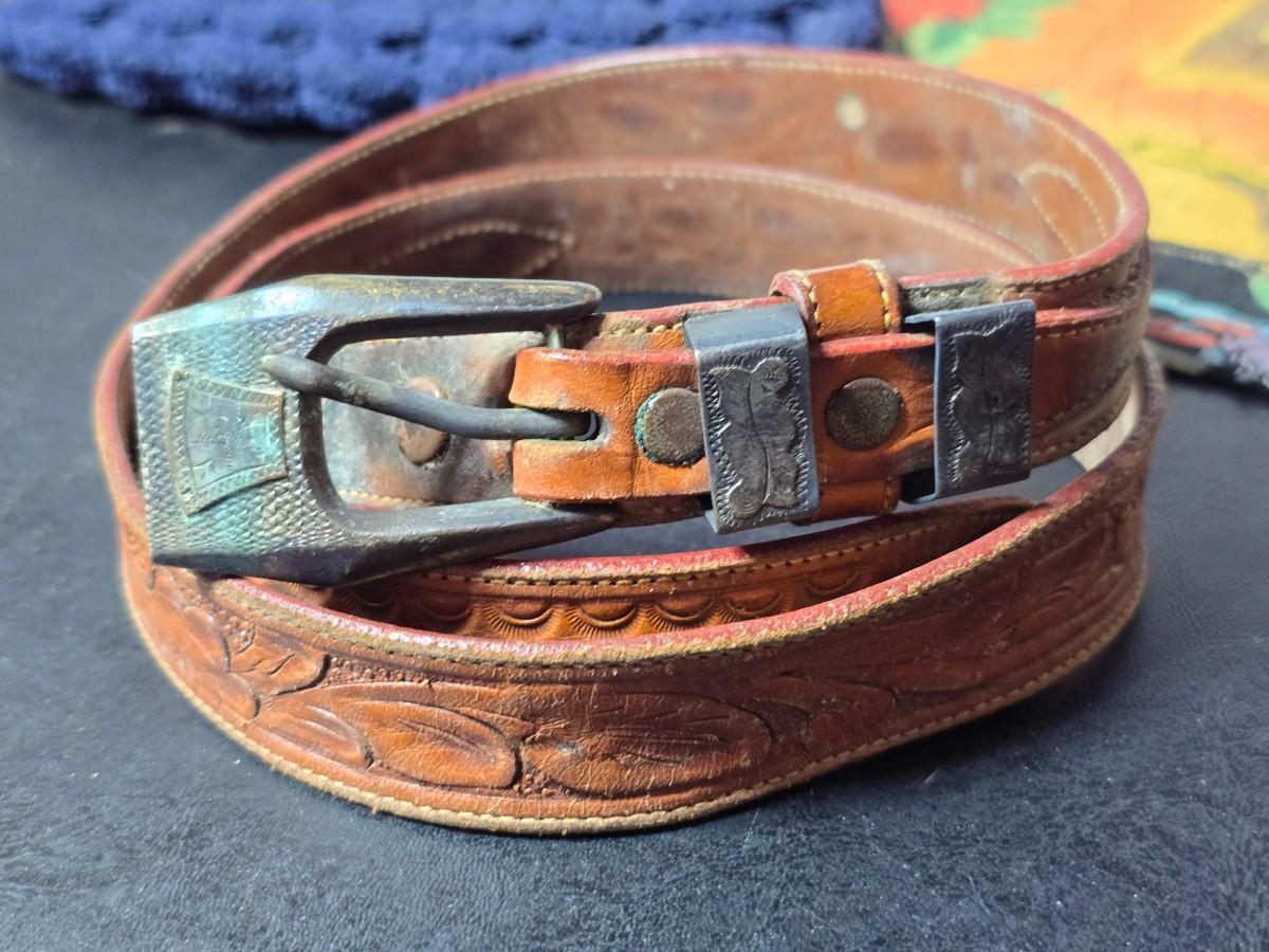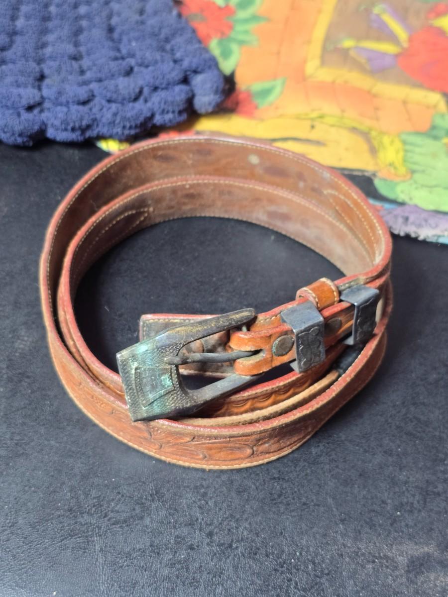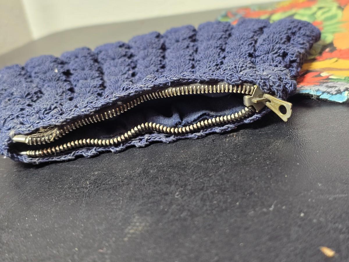 Antique Vintage Leather hand tooled Art Nouveau Deco purse - 1940s navy crocheted popcorn purse -belt - Handcrafted textiles and more