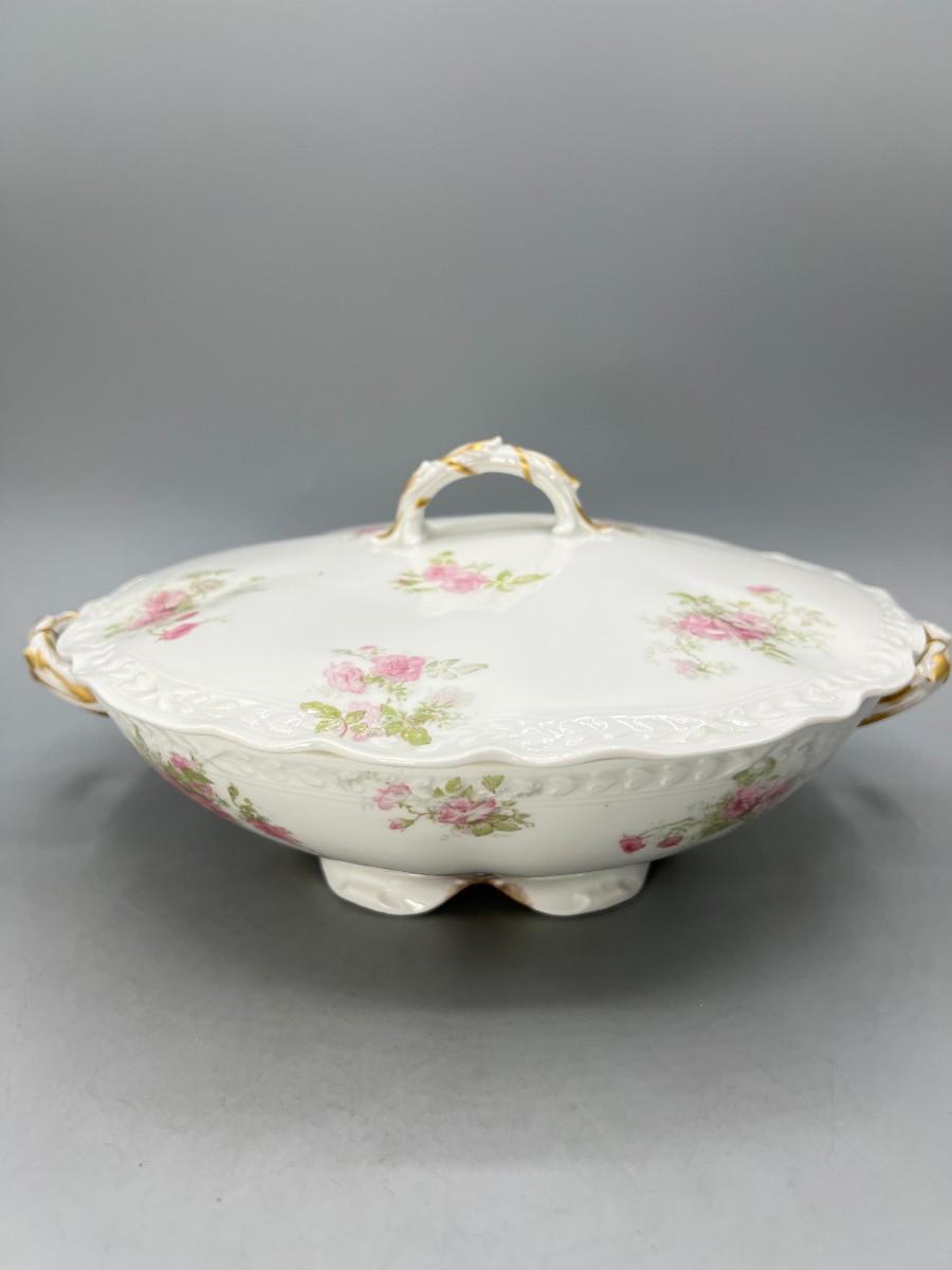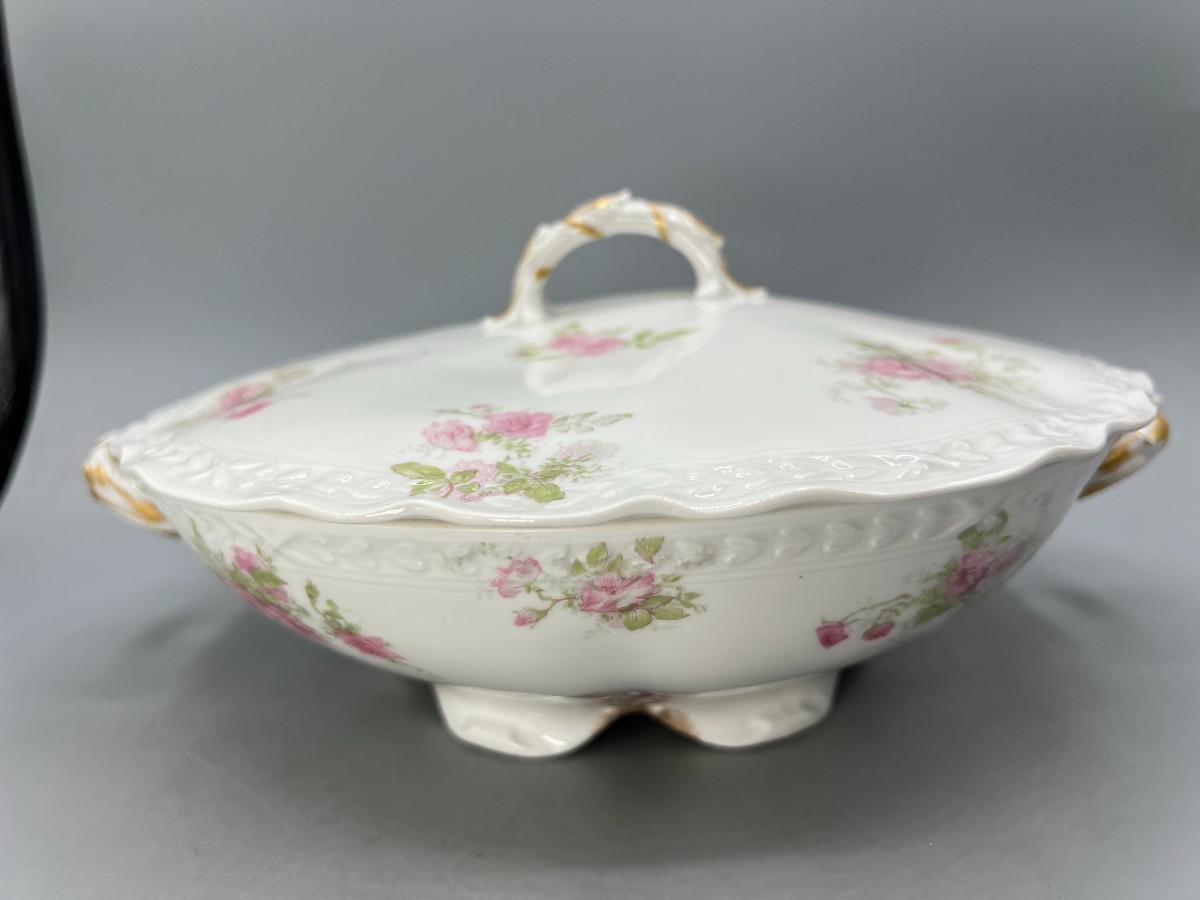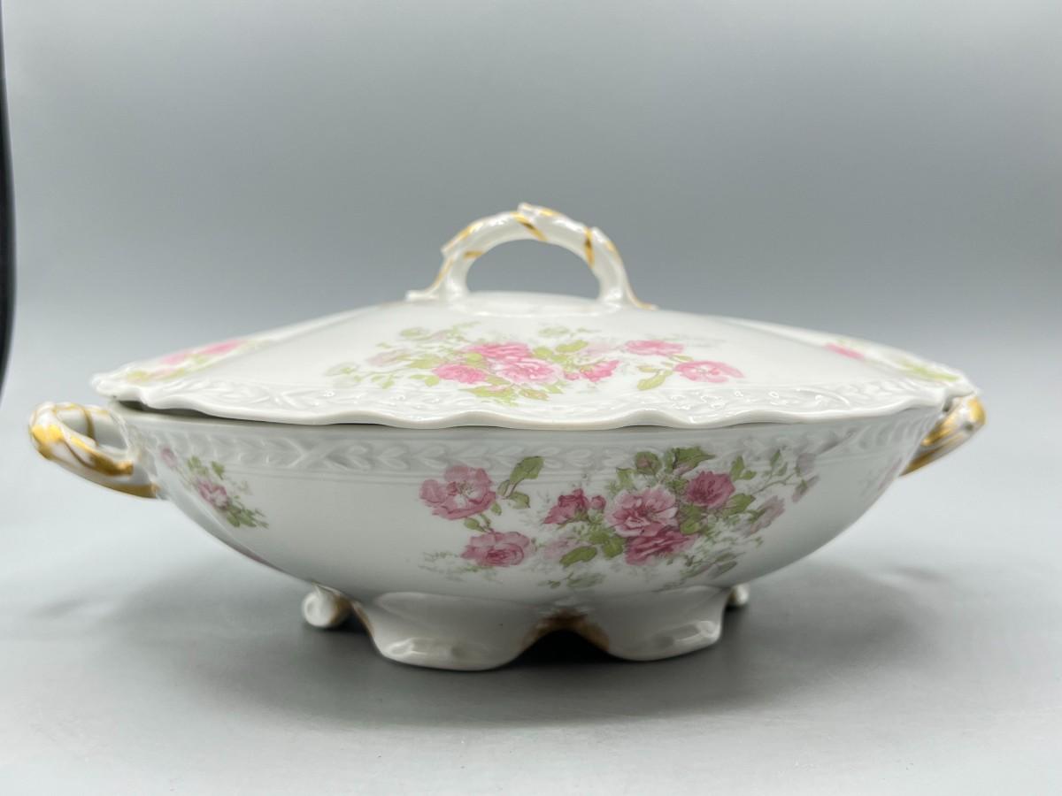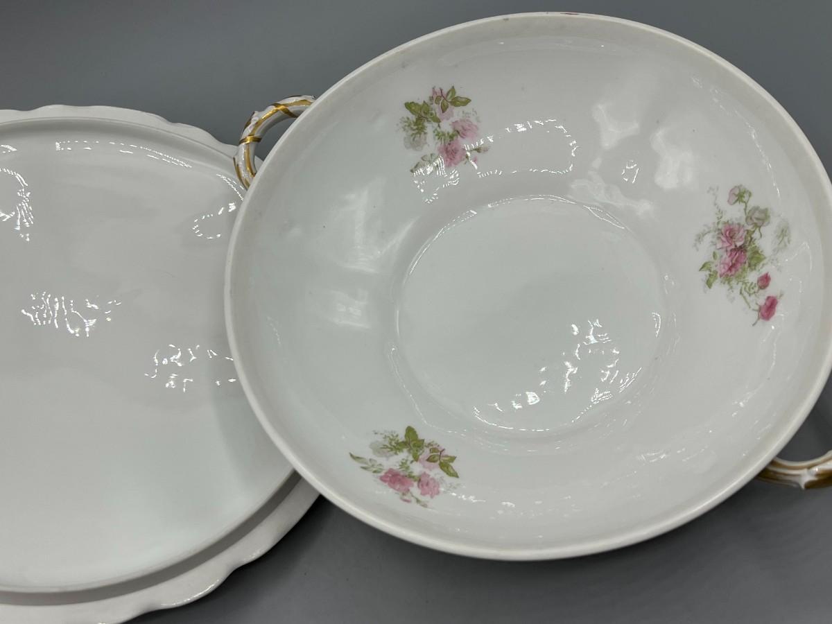 Antique Vintage Limoges France Pink Rose Double Handled Lidded Casserole Serving Dish