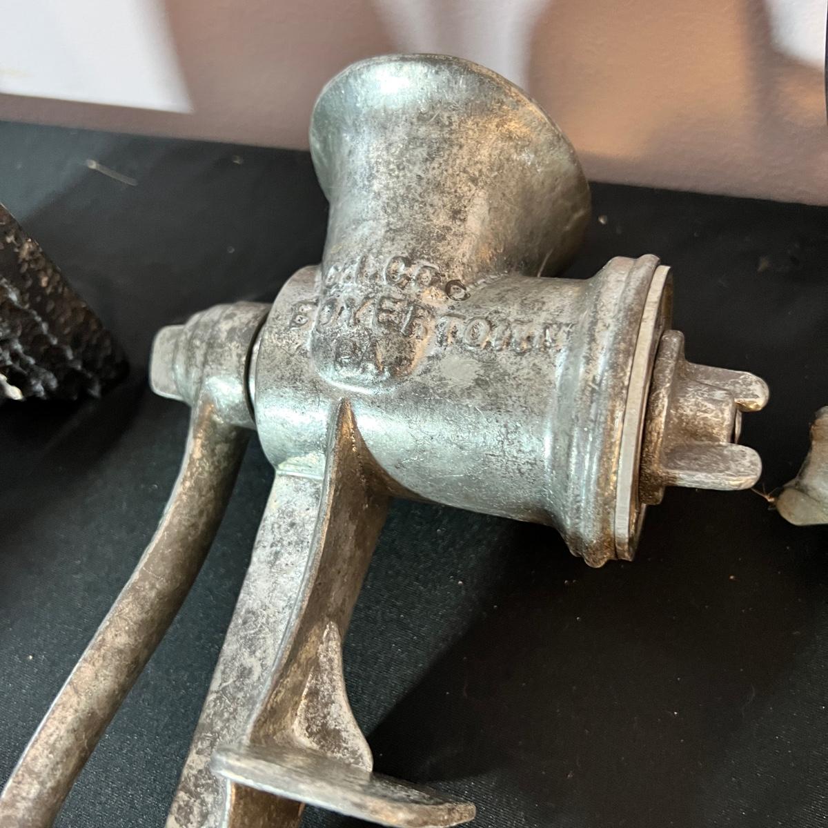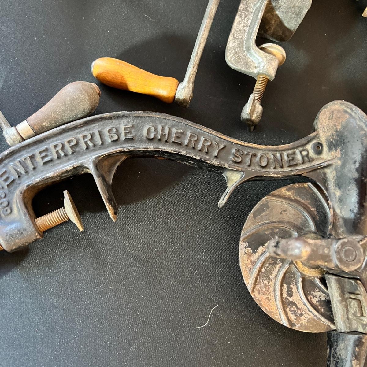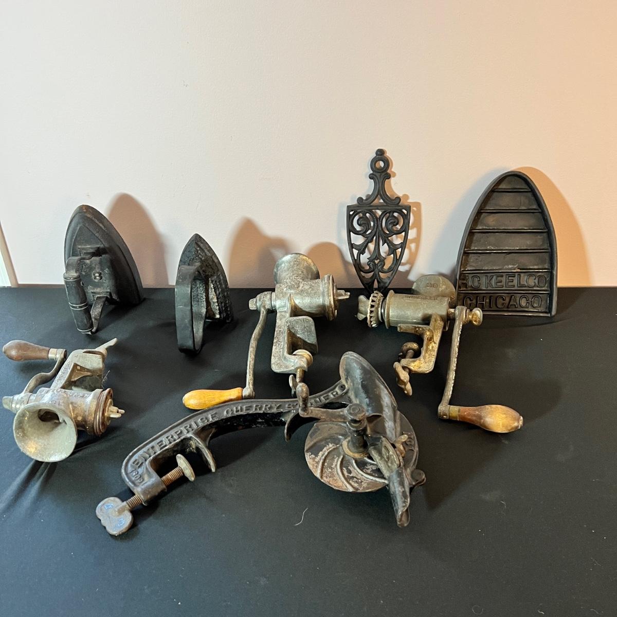Enterprise Mfg. Co. Phila. USA Cherry Stoner Pitter. Universal, Keyston and Boyertown meat grinders. HC Keel Co. Chicago iron trivet, one ornate iron trivet, 2 "sad" cast irons. Great collection! NOTE: PICK UP ONLY IN DUNKIRK MD.
