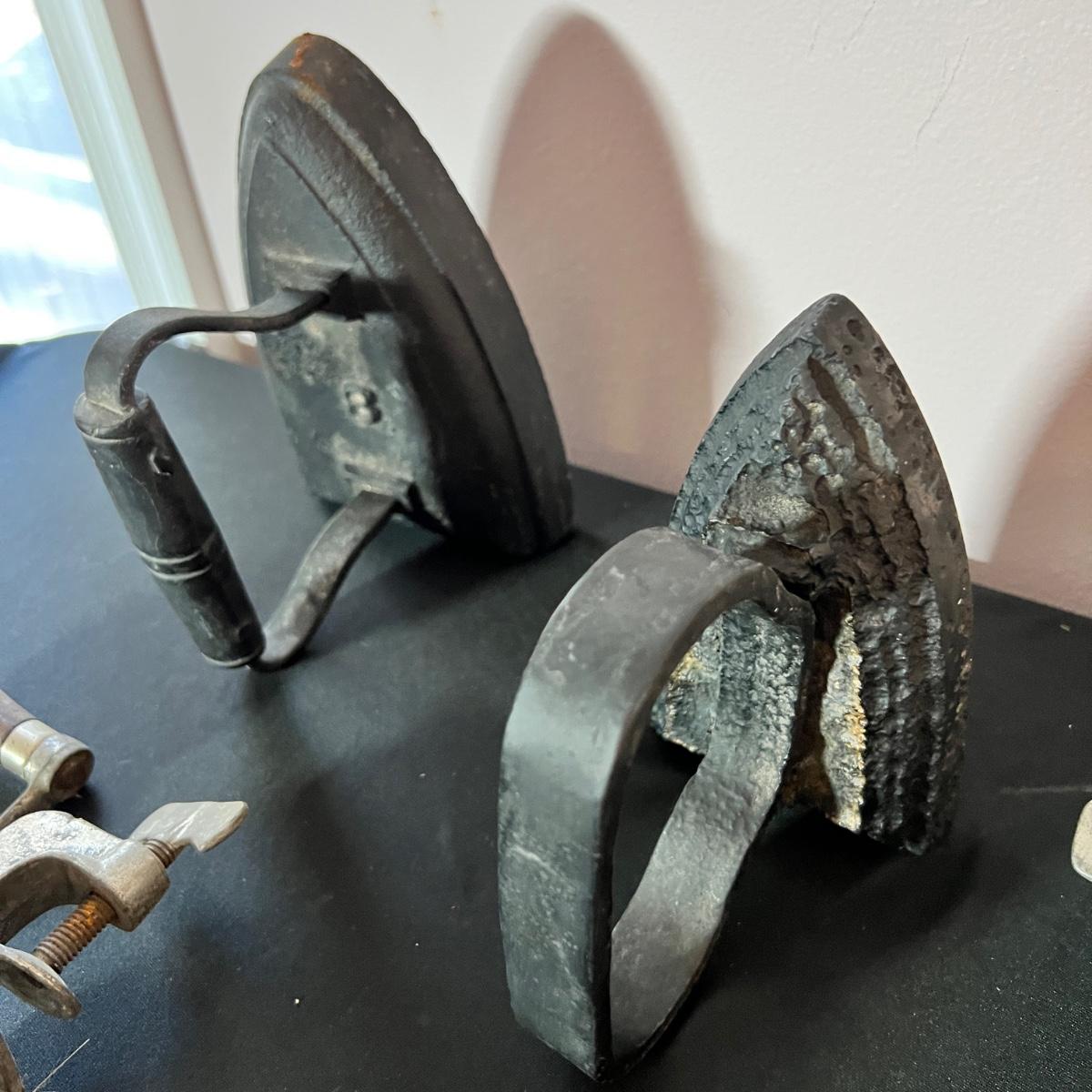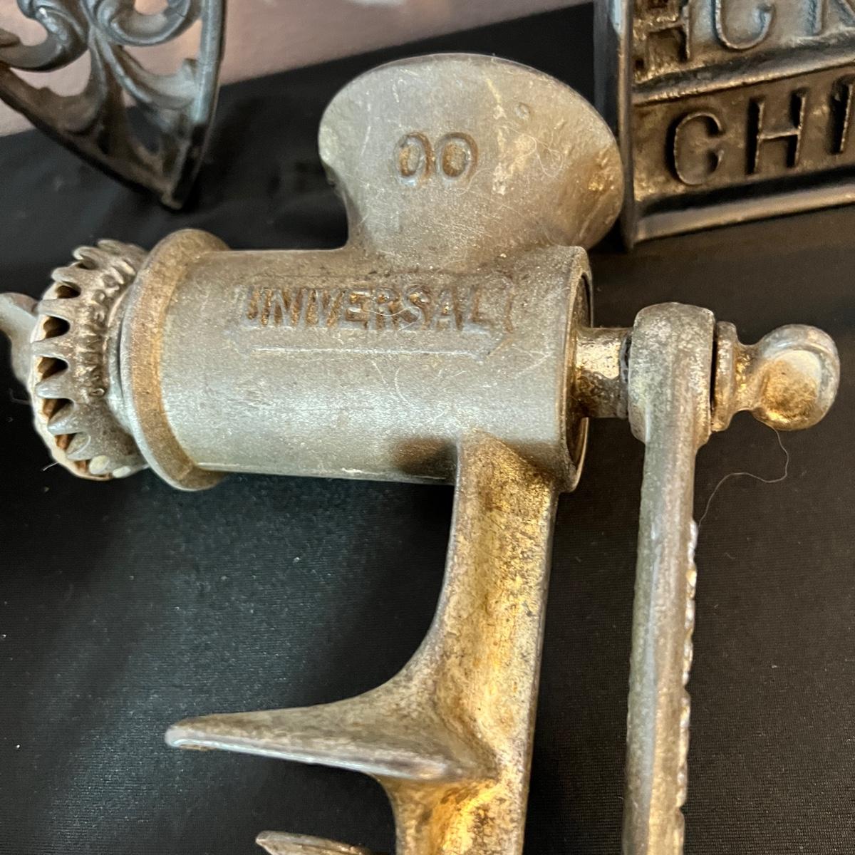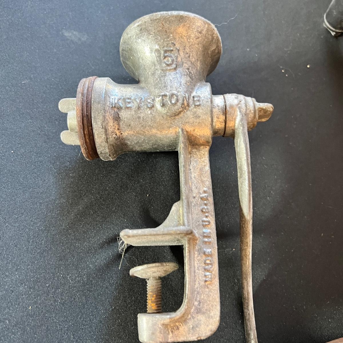 Enterprise Mfg. Co. Phila. USA Cherry Stoner Pitter. Universal, Keyston and Boyertown meat grinders. HC Keel Co. Chicago iron trivet, one ornate iron trivet, 2 "sad" cast irons. Great collection! NOTE: PICK UP ONLY IN DUNKIRK MD.