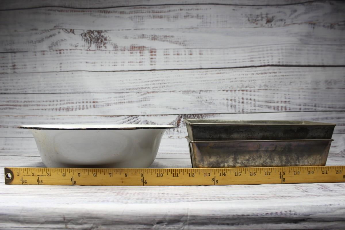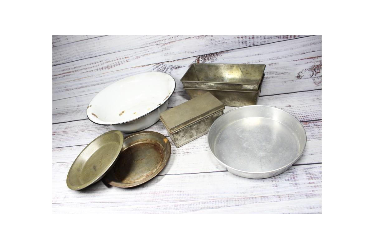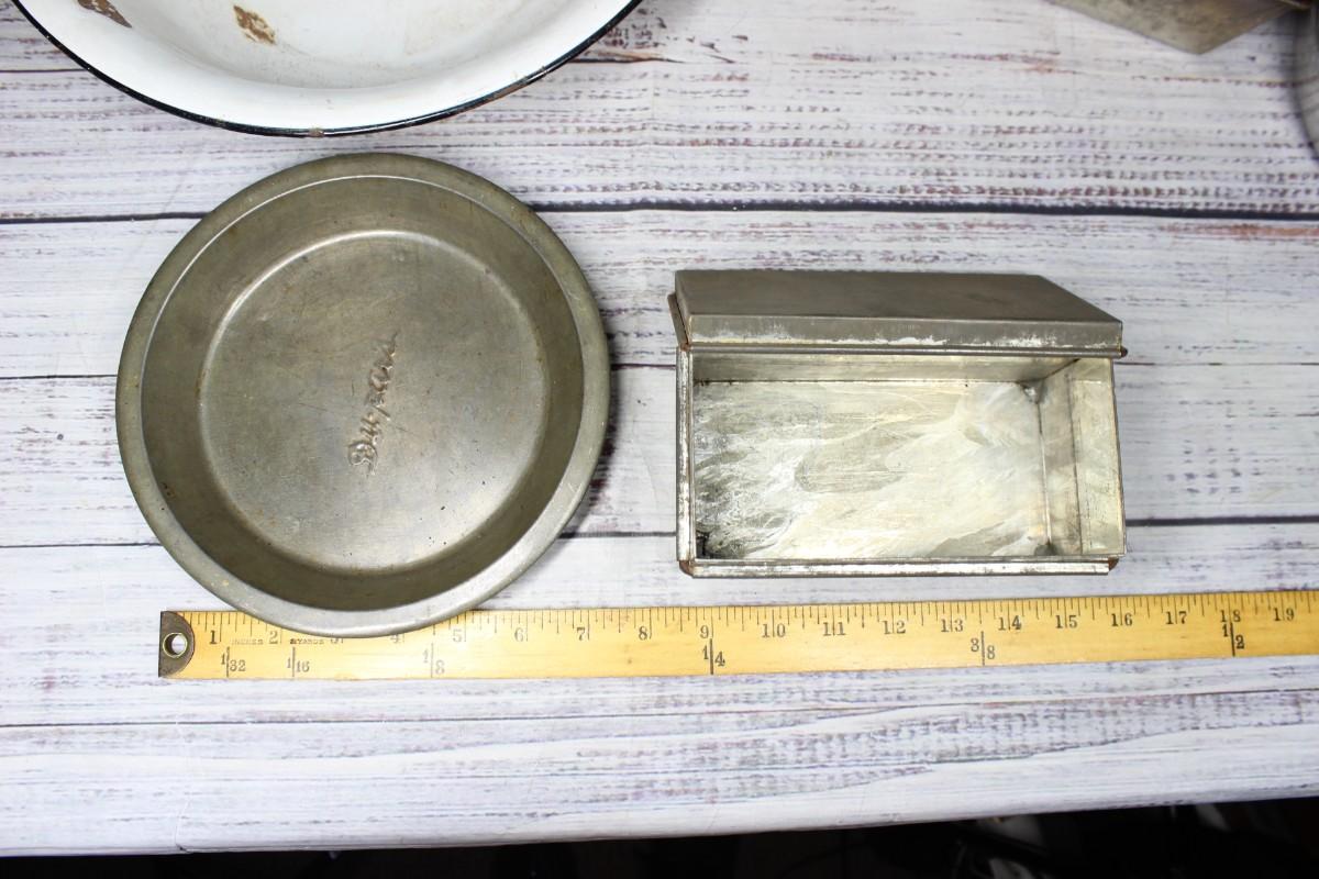 Antique Vintage Lot of Metal Tin Kitchenware Bakeware, there is some significant wear on the pieces, but there are no dents or chips. Check pictures for more details and for sizing.