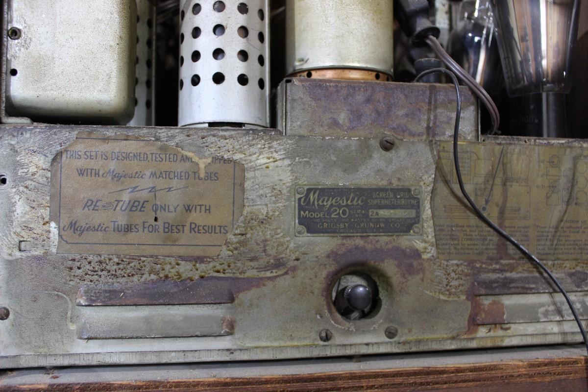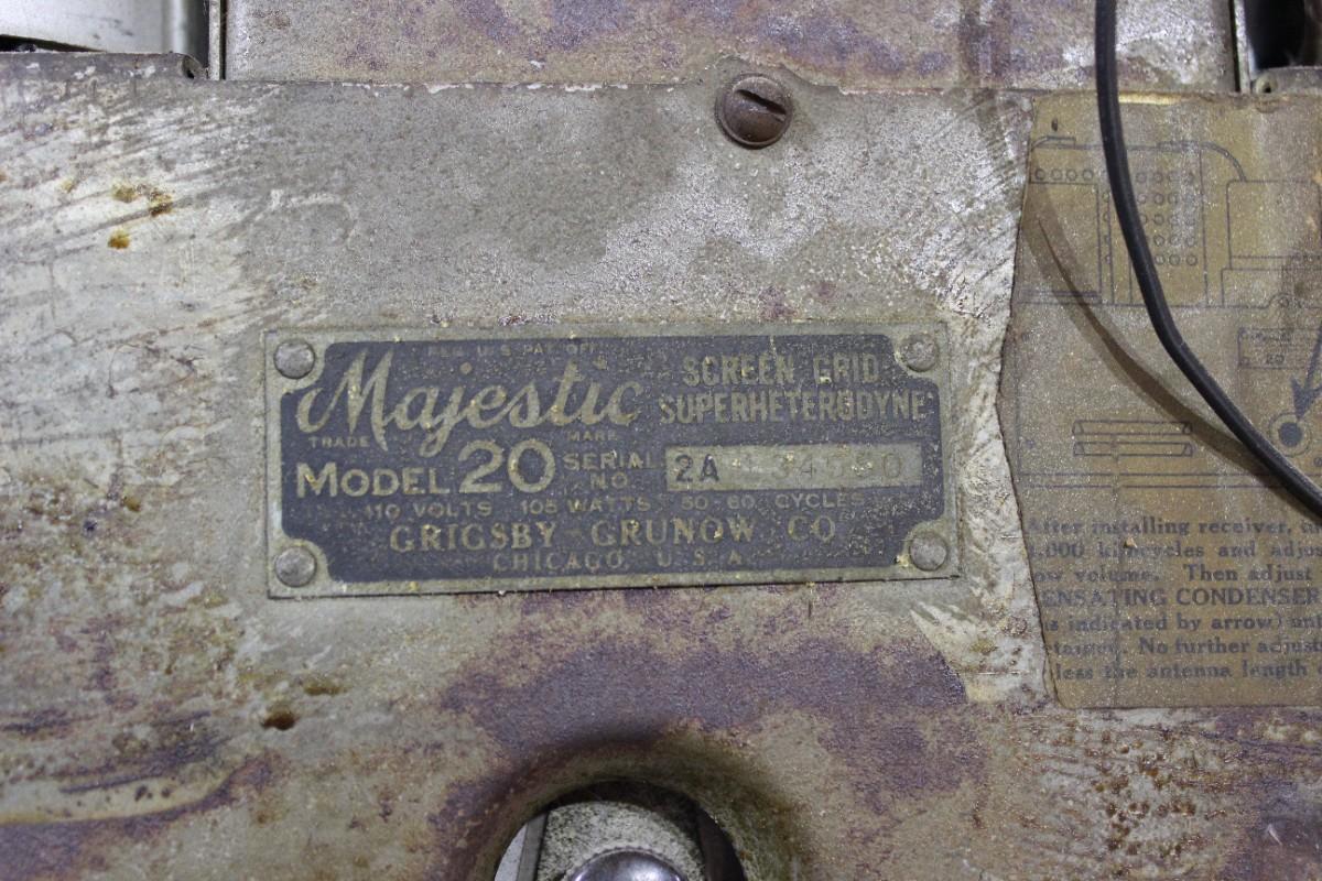 Antique Vintage Majestic Model 20 Grandfather Clock Tube Radio. In good vintage condition, there is a cracked piece of wood at the top left finial, piece stays but could use a little glue to hold in place. Check pictures for more details and for sizing, has not been tested.