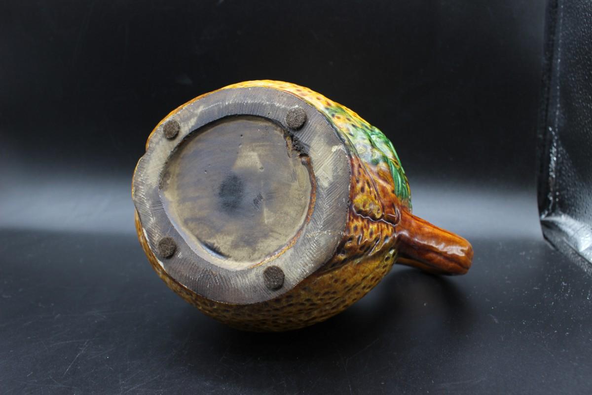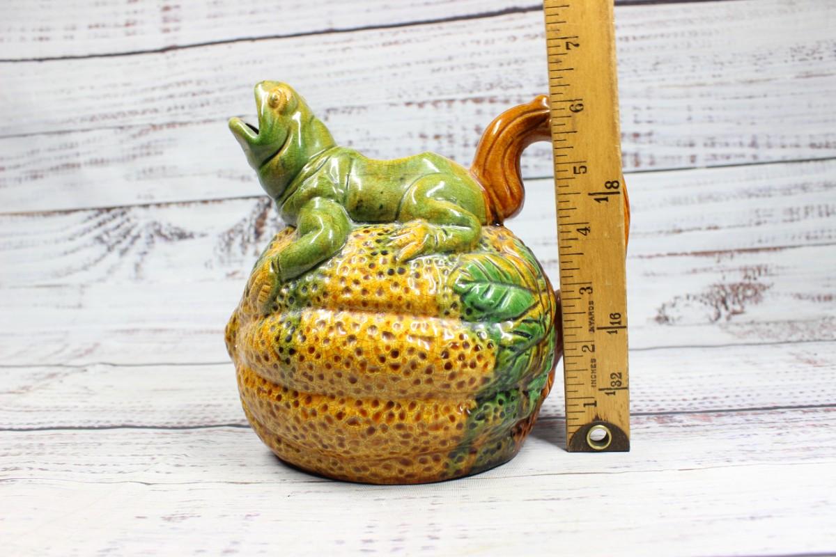 Antique Vintage Majolica Frog on Melon Decorative Water Pitcher, there are no significant cracks or chips to the piece and is in good vintage condition. The colors on the piece is still vibrant, check pictures for more details and for sizing.