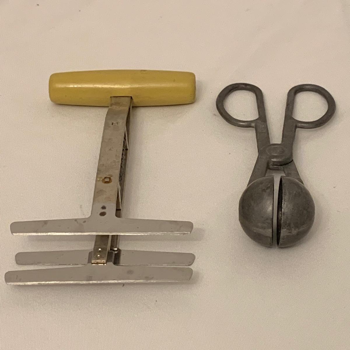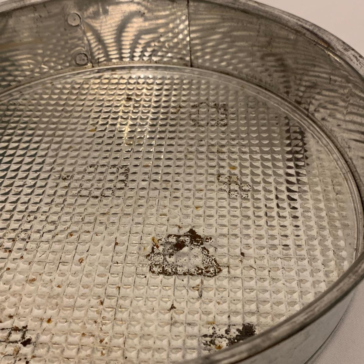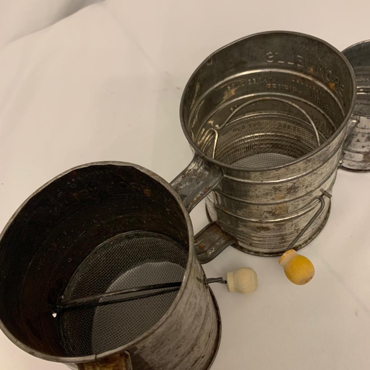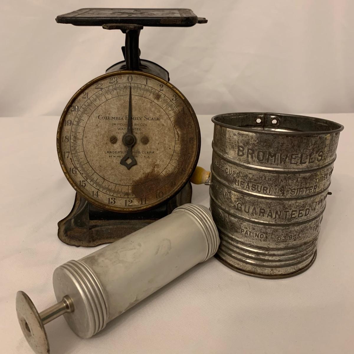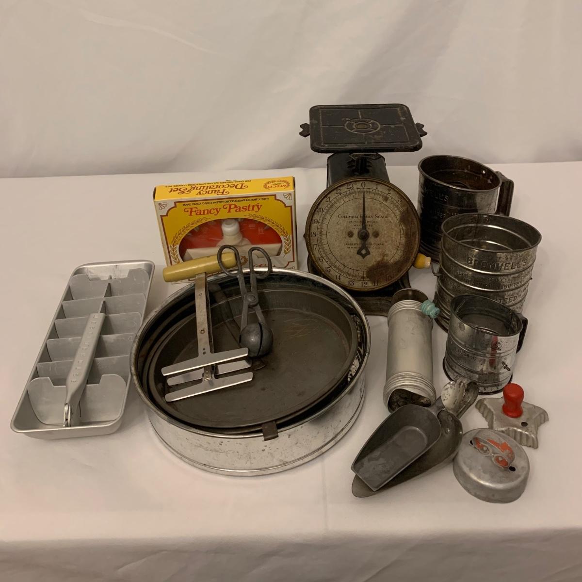 Fun collection of antique and vintage metal kitchen accessories. Includes an antique Columbia Family Scale as well as vintage Bromwell’s measuring sifters, cake pans, cookie press, ice cube tray, and more. The scale measures 8.5” tall. It is dusty and stained, but still functions. The springform pan is 10.25”D. The Fancy Pastry Decorating Set appears to be unused. See photos for conditions of all items. Shipping available.
