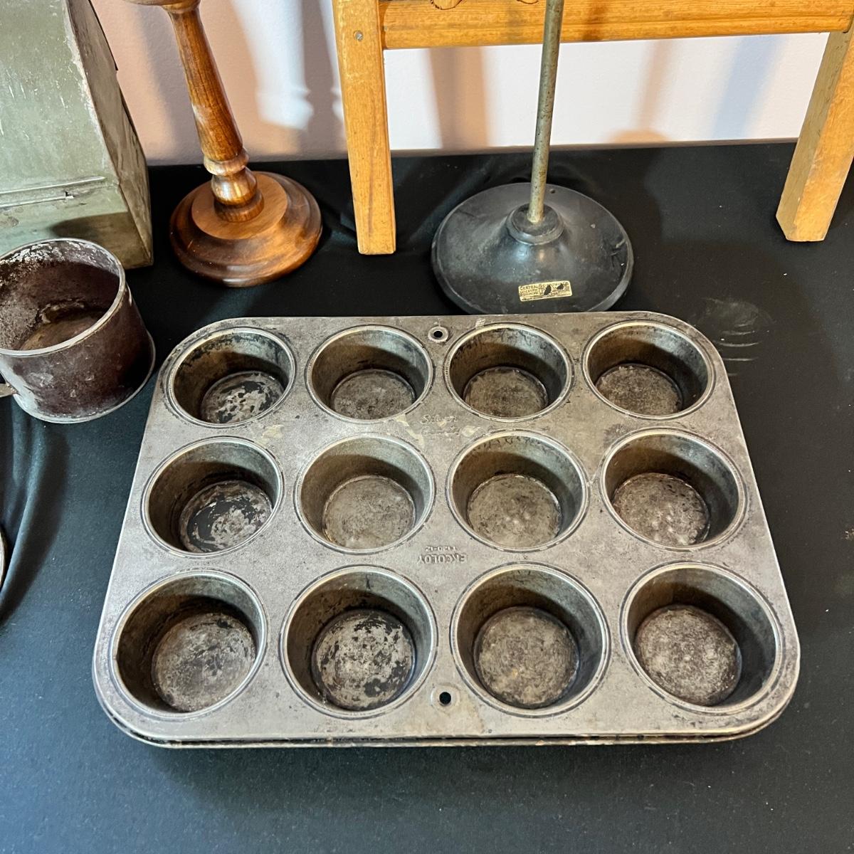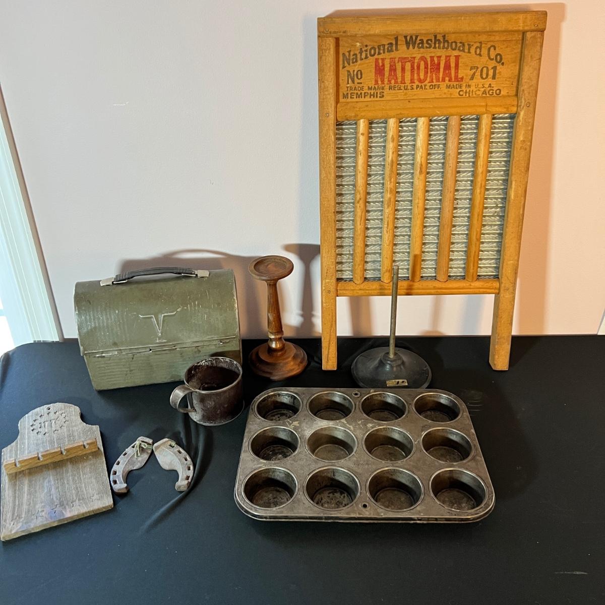 Antique Vintage Mixed Primitives Lot Washboard Lunchbox Muffin Pan +++
