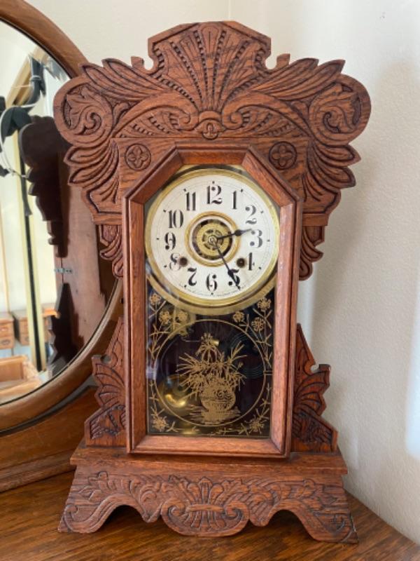 Antique Vintage Ornate Wood Mantle Clock New Haven Clock Co. YD#24-10017