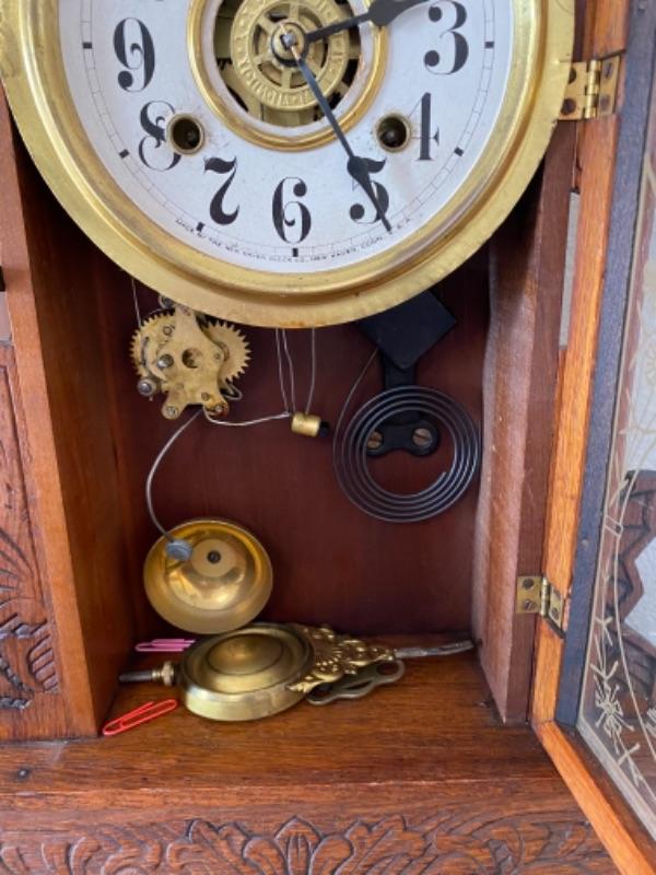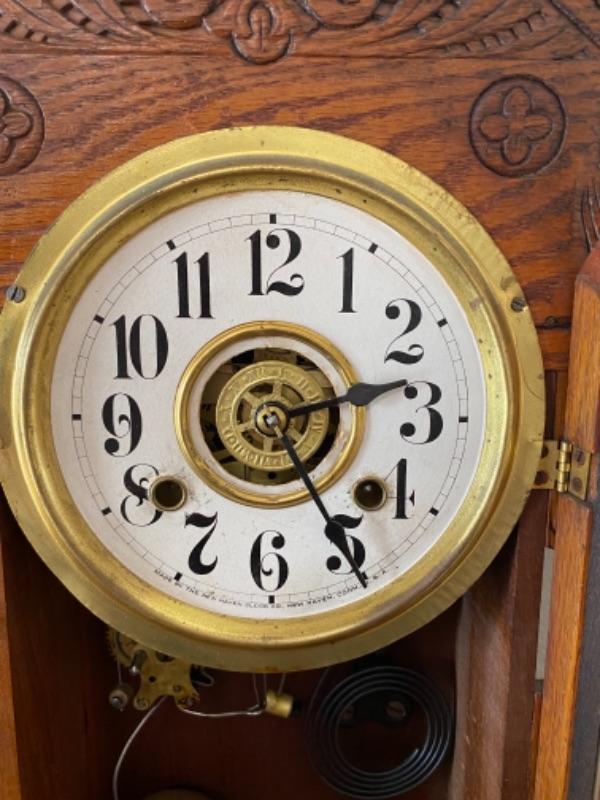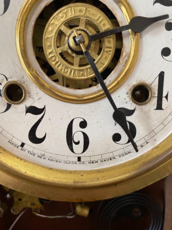 Beautiful antique carved wood clock from New Haven Clock Company. Currently not running, looks like it needs some repair. Does have key included. Possibly an 8 day alarm clock from looking online.
