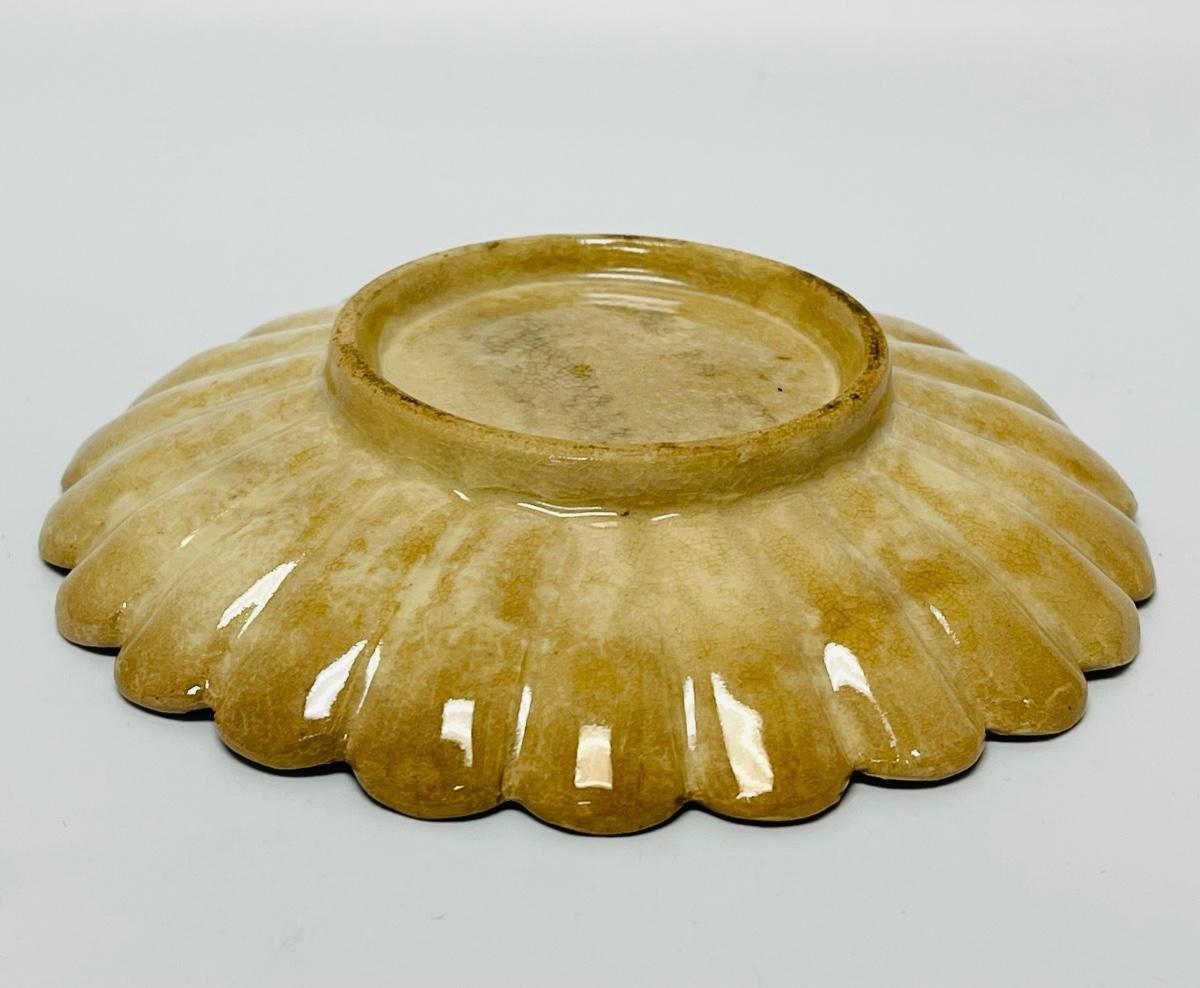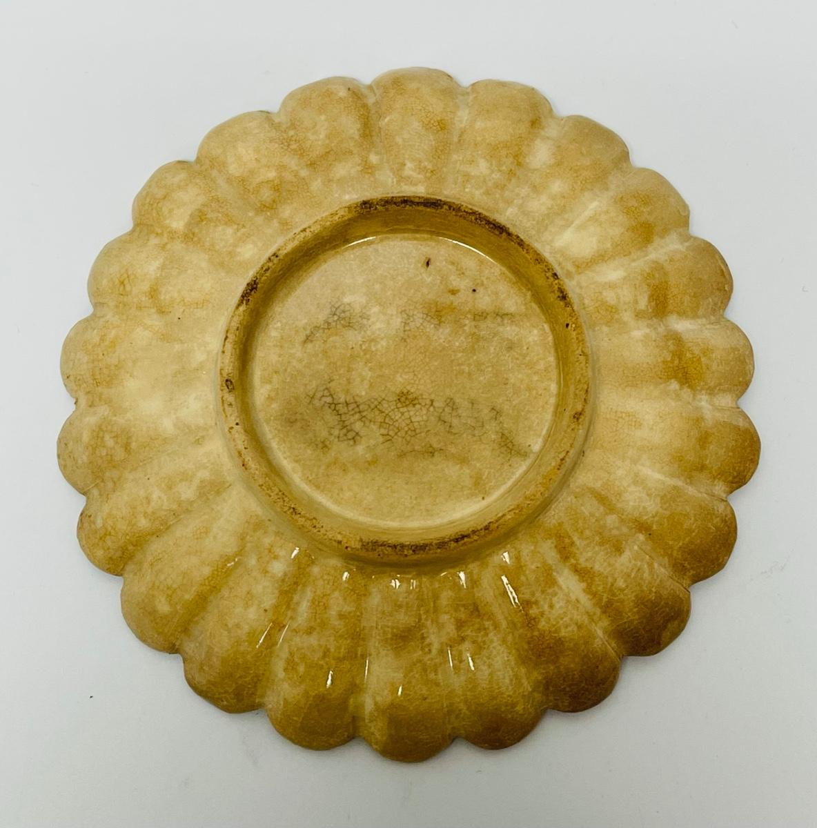 Heavily decorated small plate. Scalloped edge with gold leaf details. In good condition, without chips or cracks. Shows age through crazing. Measures approx 5" across.