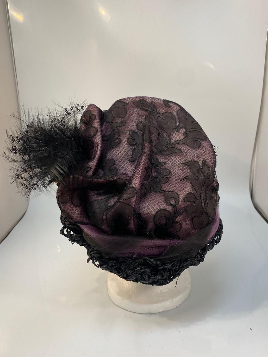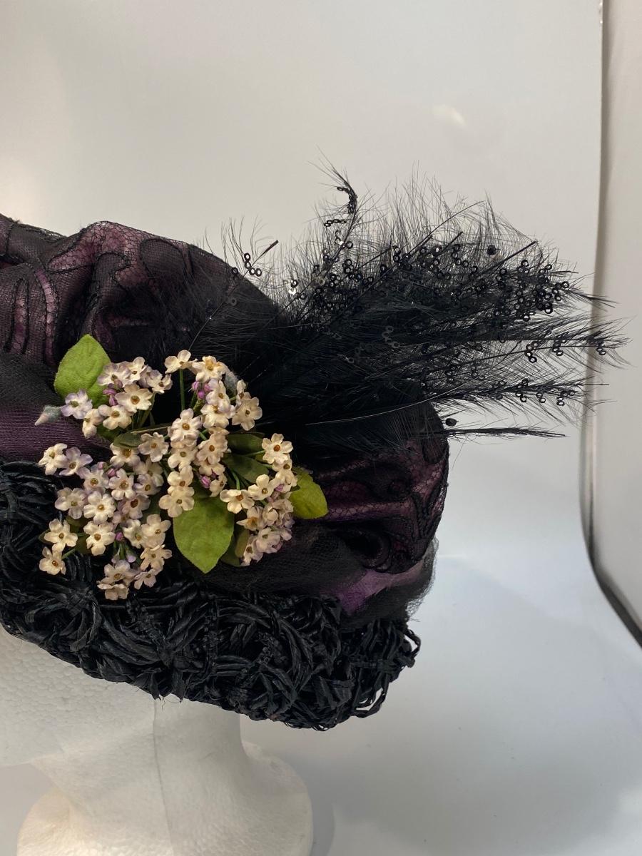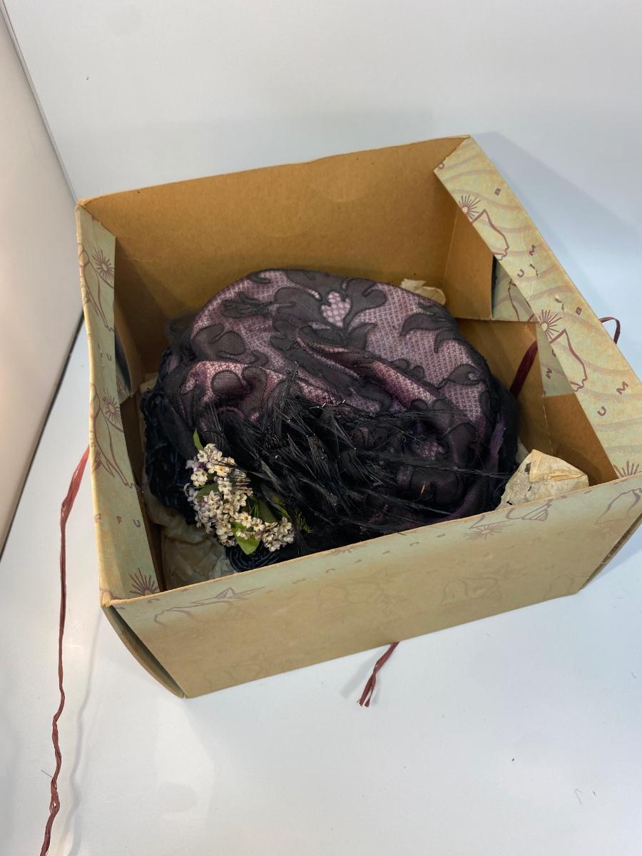 Antique Vintage Plum Purple & Black Feather & Flower Adorn Hat with Box. Beautiful black lace covered hat with heavy lace trim and feather spray. Small faux white flowers give it a romantic softness. Comes in vintage hat box from Buffums.