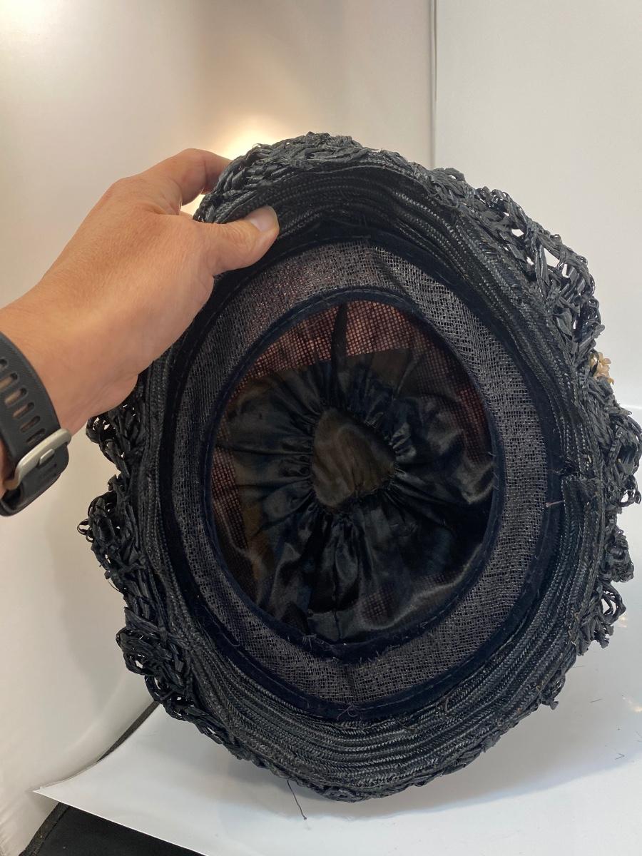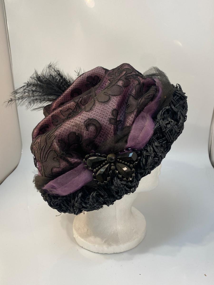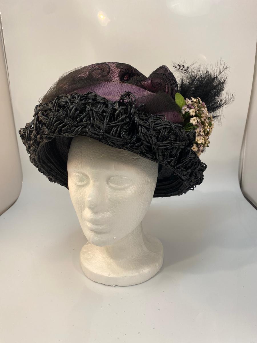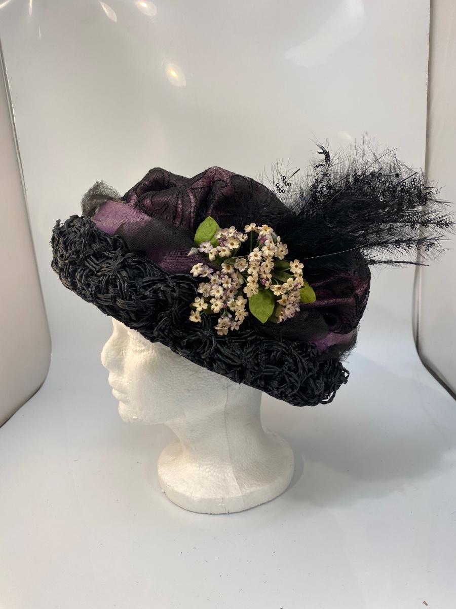Antique Vintage Plum Purple & Black Feather & Flower Adorn Hat with Box. Beautiful black lace covered hat with heavy lace trim and feather spray. Small faux white flowers give it a romantic softness. Comes in vintage hat box from Buffums.