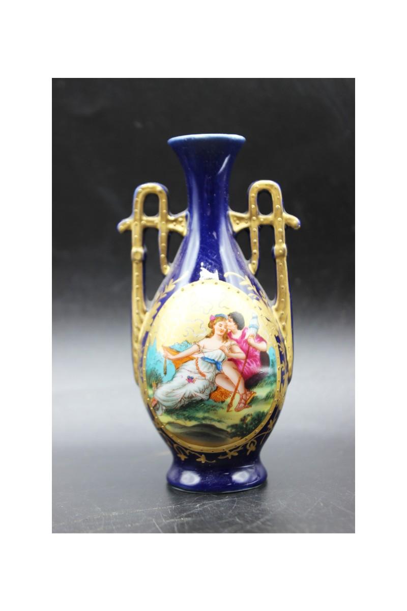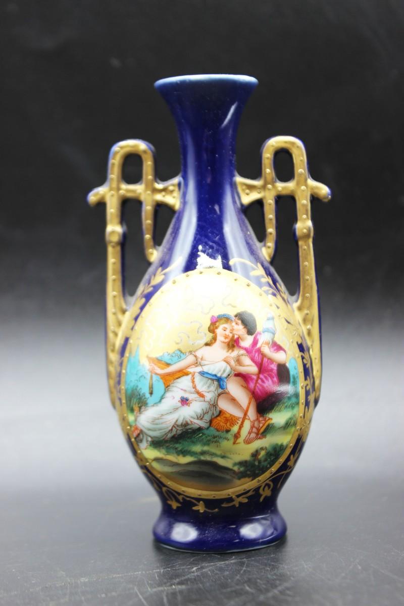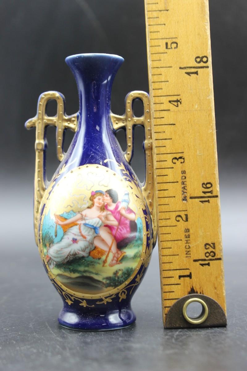 Small antique porcelain vase. Cobalt blue with gold accent and a romantic couple scene on the front. About 5" size. A few marks on the bottom. Good condition.
