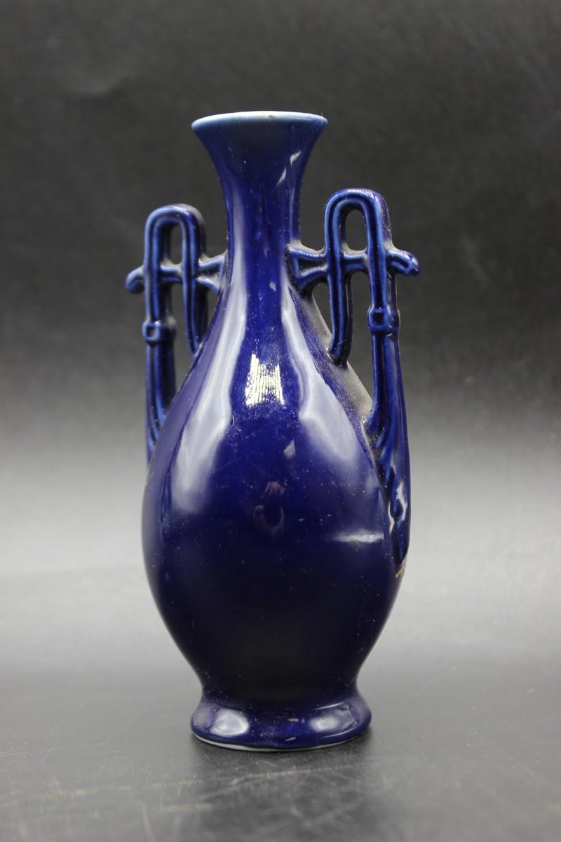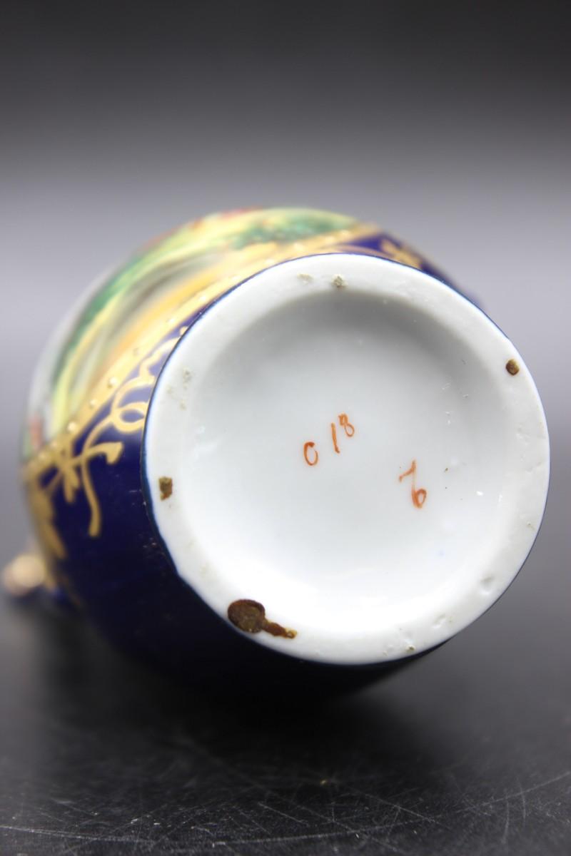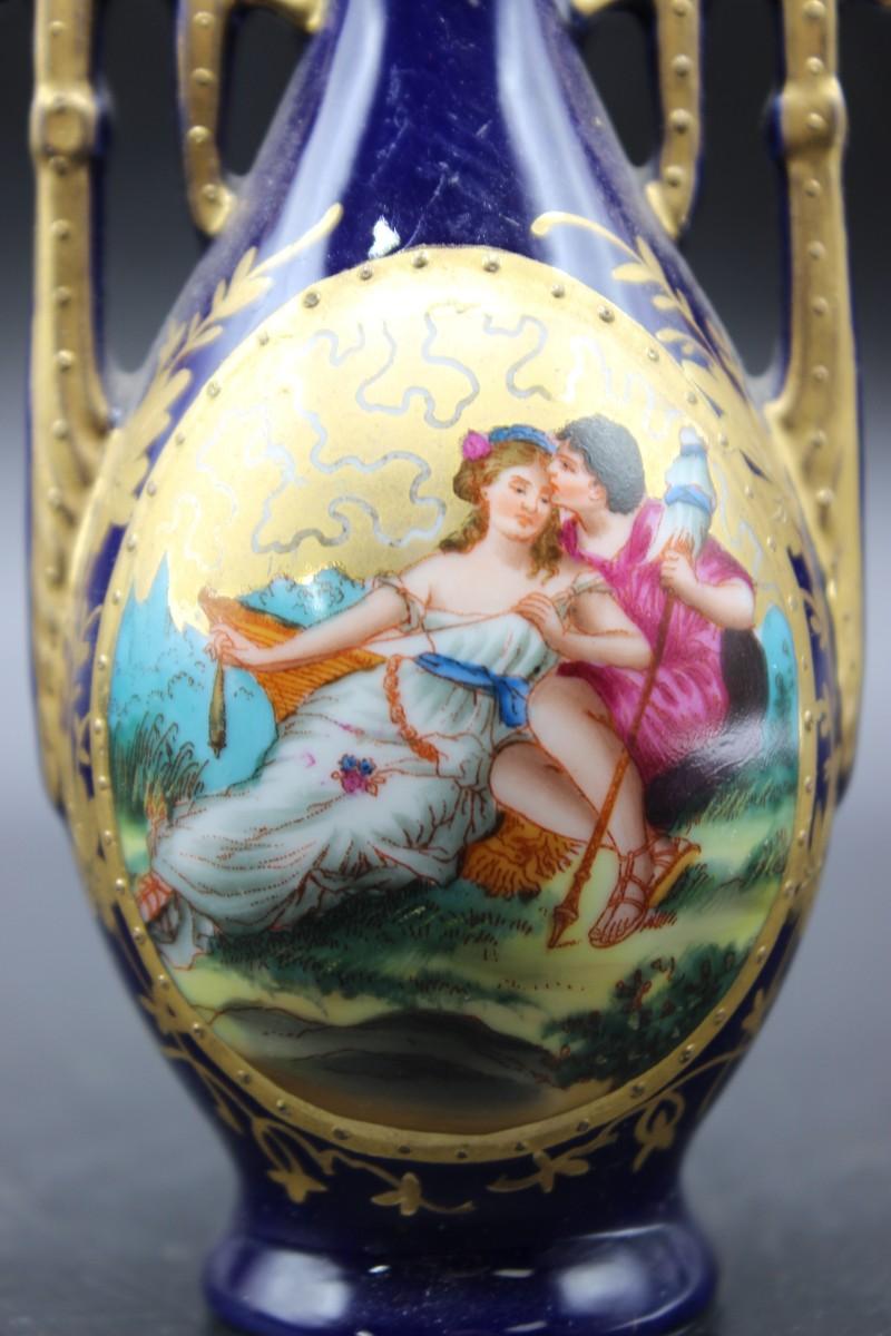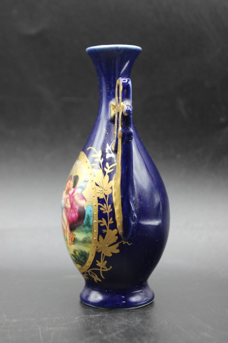 Small antique porcelain vase. Cobalt blue with gold accent and a romantic couple scene on the front. About 5" size. A few marks on the bottom. Good condition.