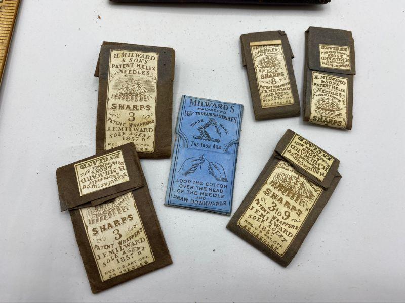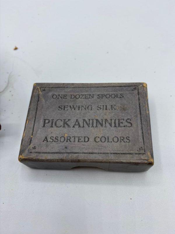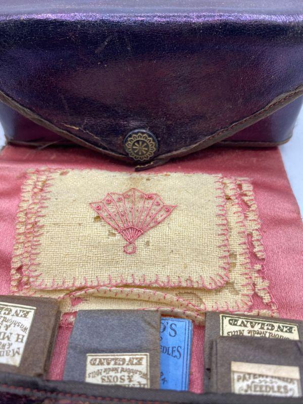 Antique Roll up sewing kit & box of mini spools of thread. Sewing kit holder is pink lined leather held closed with ribbon tie. Has signs of wear and some loose stitches. Comes with a few packages of sewing needles and a Singer souvenir from 1915 Panama Exposition. The small box of mini spools is missing one. Some of the spools are almost empty. Silk thread according to the box. Great gifts for the sewing collector.