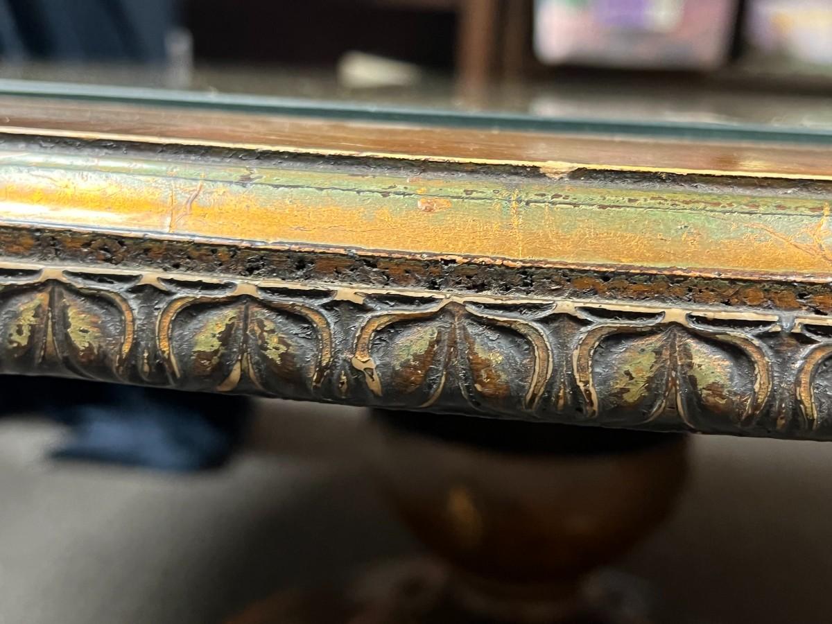 Antique Vintage Round Gold Leaf Under Glass Wood Coffee Table. In good vintage condition, no major scratches to glass. Carved detail edge and pedestal may have had gold leaf also but has worn a bit. About 42" diameter and 17" high.